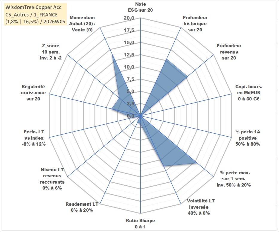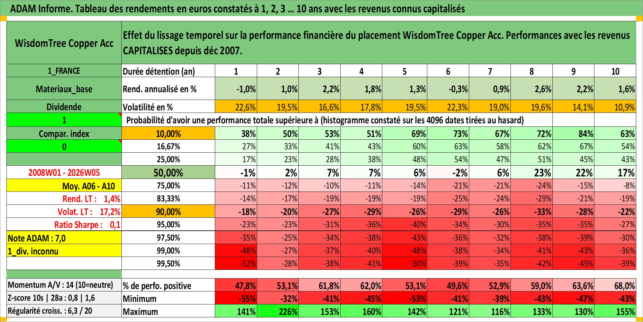 Site dédié aux investisseursPage dédiée sur site financeAnalyse des valorisations hebdomadaires du fonds WisdomTree Copper Acc. Cet actif est cote en USD. Les valorisations sont en contrevaleur EURO et couvrent les semaines 2008W01 a 2026W05. Les revenus de cet actif financier sont pris en compte depuis la semaine 2008W01. La note ESG de cet actif n'est pas connue.