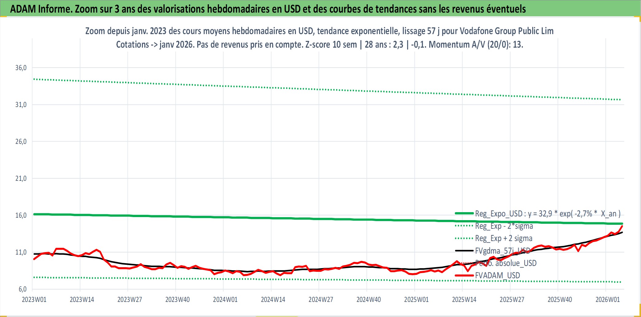 Site dédié aux investisseursPage dédiée sur site financeAnalyse des valorisations hebdomadaires de l'action Vodafone Group Public Limited Company. Cet actif est cote en USD. Les valorisations sont en contrevaleur EURO et couvrent les semaines 1997W01 a 2026W05. Les revenus de cet actif financier sont pris en compte depuis la semaine 1997W24. La note ESG de cet actif n'est pas connue.