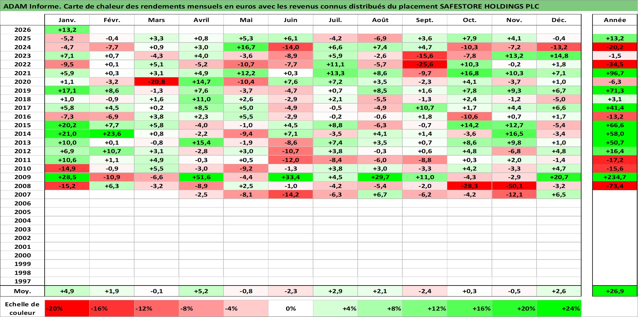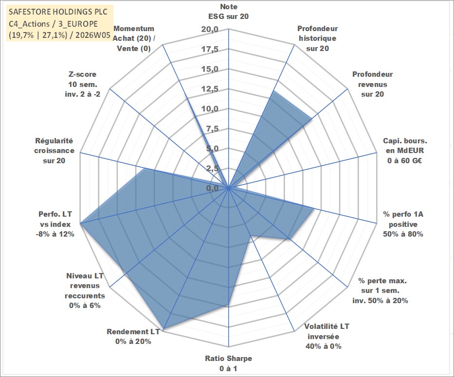 Site dédié aux investisseursPage dédiée sur site financeAnalyse des valorisations hebdomadaires de l'action SAFESTORE HOLDINGS PLC. Cet actif est cote en GBX. Les valorisations sont en contrevaleur EURO et couvrent les semaines 2007W10 a 2026W05. Les revenus de cet actif financier sont pris en compte depuis la semaine 2007W29. La note ESG de cet actif n'est pas connue.