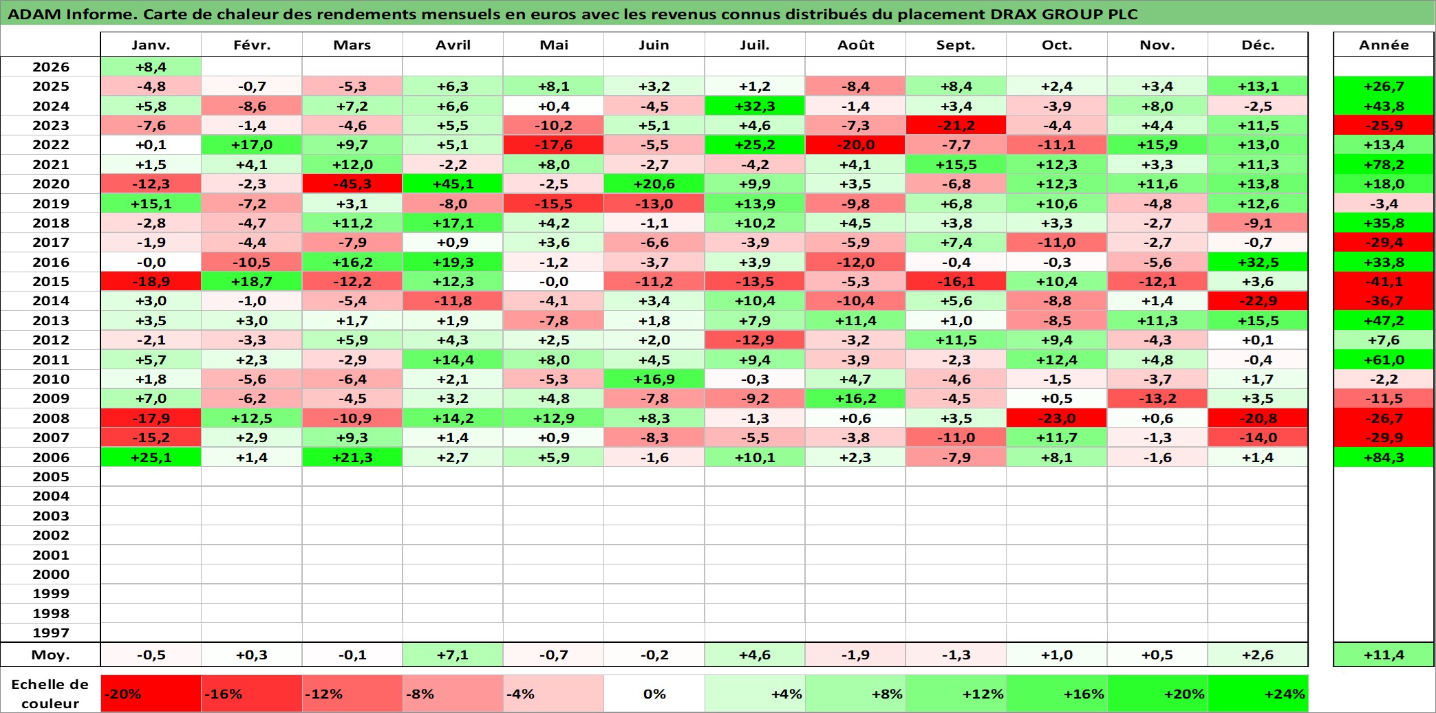 Site dédié aux investisseursPage dédiée sur site financeAnalyse des valorisations hebdomadaires de l'action DRAX GROUP PLC. Cet actif est cote en GBX. Les valorisations sont en contrevaleur EURO et couvrent les semaines 2005W50 a 2026W05. Les revenus de cet actif financier sont pris en compte depuis la semaine 2006W40. La note ESG de cet actif n'est pas connue.