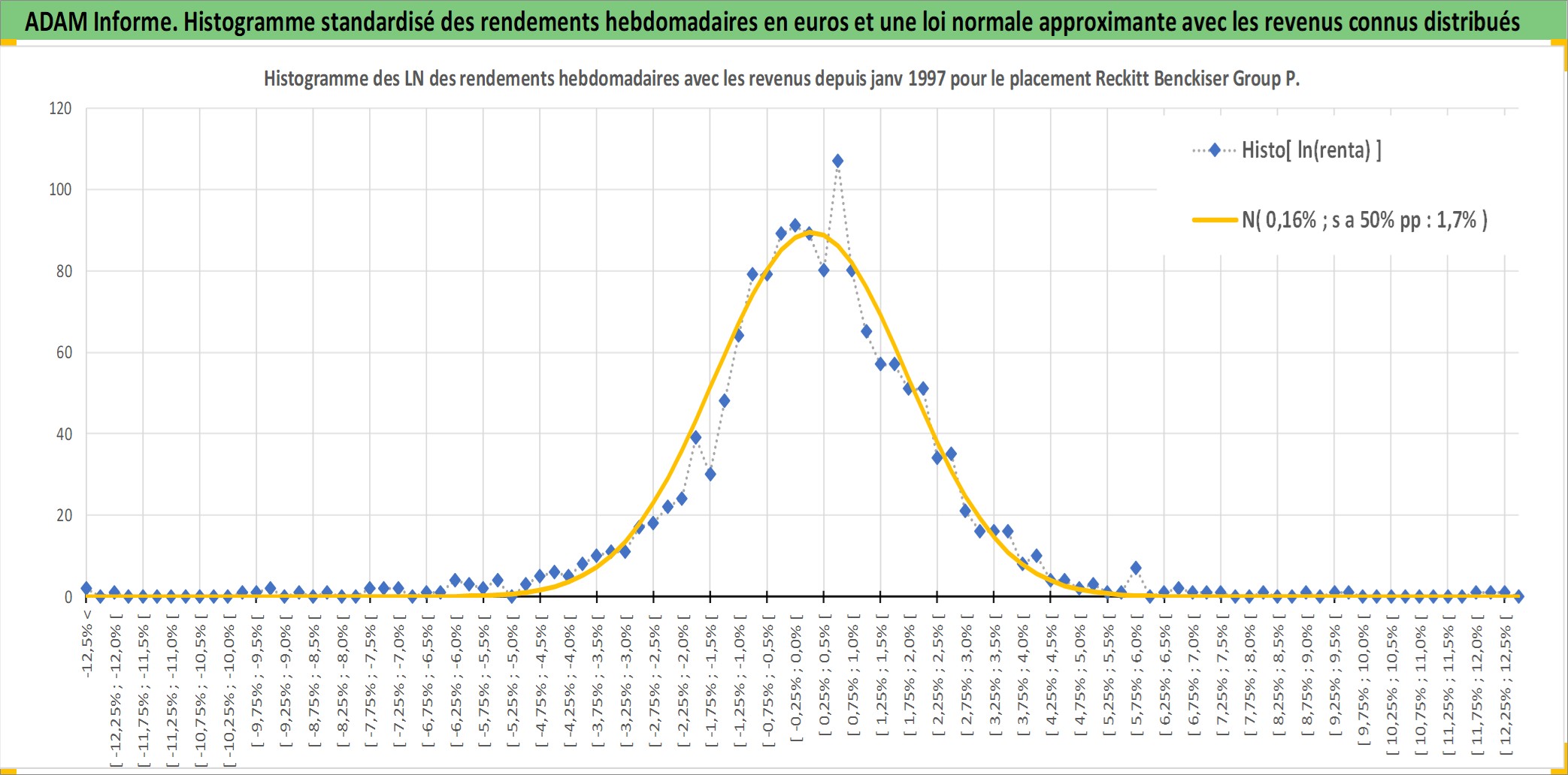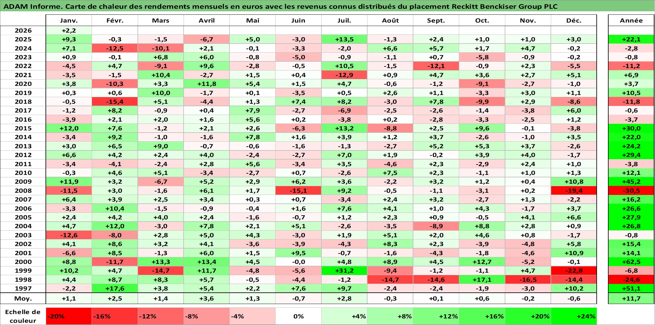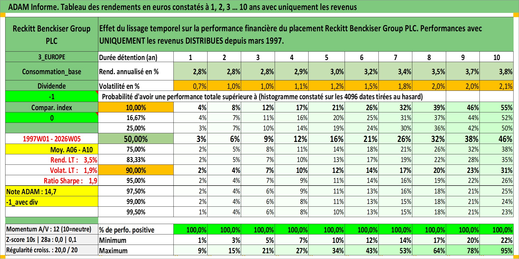 Site dédié aux investisseursPage dédiée sur site financeAnalyse des valorisations hebdomadaires de l'action Reckitt Benckiser Group PLC. Cet actif est cote en GBX. Les valorisations sont en contrevaleur EURO et couvrent les semaines 1997W01 a 2026W05. Les revenus de cet actif financier sont pris en compte depuis la semaine 1997W13. La note globale ESG de cet actif est estimee a 9.0 (apres rebasage entre 0 et 20).