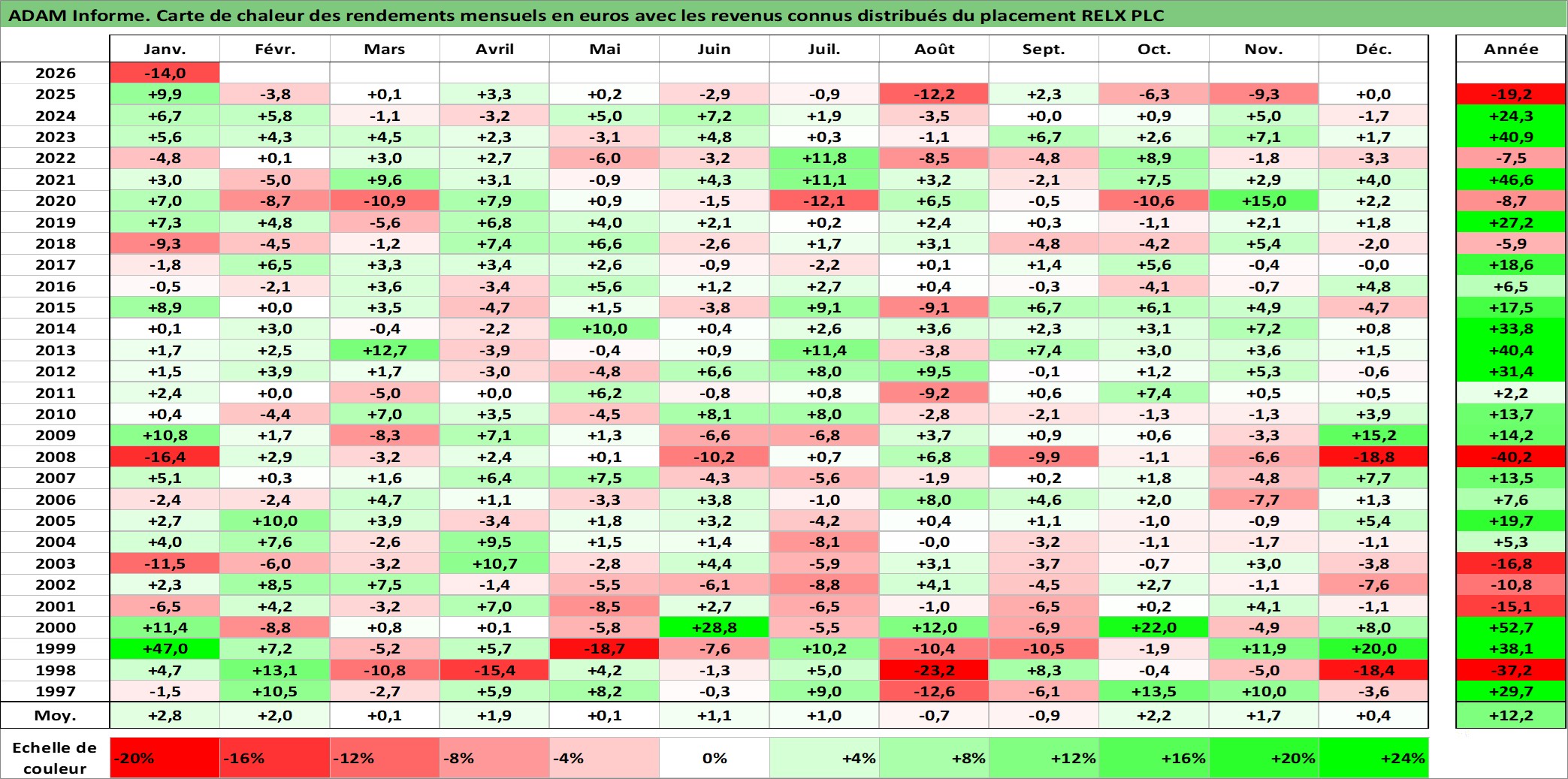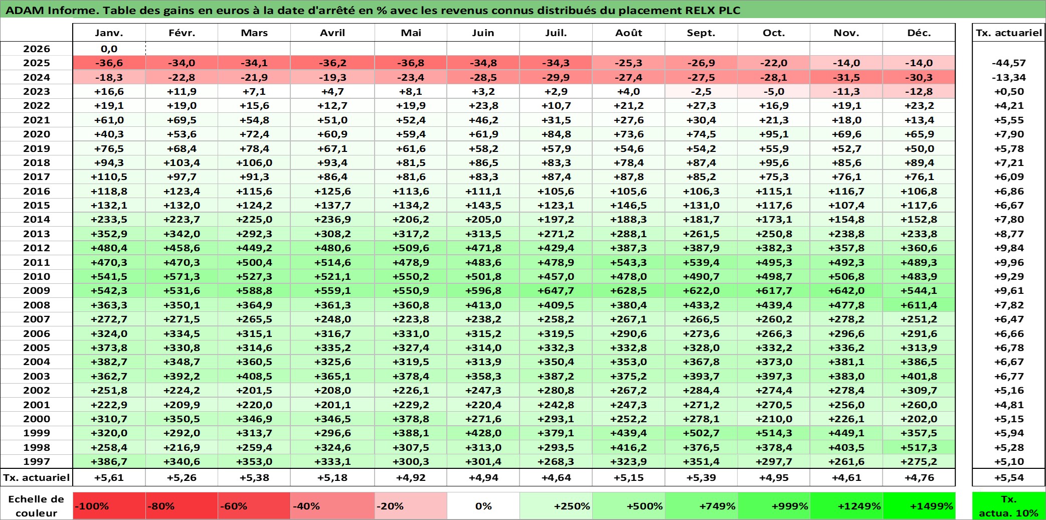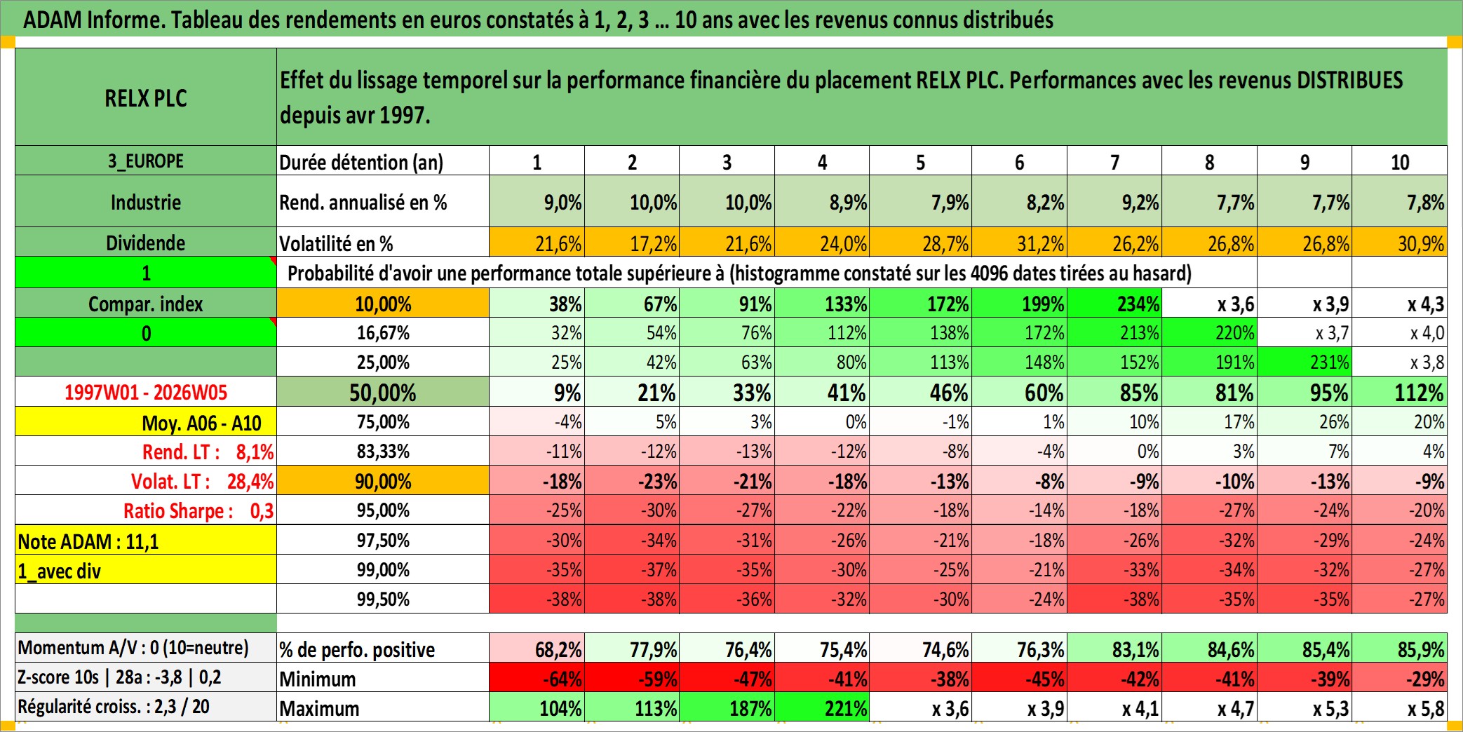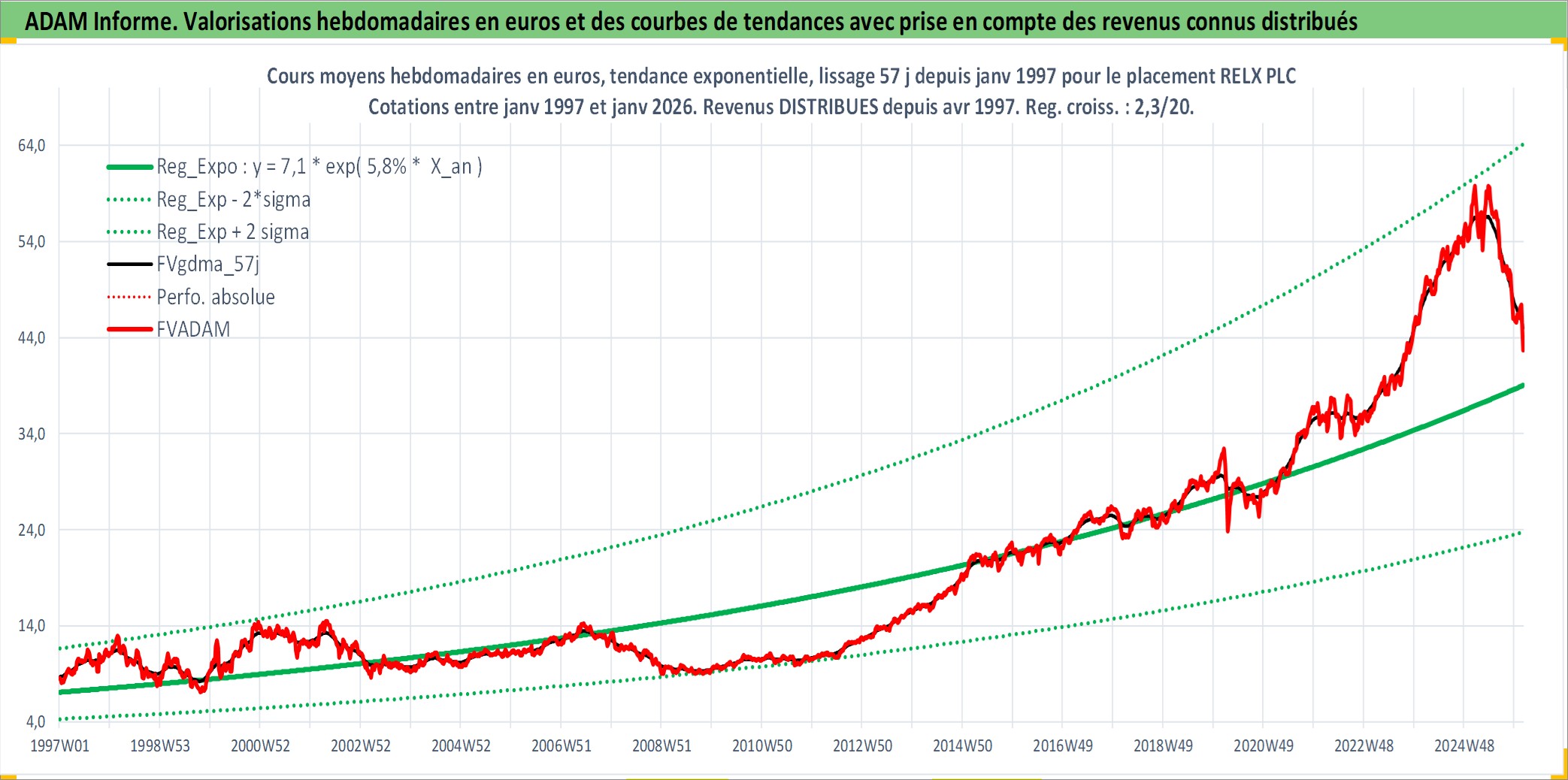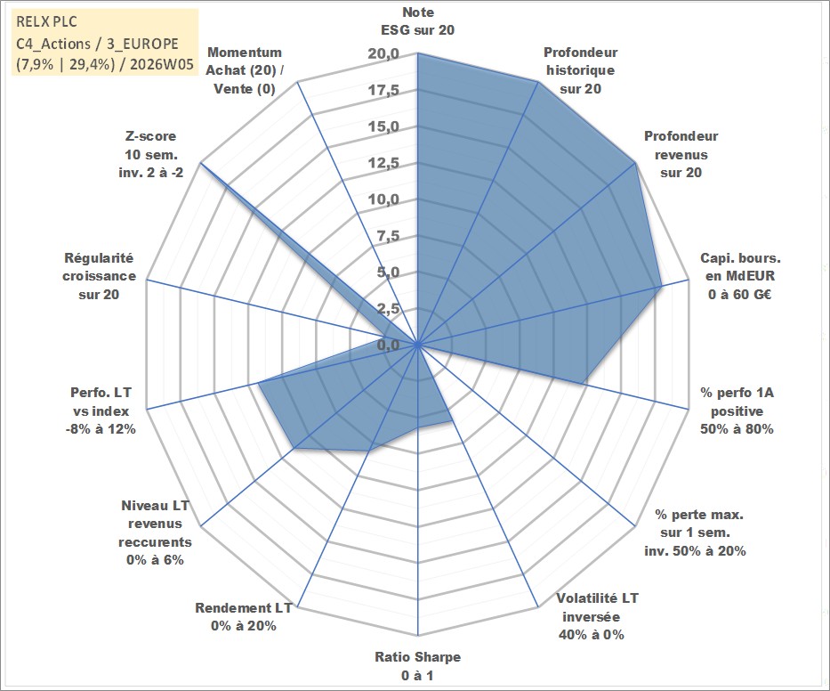 Site dédié aux investisseursPage dédiée sur site financeAnalyse des valorisations hebdomadaires de l'action RELX PLC. Cet actif est cote en GBX. Les valorisations sont en contrevaleur EURO et couvrent les semaines 1997W01 a 2026W05. Les revenus de cet actif financier sont pris en compte depuis la semaine 1997W17. La note globale ESG de cet actif est estimee a 20.0 (apres rebasage entre 0 et 20).