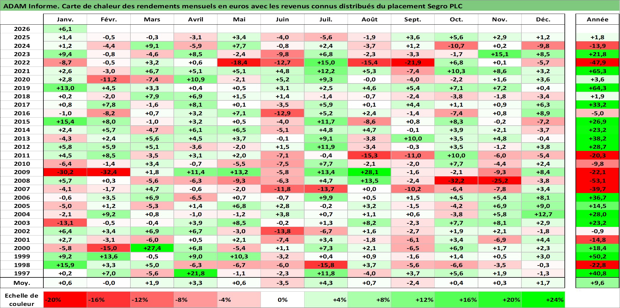 Site dédié aux investisseursPage dédiée sur site financeAnalyse des valorisations hebdomadaires de l'action Segro PLC. Cet actif est cote en GBX. Les valorisations sont en contrevaleur EURO et couvrent les semaines 1997W01 a 2026W05. Les revenus de cet actif financier sont pris en compte depuis la semaine 1997W17. La note globale ESG de cet actif est estimee a 17.0 (apres rebasage entre 0 et 20).