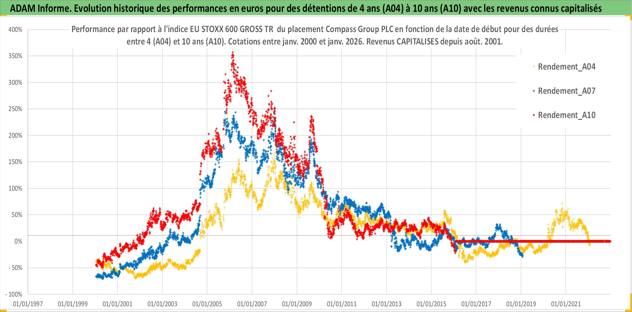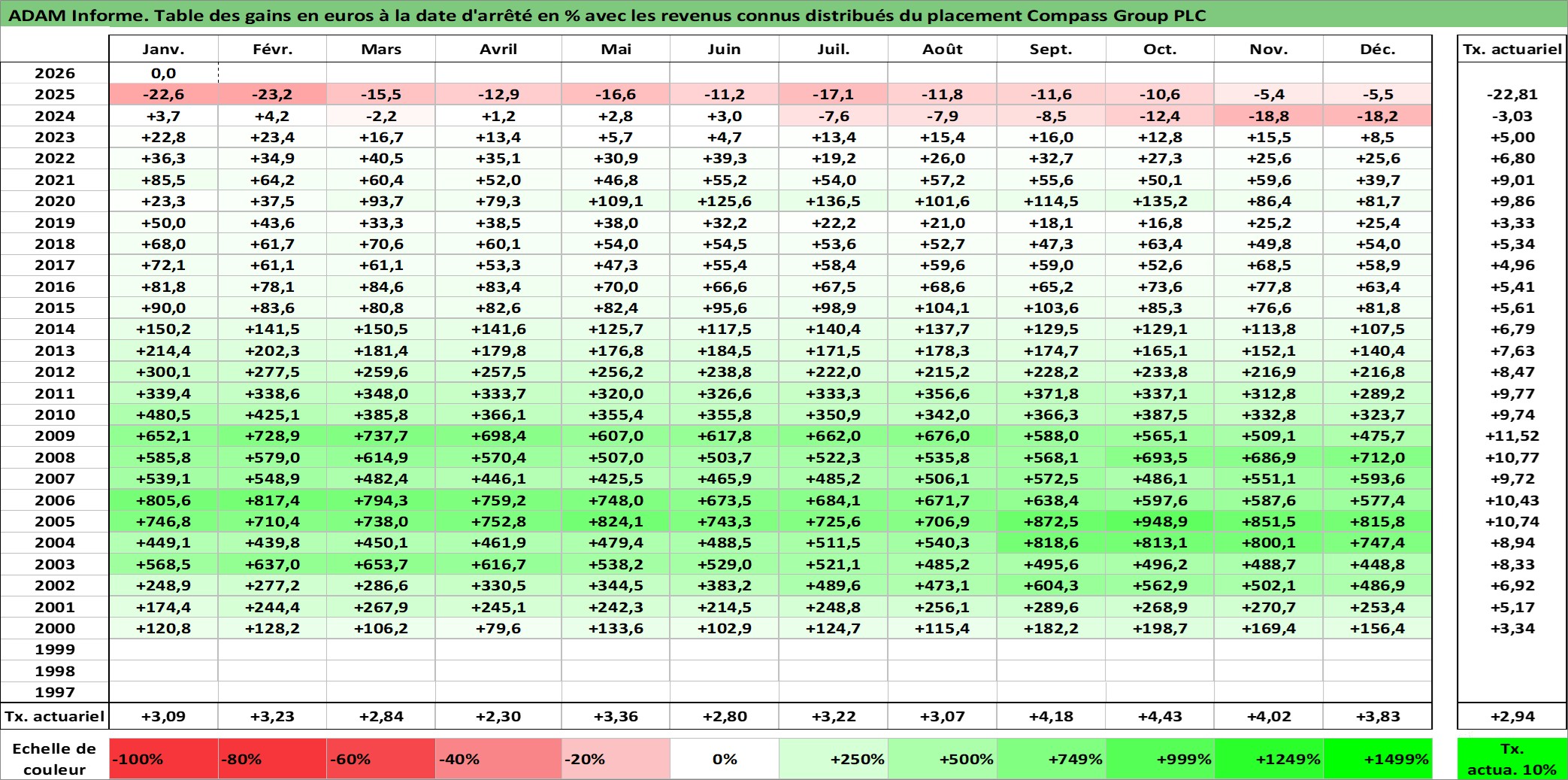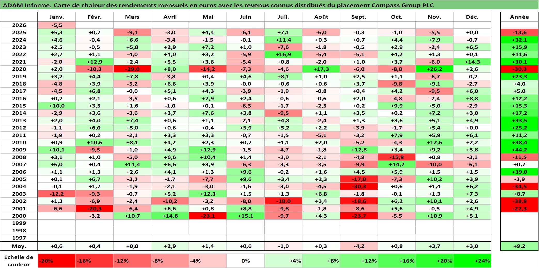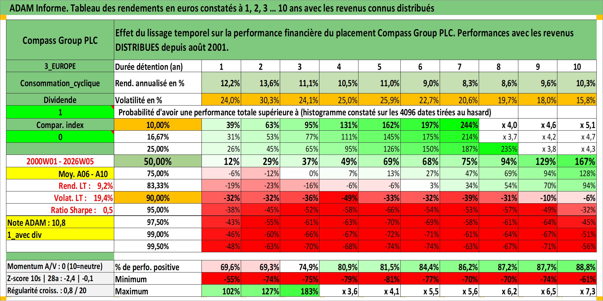 Site dédié aux investisseursPage dédiée sur site financeAnalyse des valorisations hebdomadaires de l'action Compass Group PLC. Cet actif est cote en GBX. Les valorisations sont en contrevaleur EURO et couvrent les semaines 2000W01 a 2026W05. Les revenus de cet actif financier sont pris en compte depuis la semaine 2001W33. La note globale ESG de cet actif est estimee a 11.0 (apres rebasage entre 0 et 20).