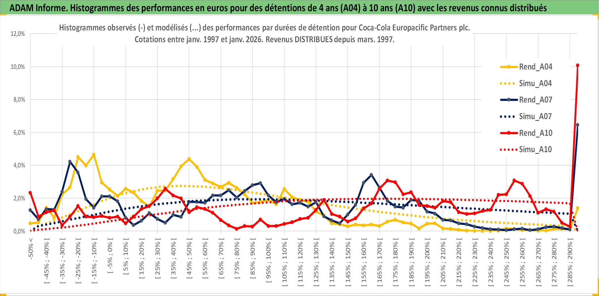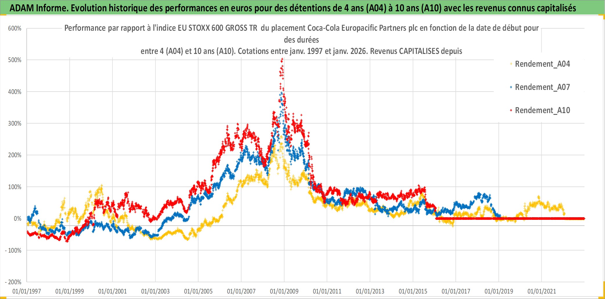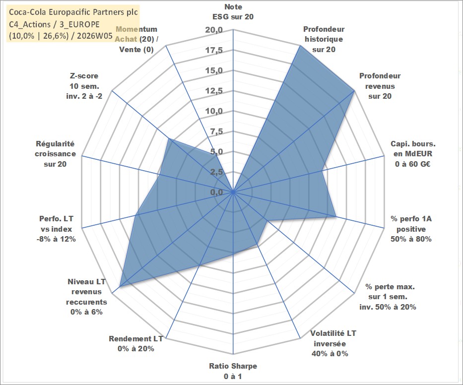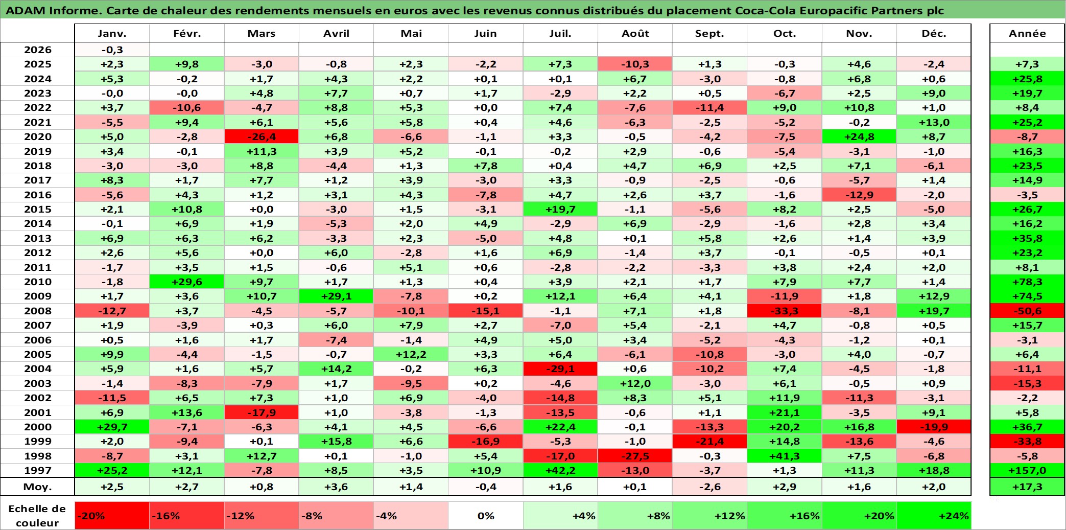 Site dédié aux investisseursPage dédiée sur site financeAnalyse des valorisations hebdomadaires de l'action Coca-Cola Europacific Partners plc. Cet actif est cote en USD. Les valorisations sont en contrevaleur EURO et couvrent les semaines 1997W01 a 2026W05. Les revenus de cet actif financier sont pris en compte depuis la semaine 1997W12. La note ESG de cet actif n'est pas connue.