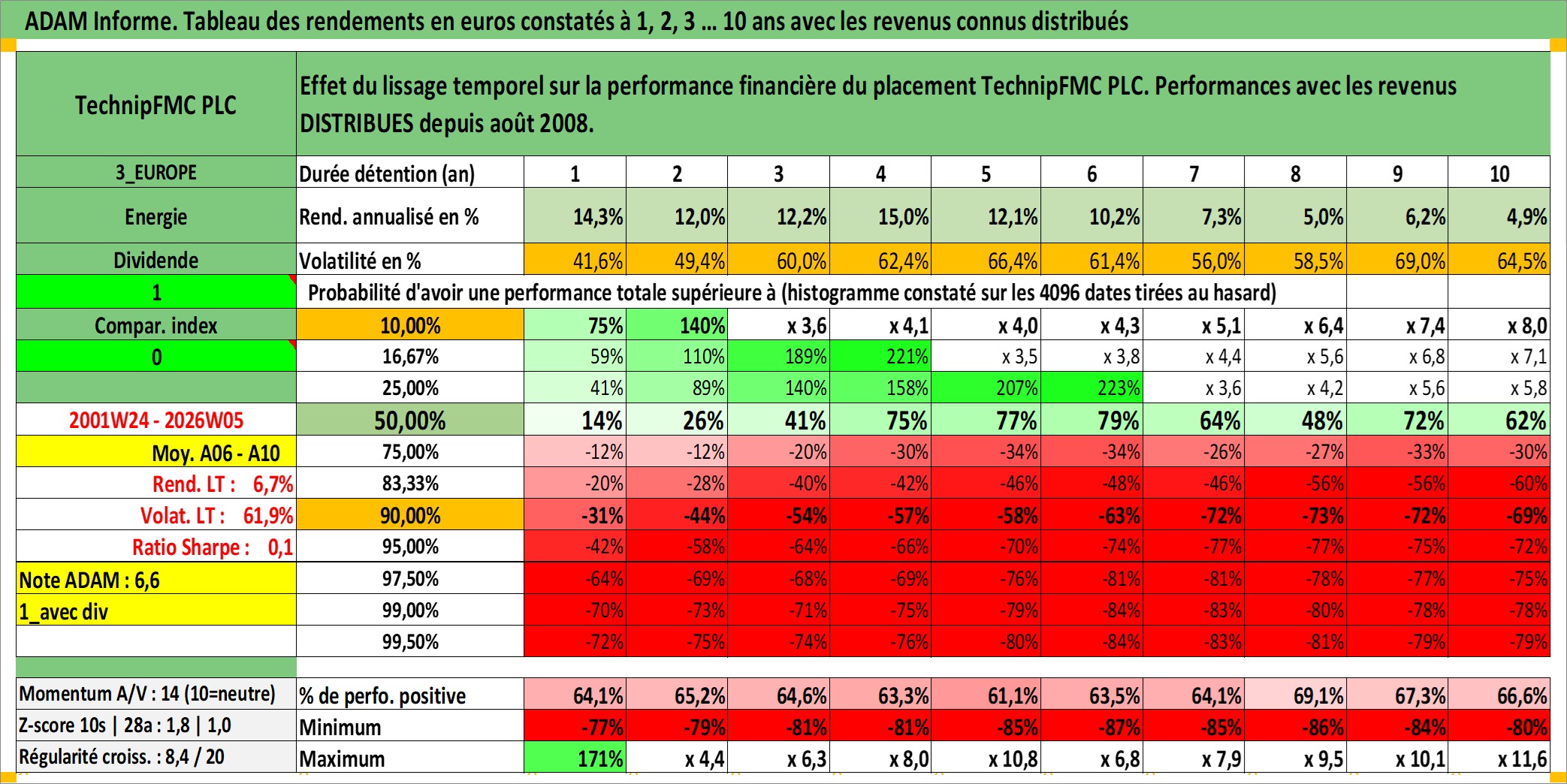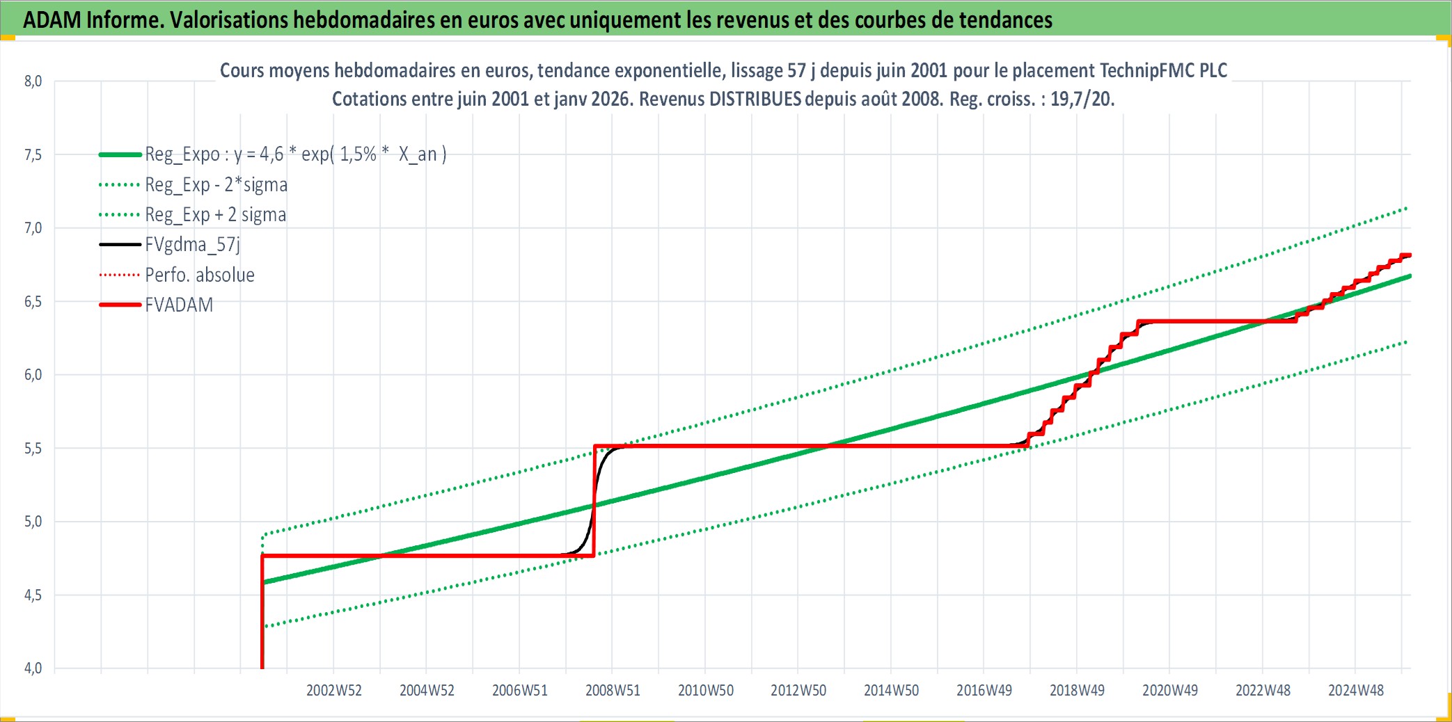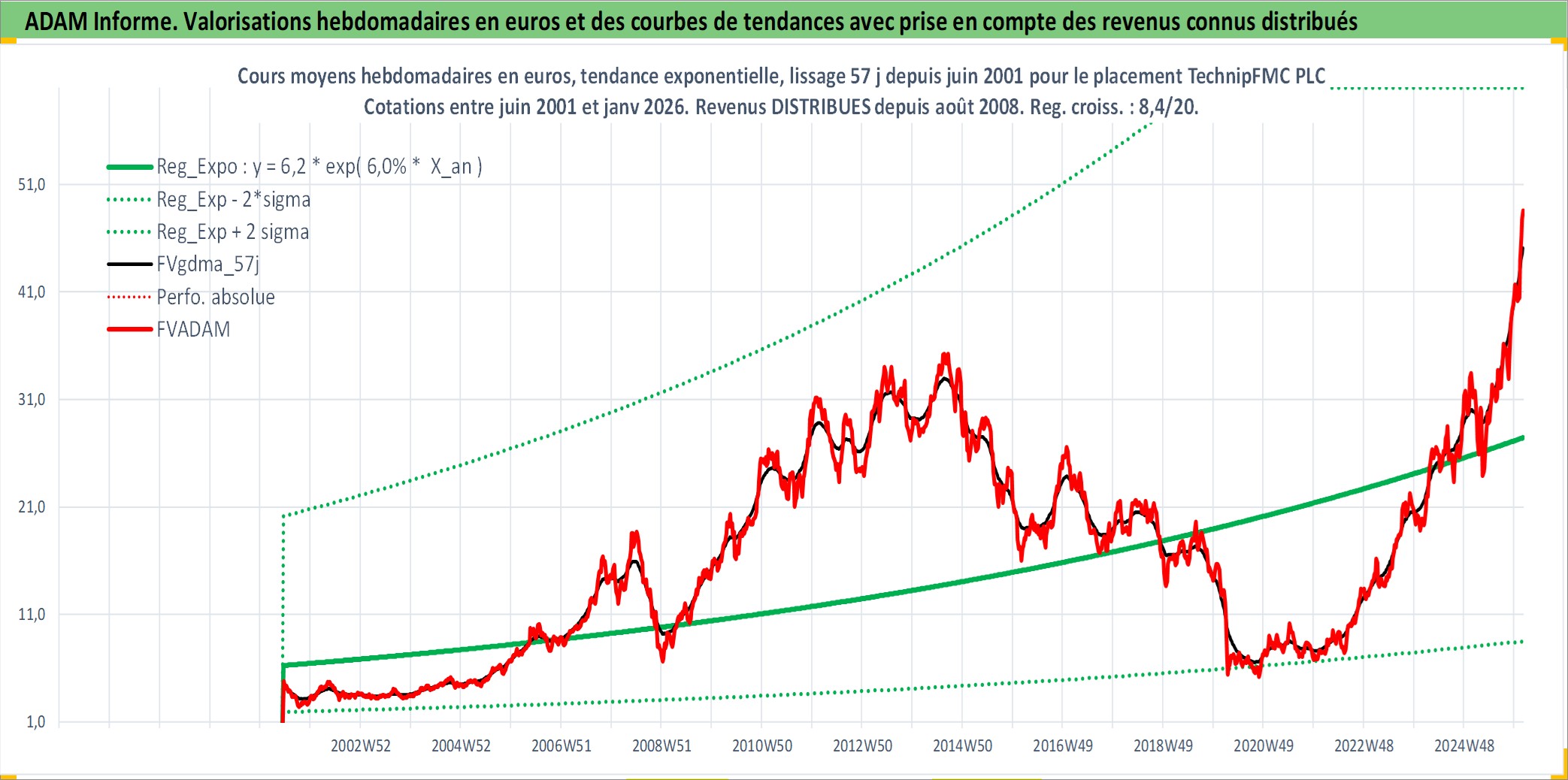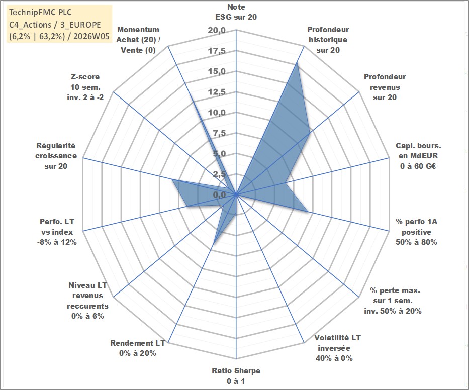 Site dédié aux investisseursPage dédiée sur site financeAnalyse des valorisations hebdomadaires de l'action TechnipFMC PLC. Cet actif est cote en USD. Les valorisations sont en contrevaleur EURO et couvrent les semaines 2001W24 a 2026W05. Les revenus de cet actif financier sont pris en compte depuis la semaine 2008W31. La note ESG de cet actif n'est pas connue.