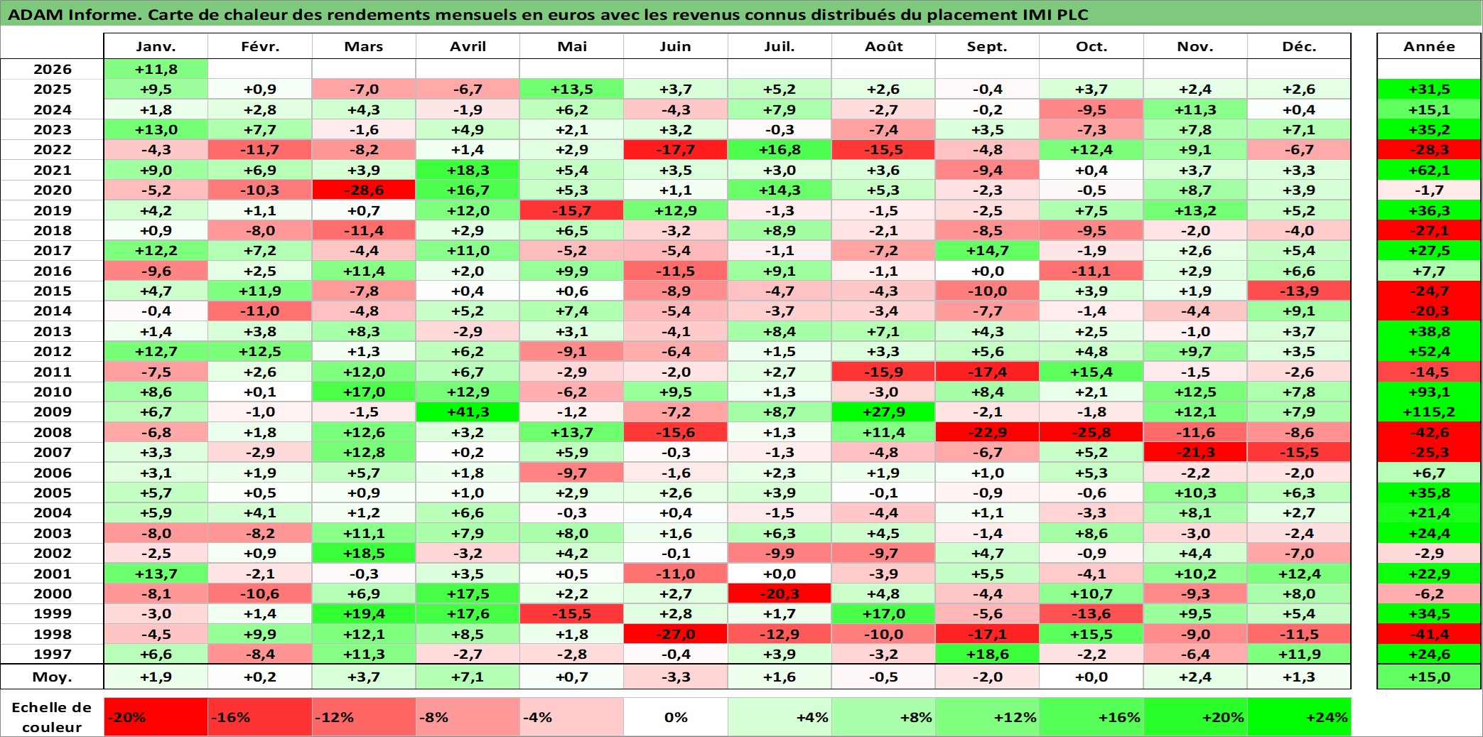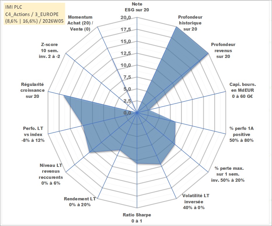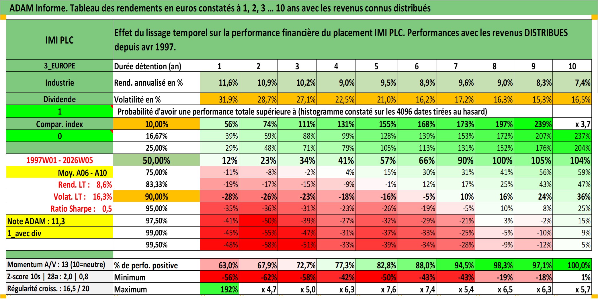 Site dédié aux investisseursPage dédiée sur site financeAnalyse des valorisations hebdomadaires de l'action IMI PLC. Cet actif est cote en GBX. Les valorisations sont en contrevaleur EURO et couvrent les semaines 1997W01 a 2026W05. Les revenus de cet actif financier sont pris en compte depuis la semaine 1997W15. La note ESG de cet actif n'est pas connue.