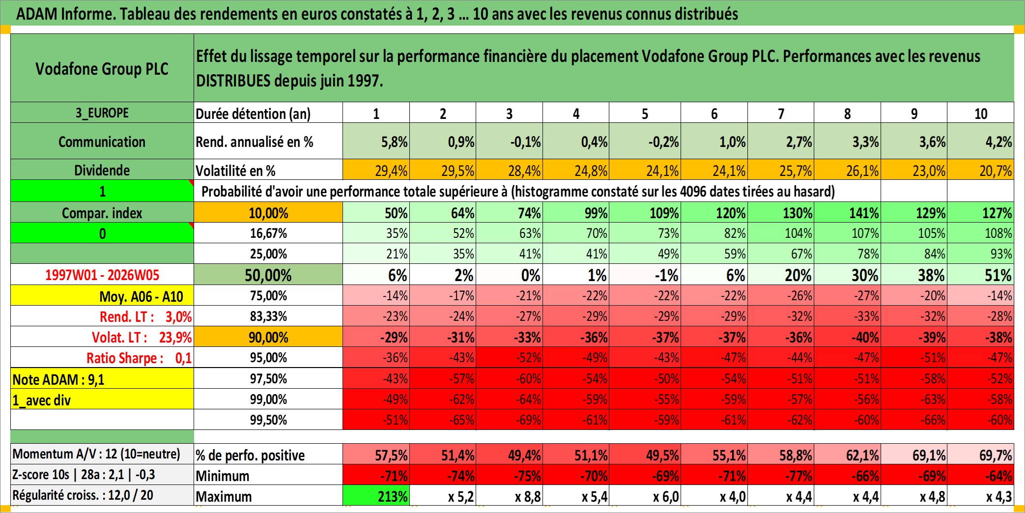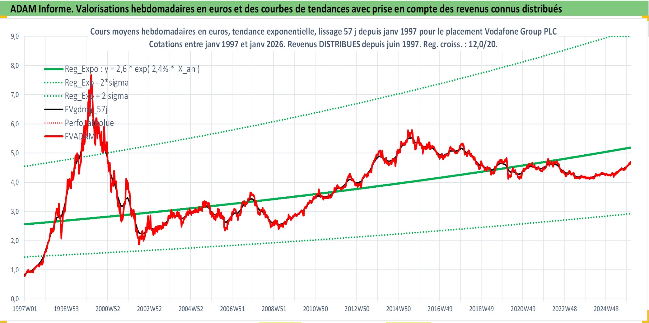 Site dédié aux investisseursPage dédiée sur site financeAnalyse des valorisations hebdomadaires de l'action Vodafone Group PLC. Cet actif est cote en GBX. Les valorisations sont en contrevaleur EURO et couvrent les semaines 1997W01 a 2026W05. Les revenus de cet actif financier sont pris en compte depuis la semaine 1997W24. La note globale ESG de cet actif est estimee a 13.0 (apres rebasage entre 0 et 20).
