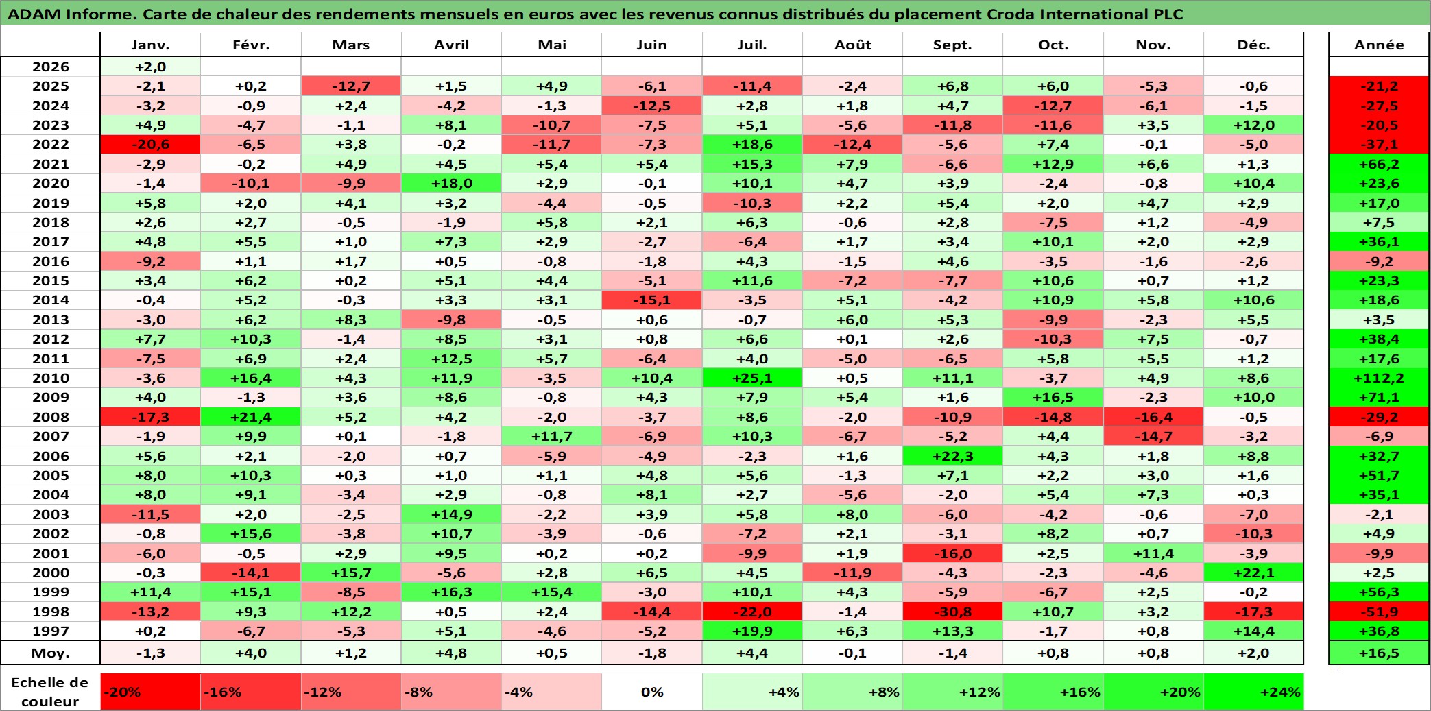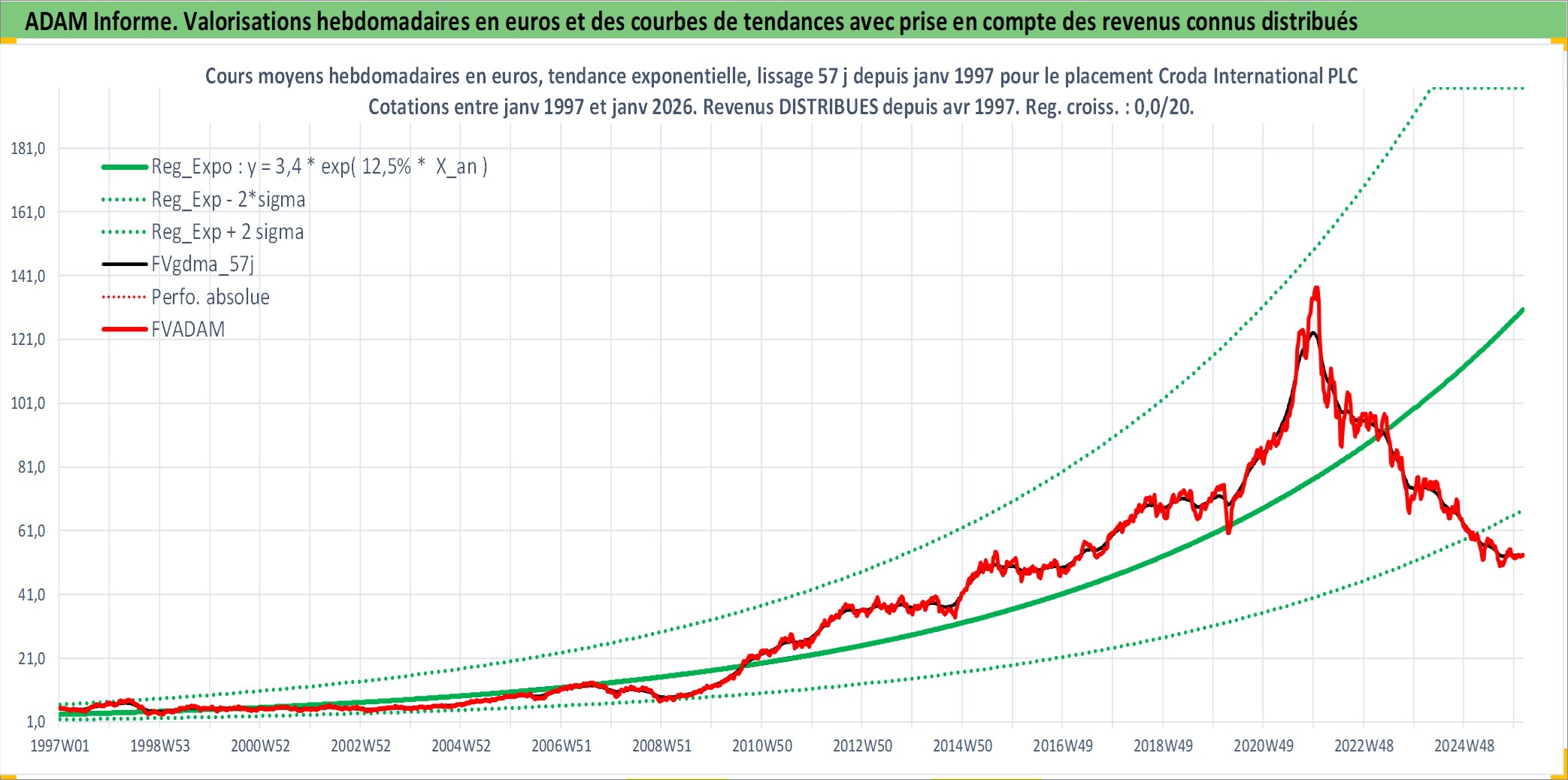 Site dédié aux investisseursPage dédiée sur site financeAnalyse des valorisations hebdomadaires de l'action Croda International PLC. Cet actif est cote en GBX. Les valorisations sont en contrevaleur EURO et couvrent les semaines 1997W01 a 2026W05. Les revenus de cet actif financier sont pris en compte depuis la semaine 1997W15. La note globale ESG de cet actif est estimee a 10.0 (apres rebasage entre 0 et 20).