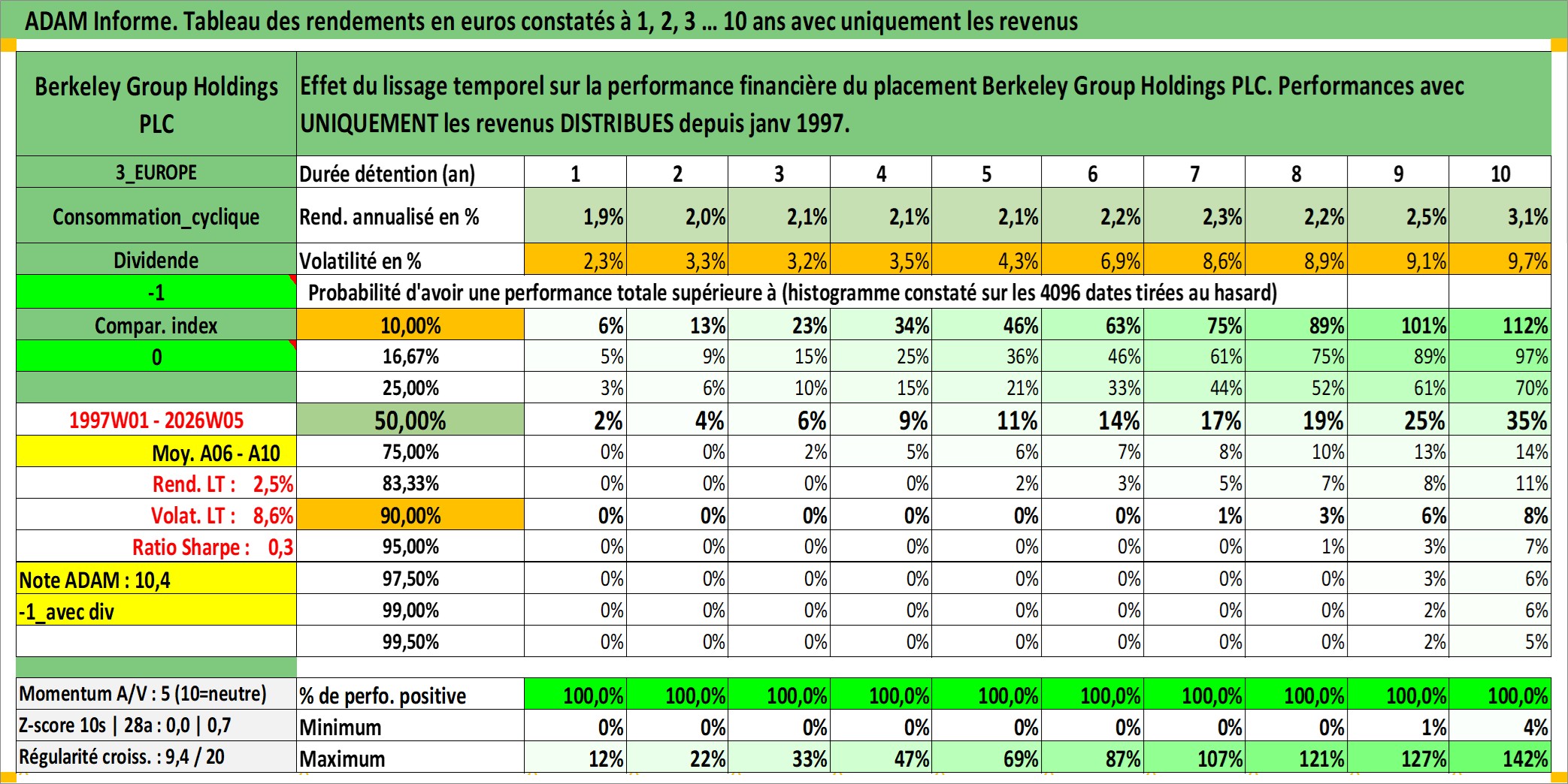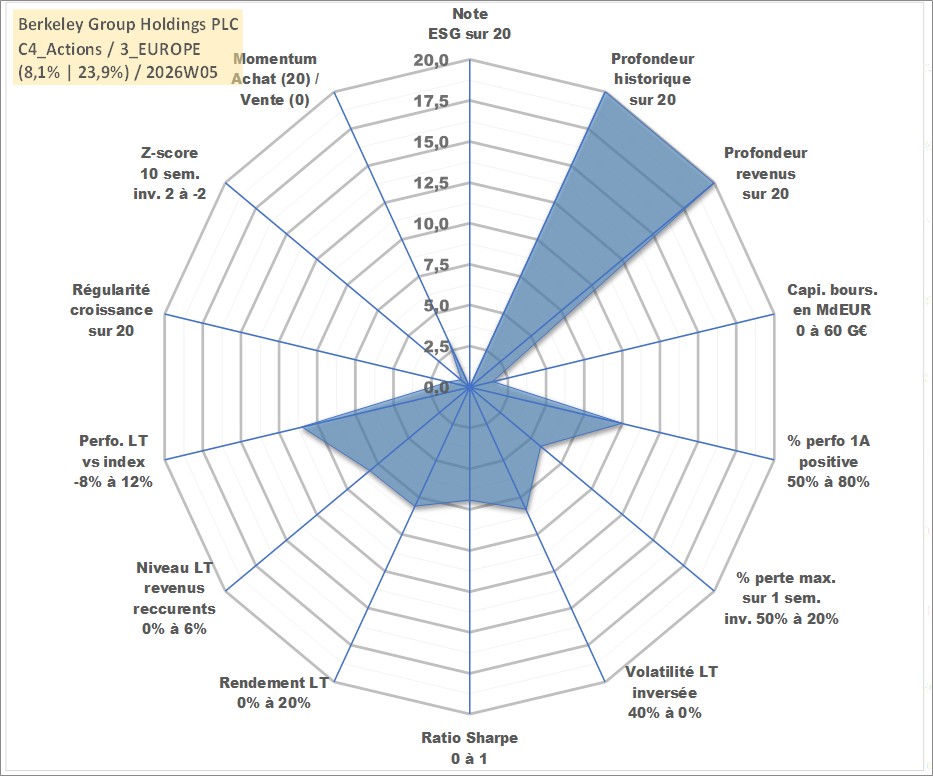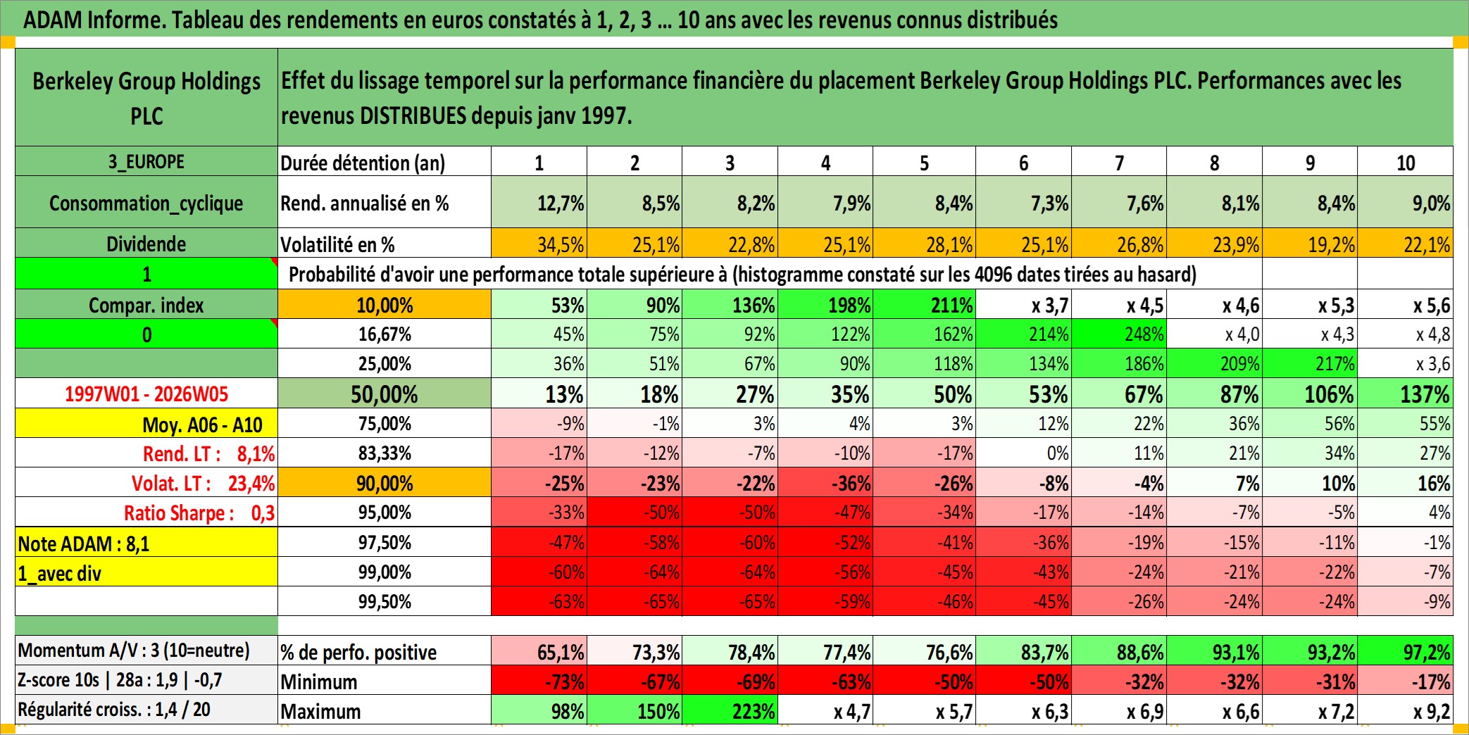 Site dédié aux investisseursPage dédiée sur site financeAnalyse des valorisations hebdomadaires de l'action Berkeley Group Holdings PLC. Cet actif est cote en GBX. Les valorisations sont en contrevaleur EURO et couvrent les semaines 1997W01 a 2026W05. Les revenus de cet actif financier sont pris en compte depuis la semaine 1997W02. La note ESG de cet actif n'est pas connue.