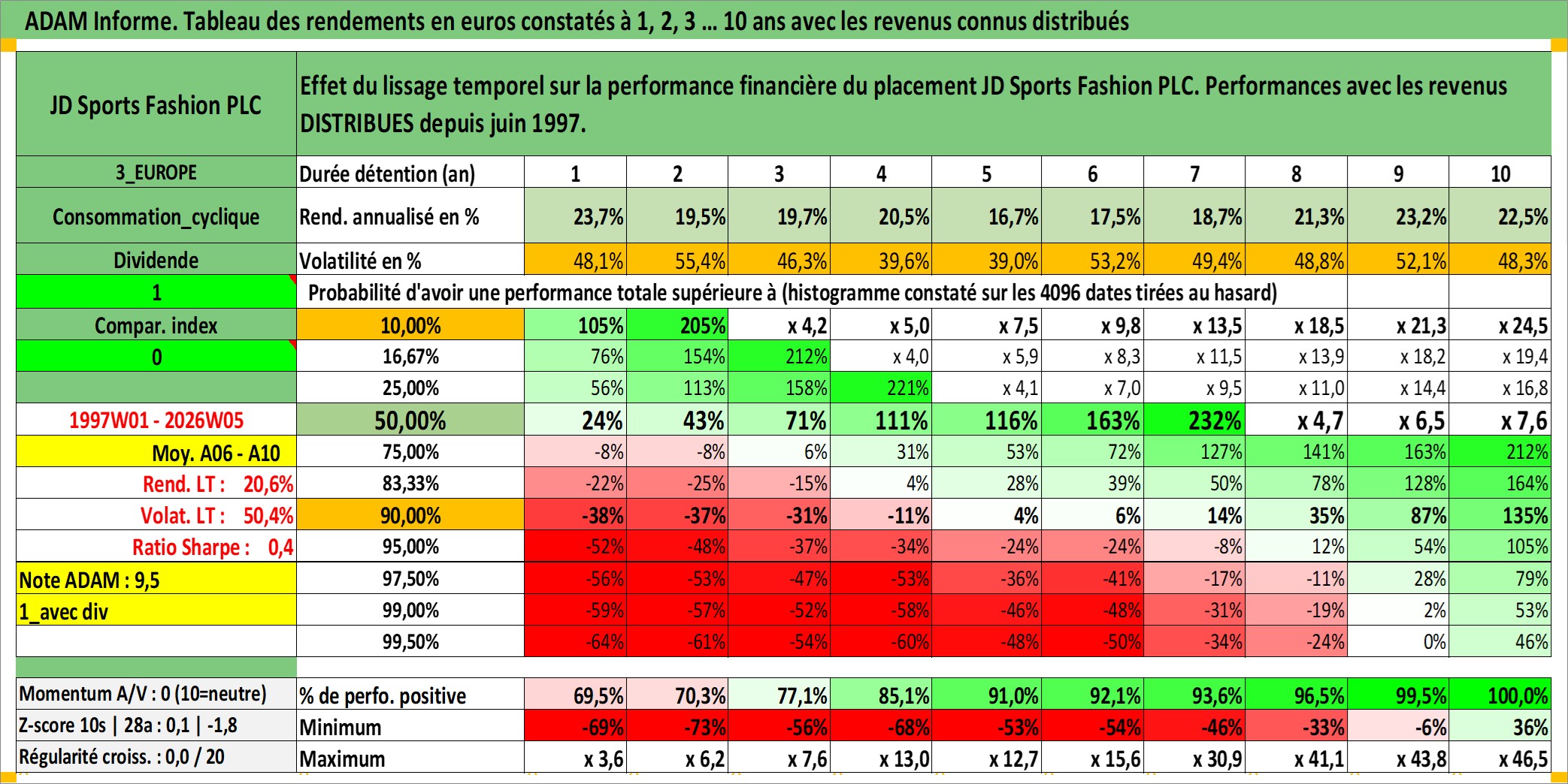 Site dédié aux investisseursPage dédiée sur site financeAnalyse des valorisations hebdomadaires de l'action JD Sports Fashion PLC. Cet actif est cote en GBX. Les valorisations sont en contrevaleur EURO et couvrent les semaines 1997W01 a 2026W05. Les revenus de cet actif financier sont pris en compte depuis la semaine 1997W24. La note ESG de cet actif n'est pas connue.