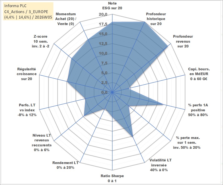 Site dédié aux investisseursPage dédiée sur site financeAnalyse des valorisations hebdomadaires de l'action Informa PLC. Cet actif est cote en GBX. Les valorisations sont en contrevaleur EURO et couvrent les semaines 1998W16 a 2026W05. Les revenus de cet actif financier sont pris en compte depuis la semaine 1998W44. La note globale ESG de cet actif est estimee a 18.0 (apres rebasage entre 0 et 20).