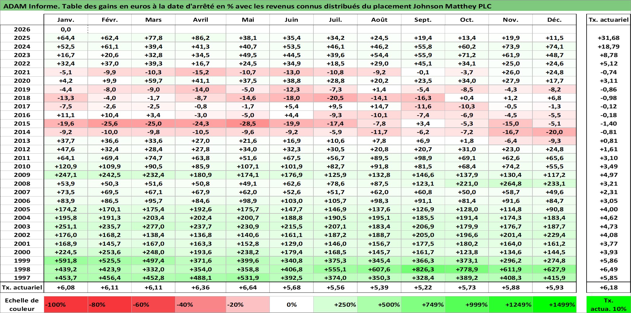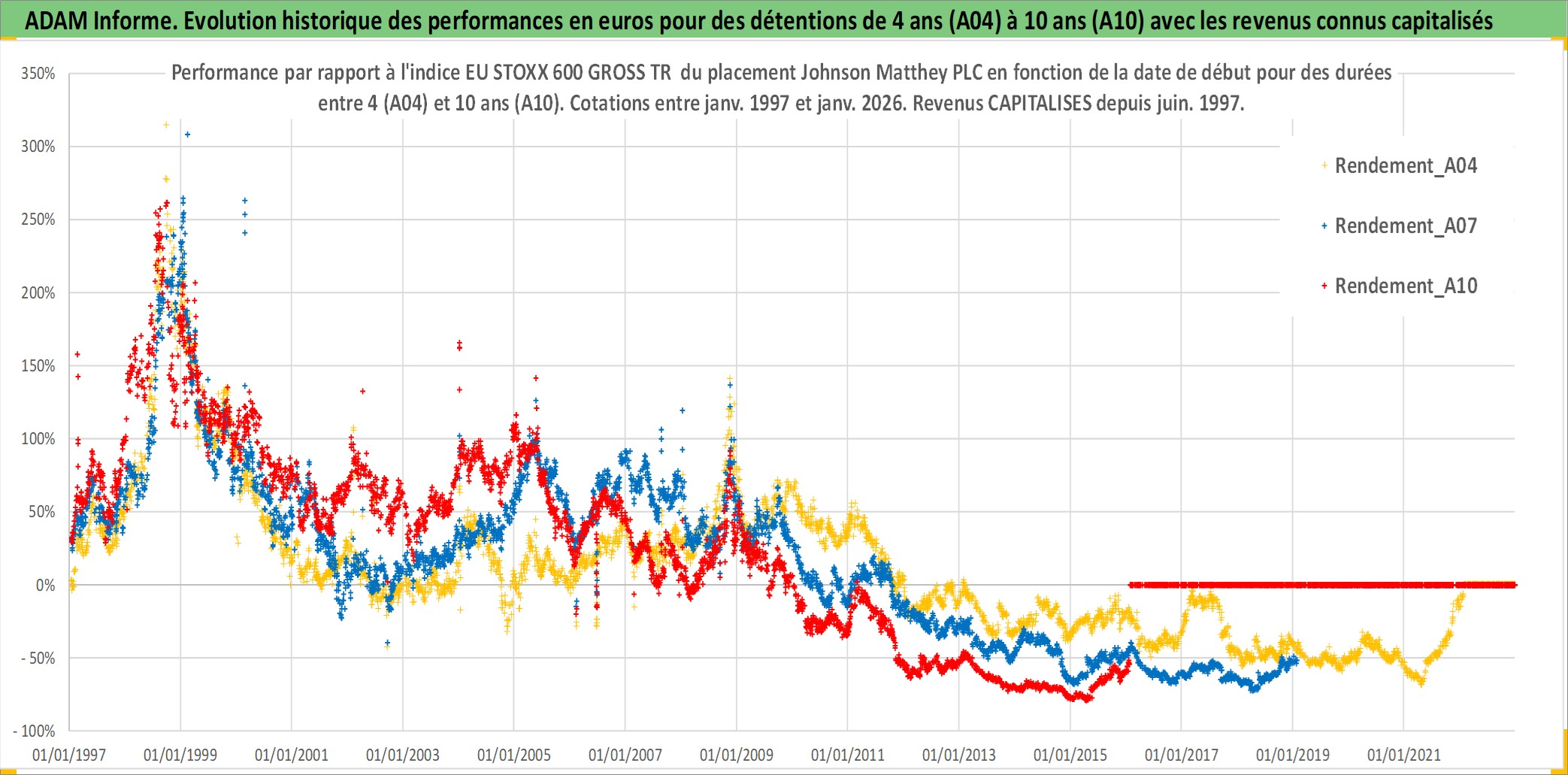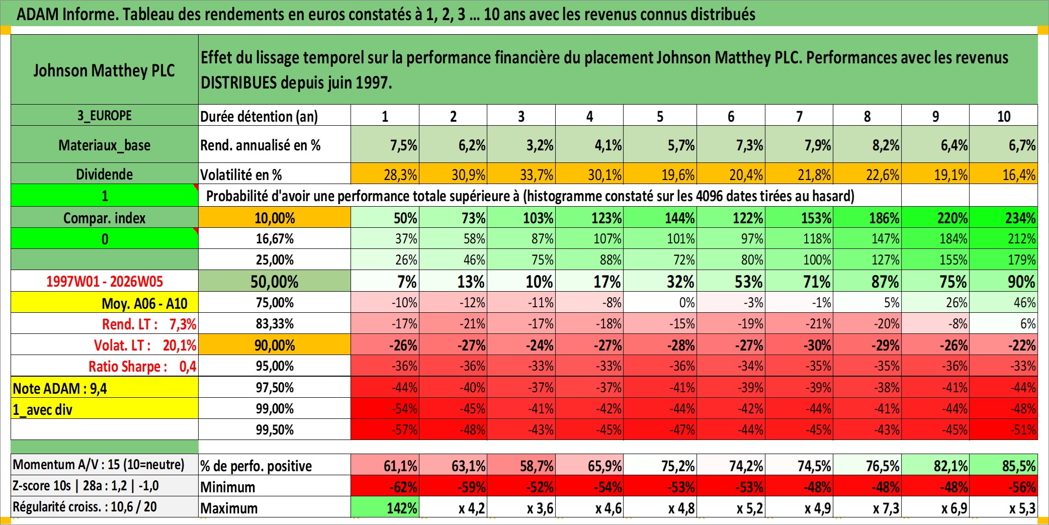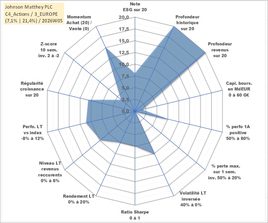 Site dédié aux investisseursPage dédiée sur site financeAnalyse des valorisations hebdomadaires de l'action Johnson Matthey PLC. Cet actif est cote en GBX. Les valorisations sont en contrevaleur EURO et couvrent les semaines 1997W01 a 2026W05. Les revenus de cet actif financier sont pris en compte depuis la semaine 1997W26. La note globale ESG de cet actif est estimee a 8.0 (apres rebasage entre 0 et 20).
