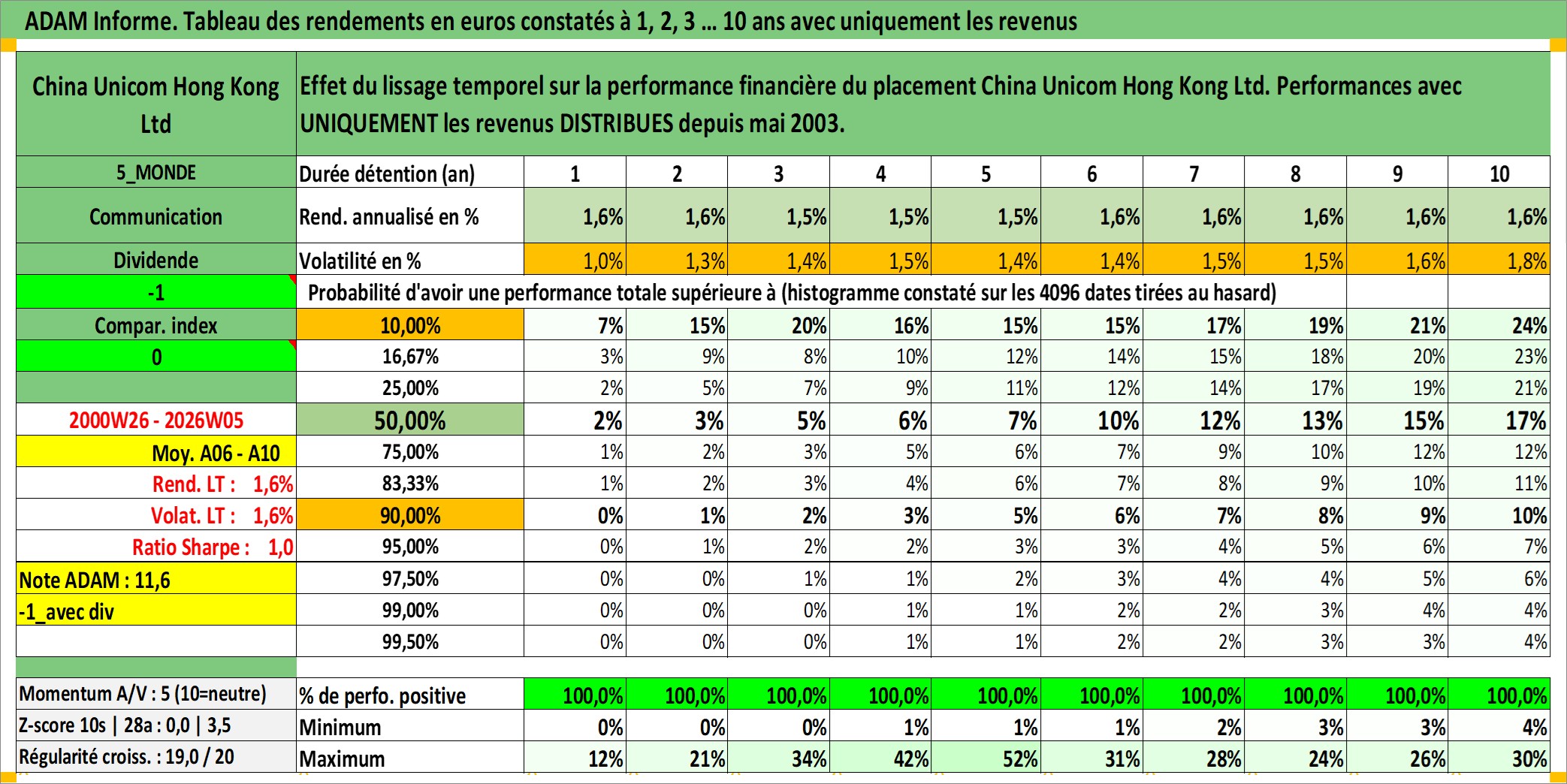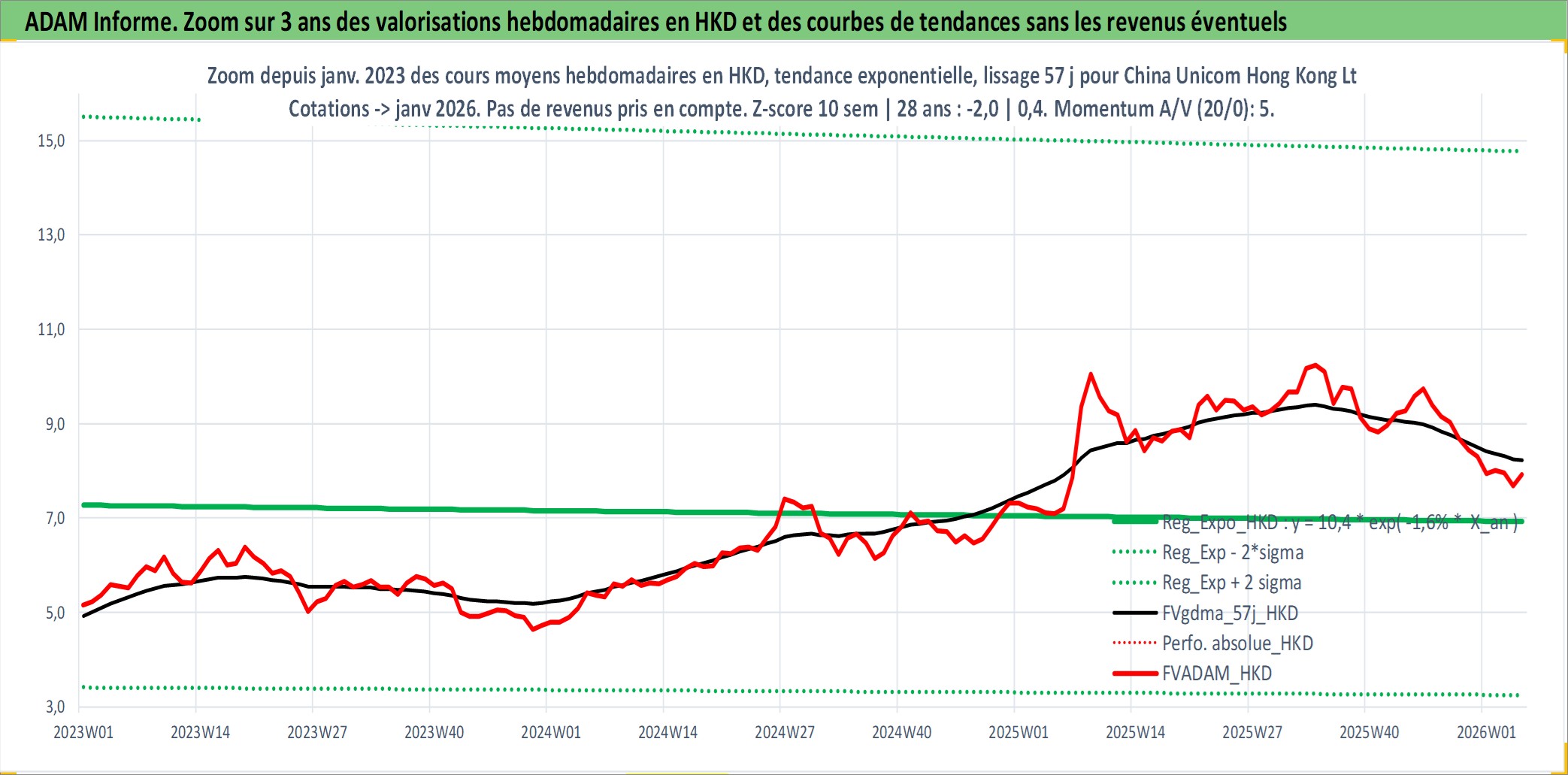 Site dédié aux investisseursPage dédiée sur site financeAnalyse des valorisations hebdomadaires de l'action China Unicom Hong Kong Ltd. Cet actif est cote en HKD. Les valorisations sont en contrevaleur EURO et couvrent les semaines 2000W26 a 2026W05. Les revenus de cet actif financier sont pris en compte depuis la semaine 2003W19. La note globale ESG de cet actif est estimee a 5.0 (apres rebasage entre 0 et 20).