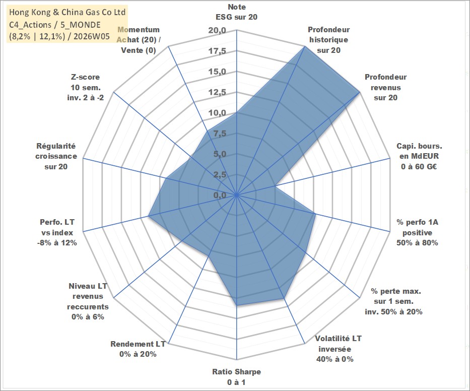 Site dédié aux investisseursPage dédiée sur site financeAnalyse des valorisations hebdomadaires de l'action Hong Kong & China Gas Co Ltd. Cet actif est cote en HKD. Les valorisations sont en contrevaleur EURO et couvrent les semaines 1997W01 a 2026W05. Les revenus de cet actif financier sont pris en compte depuis la semaine 1997W16. La note globale ESG de cet actif est estimee a 10.0 (apres rebasage entre 0 et 20).
