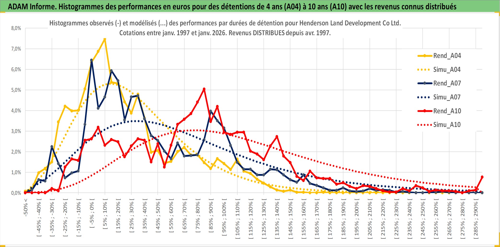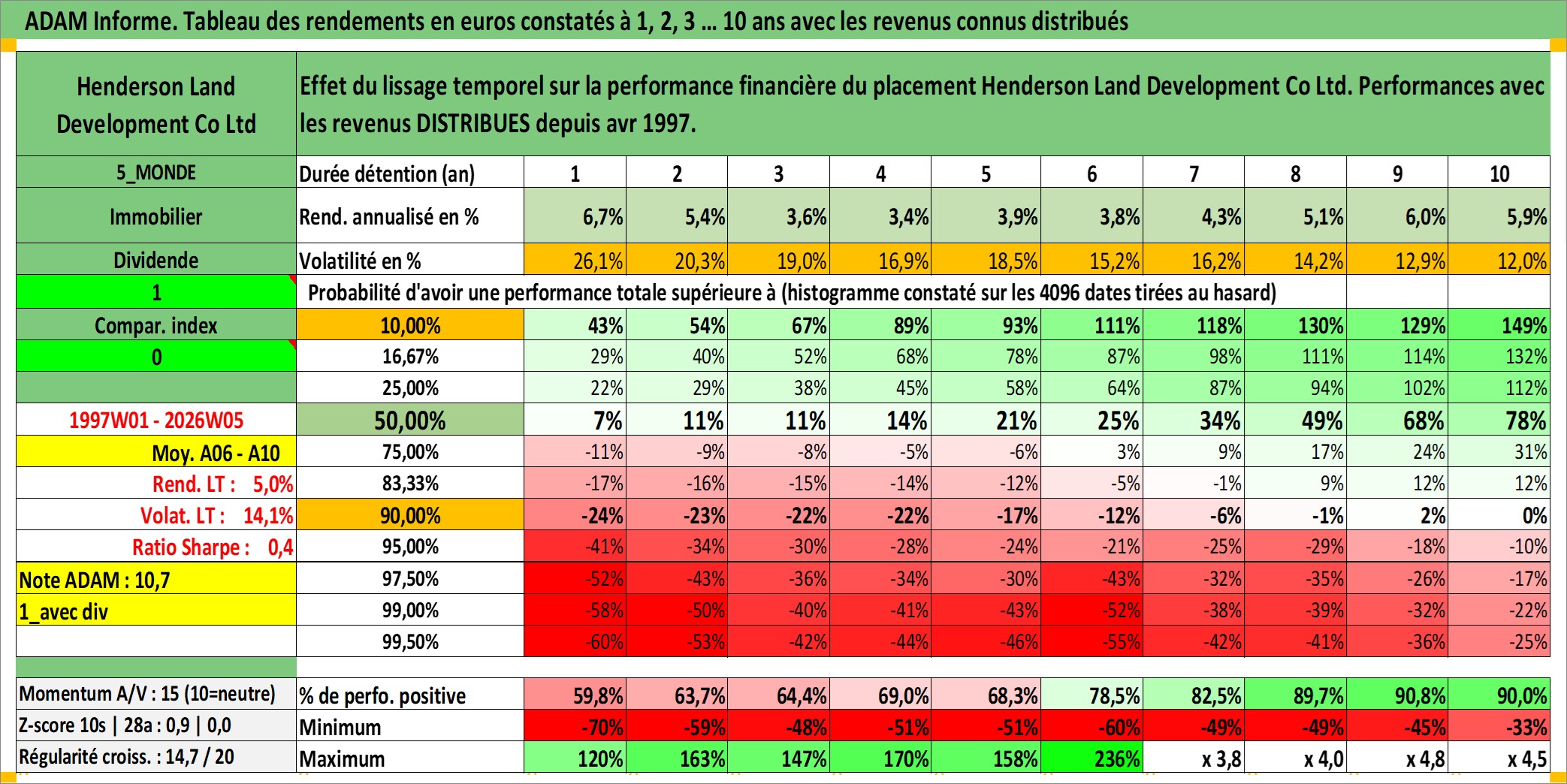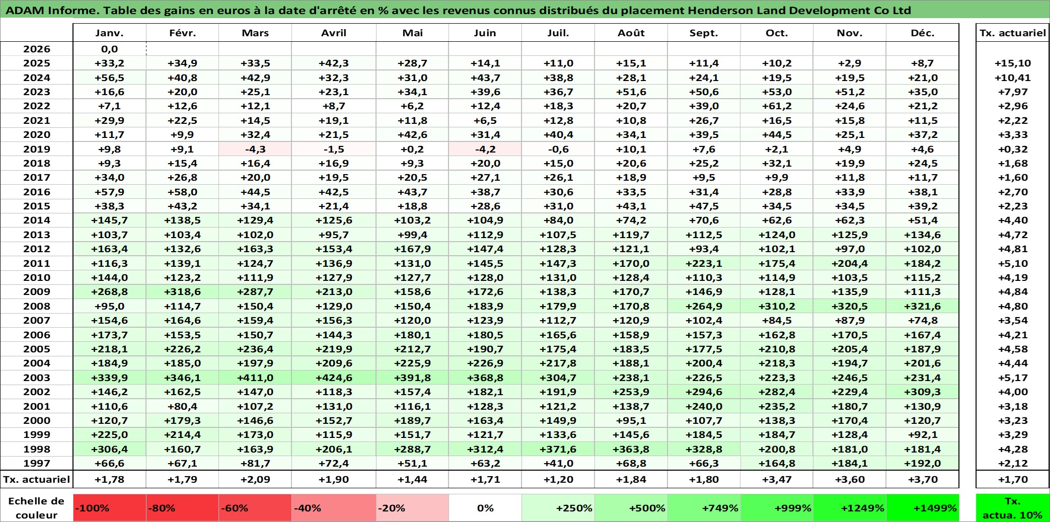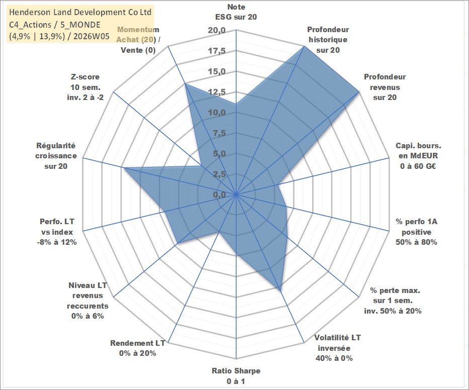 Site dédié aux investisseursPage dédiée sur site financeAnalyse des valorisations hebdomadaires de l'action Henderson Land Development Co Ltd. Cet actif est cote en HKD. Les valorisations sont en contrevaleur EURO et couvrent les semaines 1997W01 a 2026W05. Les revenus de cet actif financier sont pris en compte depuis la semaine 1997W16. La note globale ESG de cet actif est estimee a 11.0 (apres rebasage entre 0 et 20).