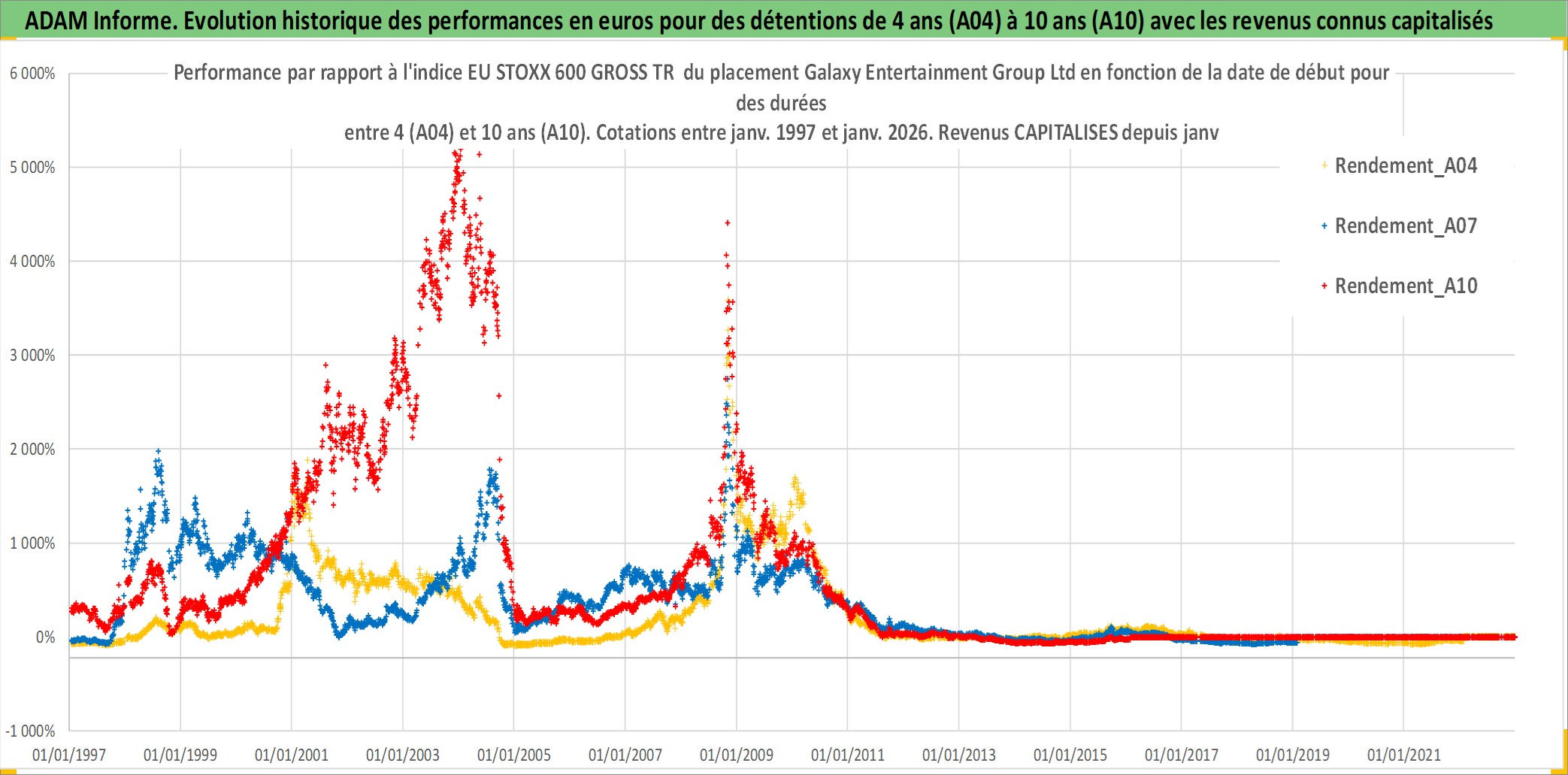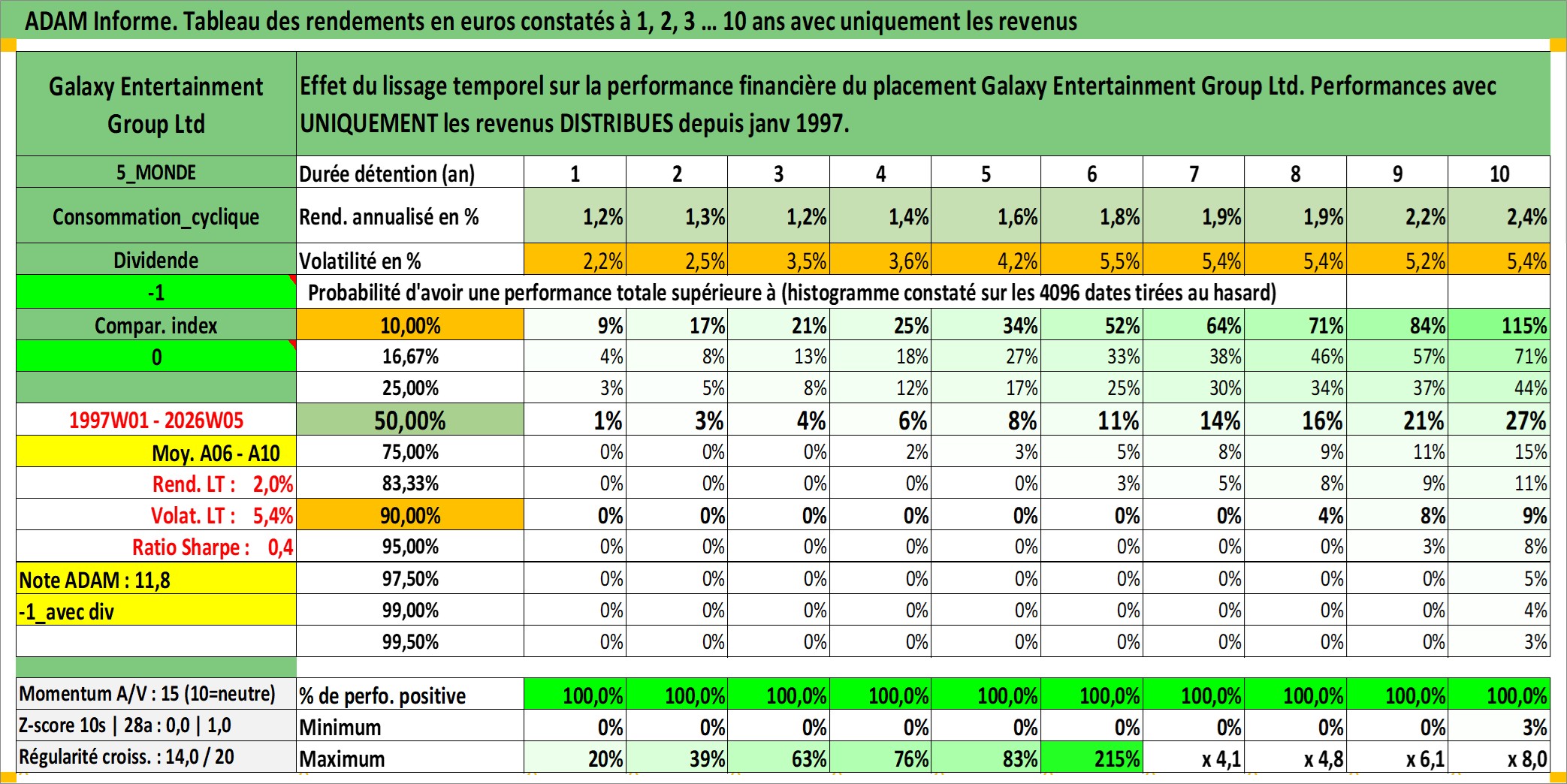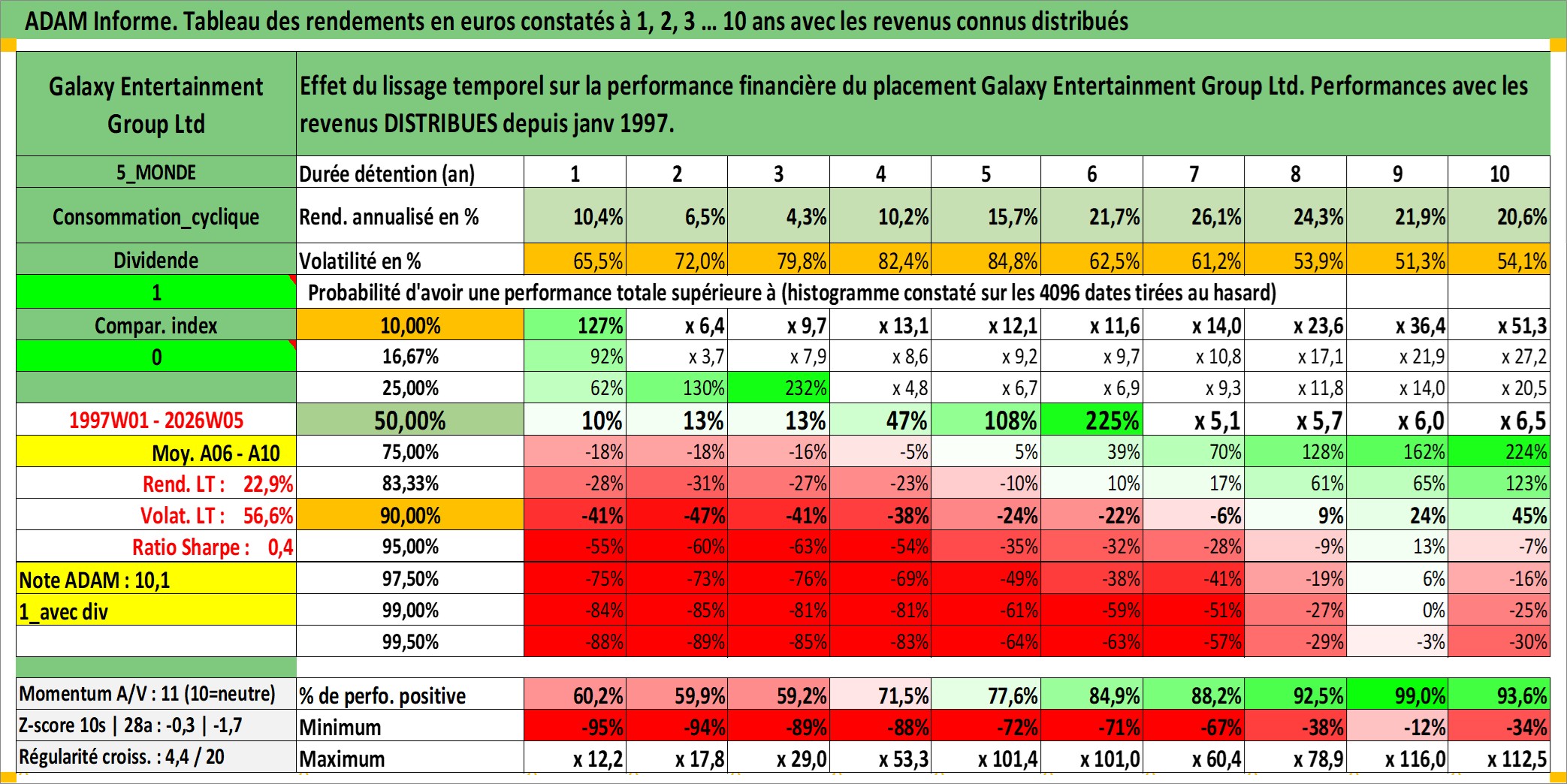 Site dédié aux investisseursPage dédiée sur site financeAnalyse des valorisations hebdomadaires de l'action Galaxy Entertainment Group Ltd. Cet actif est cote en HKD. Les valorisations sont en contrevaleur EURO et couvrent les semaines 1997W01 a 2026W05. Les revenus de cet actif financier sont pris en compte depuis la semaine 1997W01. La note globale ESG de cet actif est estimee a 6.0 (apres rebasage entre 0 et 20).