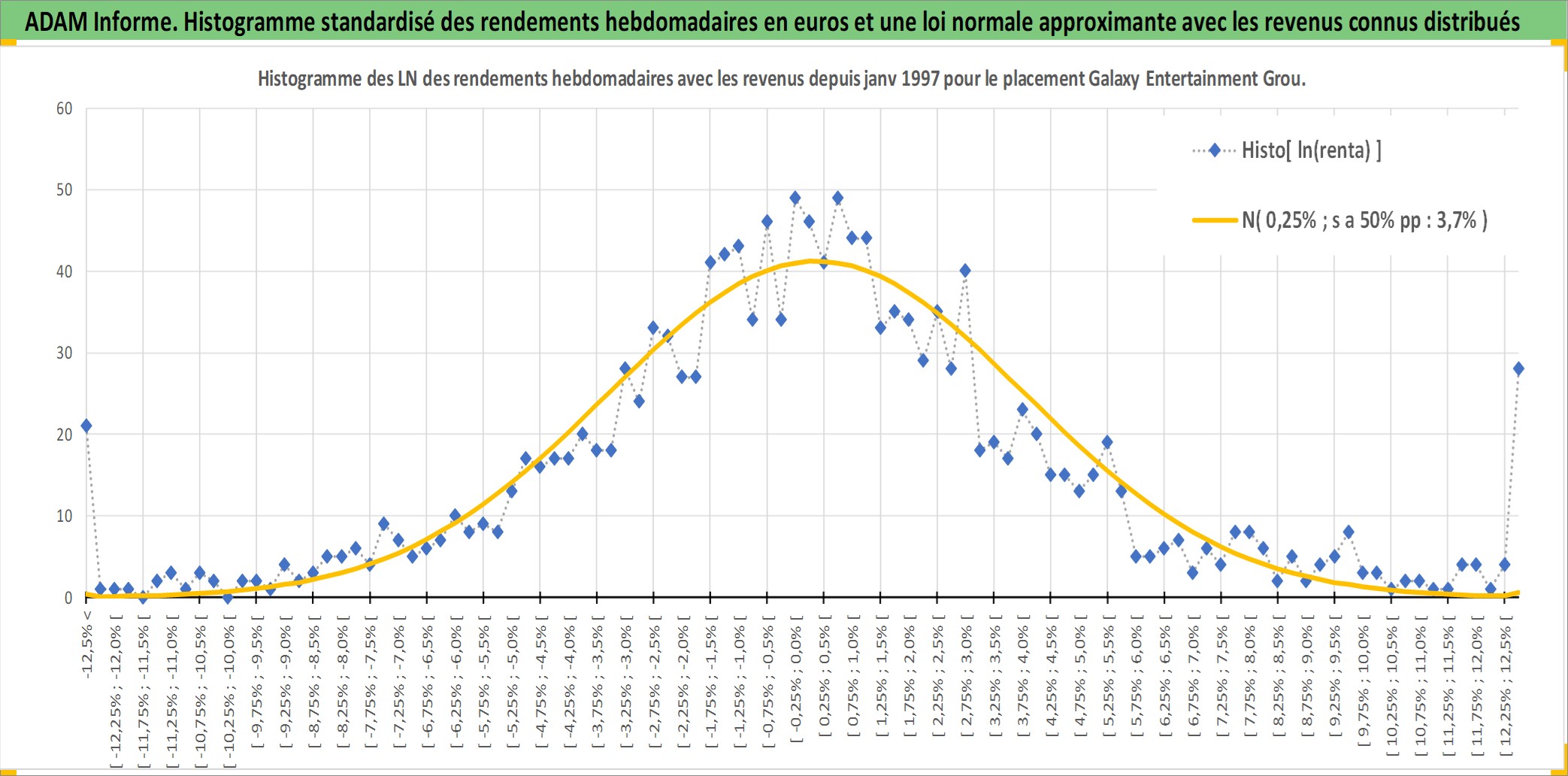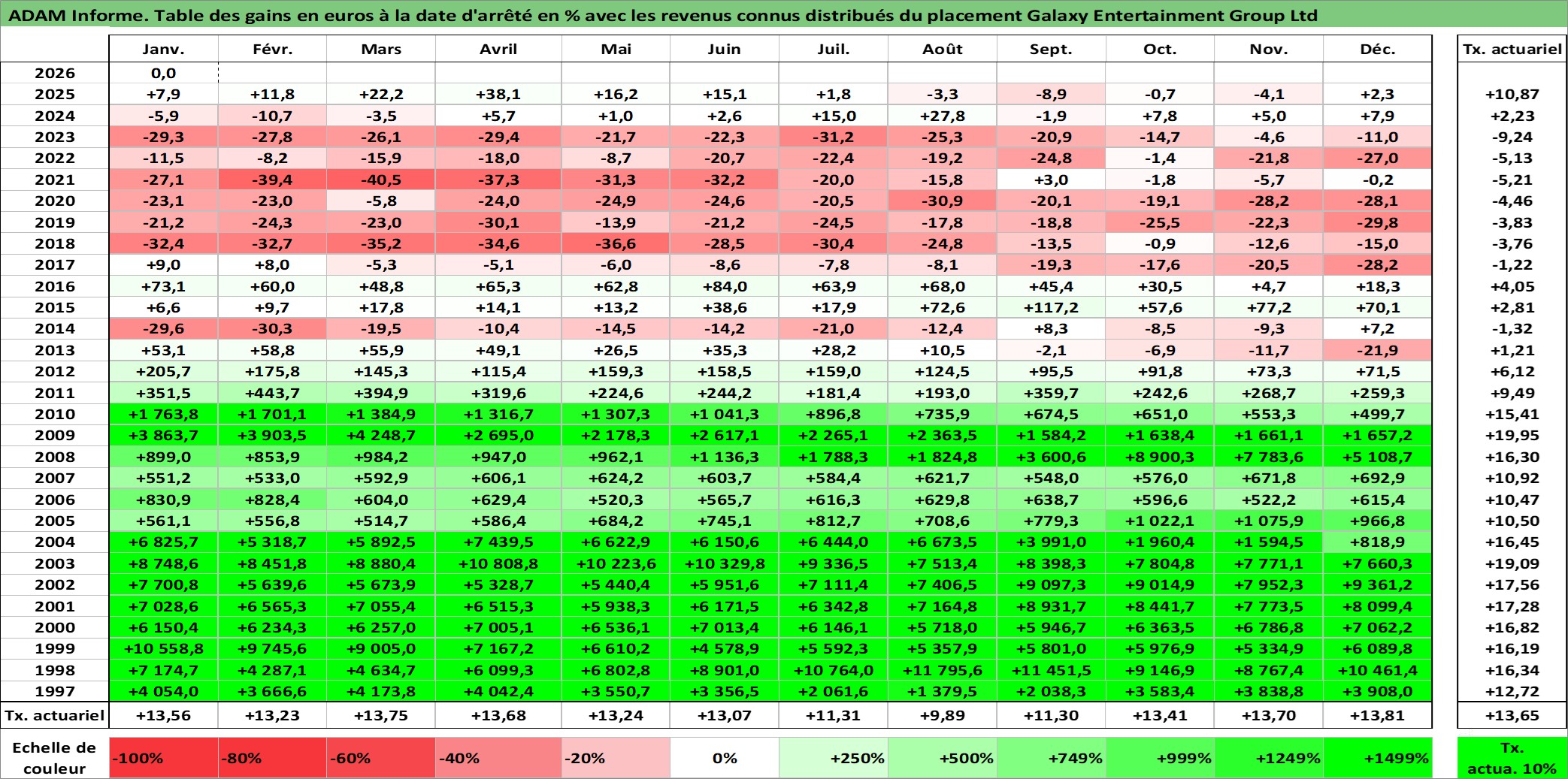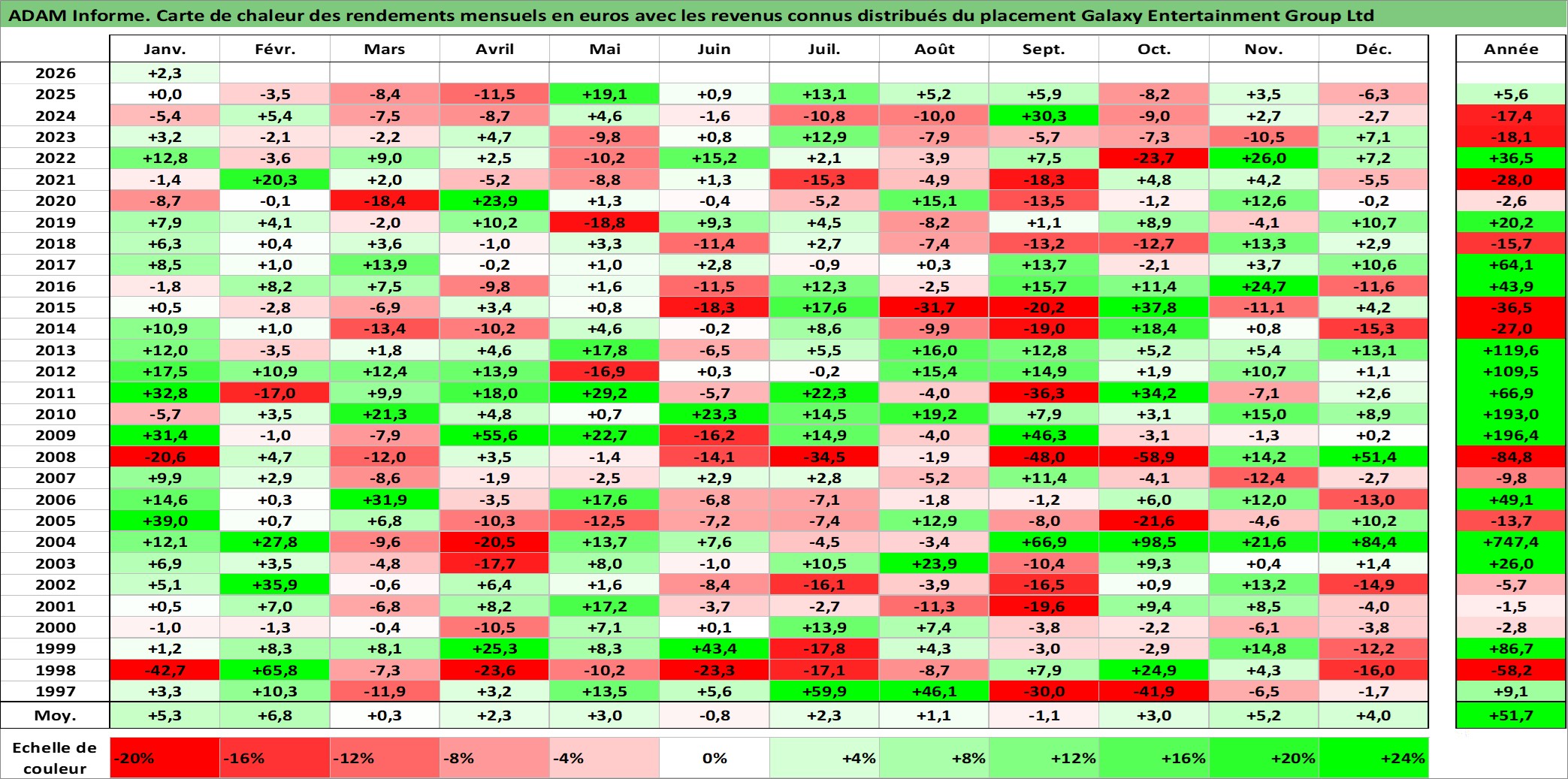 Site dédié aux investisseursPage dédiée sur site financeAnalyse des valorisations hebdomadaires de l'action Galaxy Entertainment Group Ltd. Cet actif est cote en HKD. Les valorisations sont en contrevaleur EURO et couvrent les semaines 1997W01 a 2026W05. Les revenus de cet actif financier sont pris en compte depuis la semaine 1997W01. La note globale ESG de cet actif est estimee a 6.0 (apres rebasage entre 0 et 20).