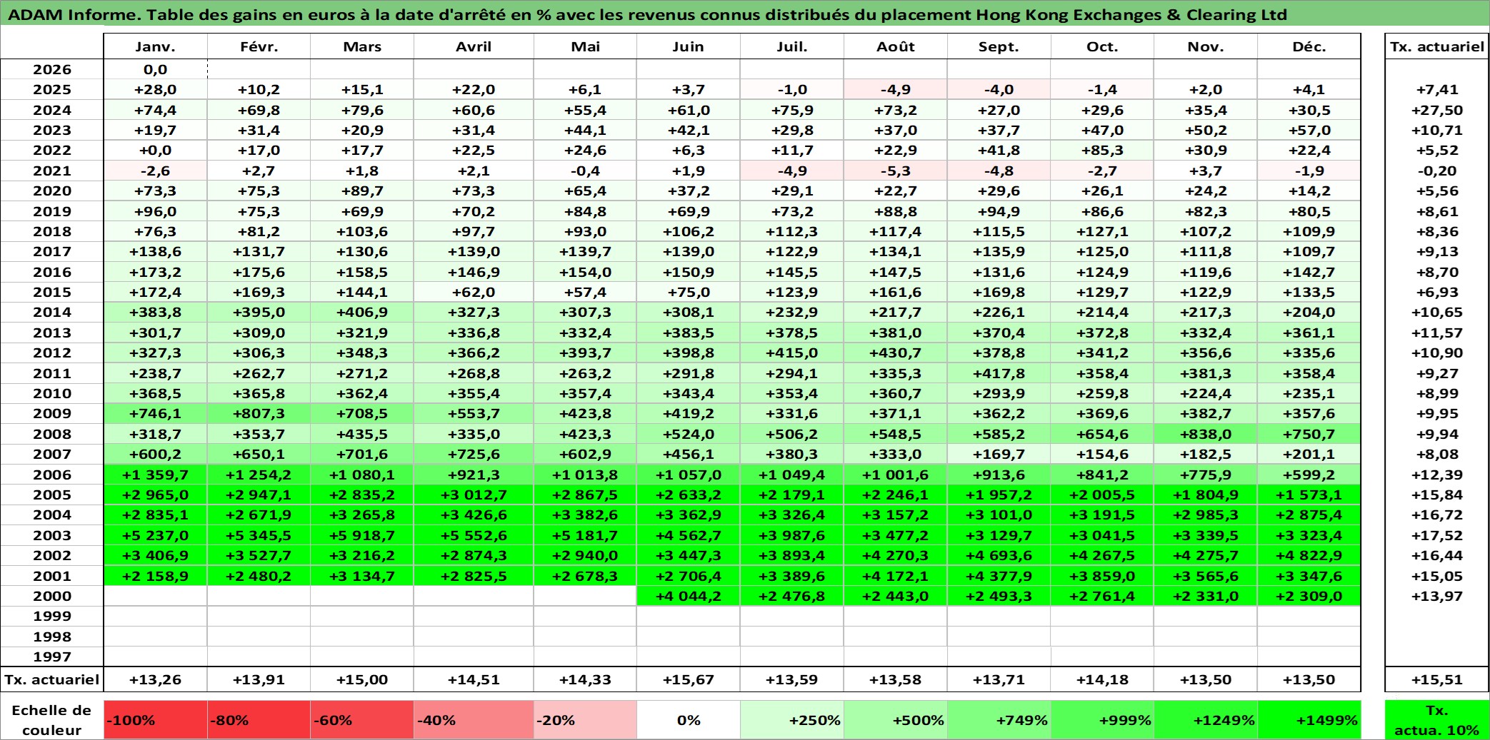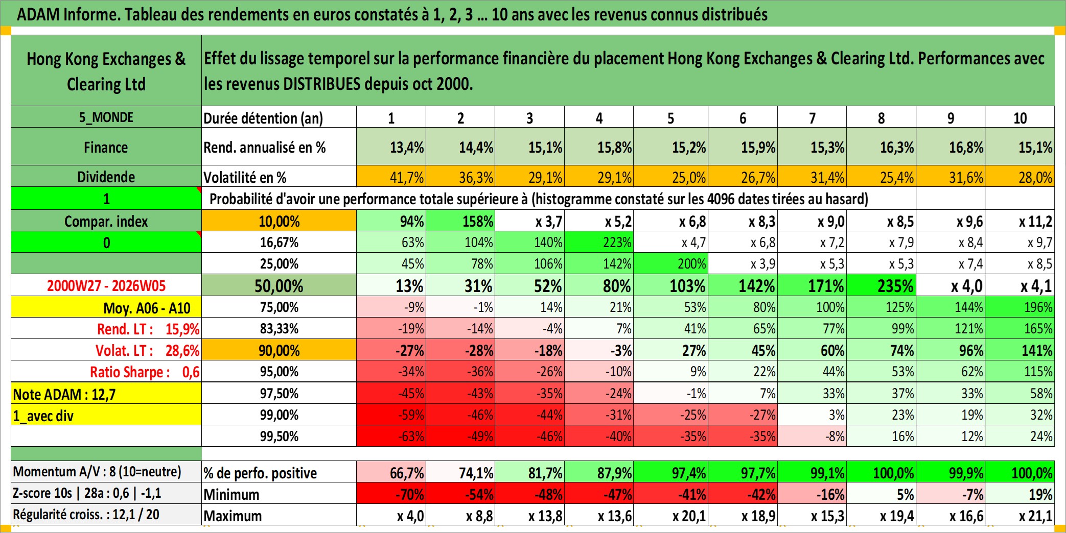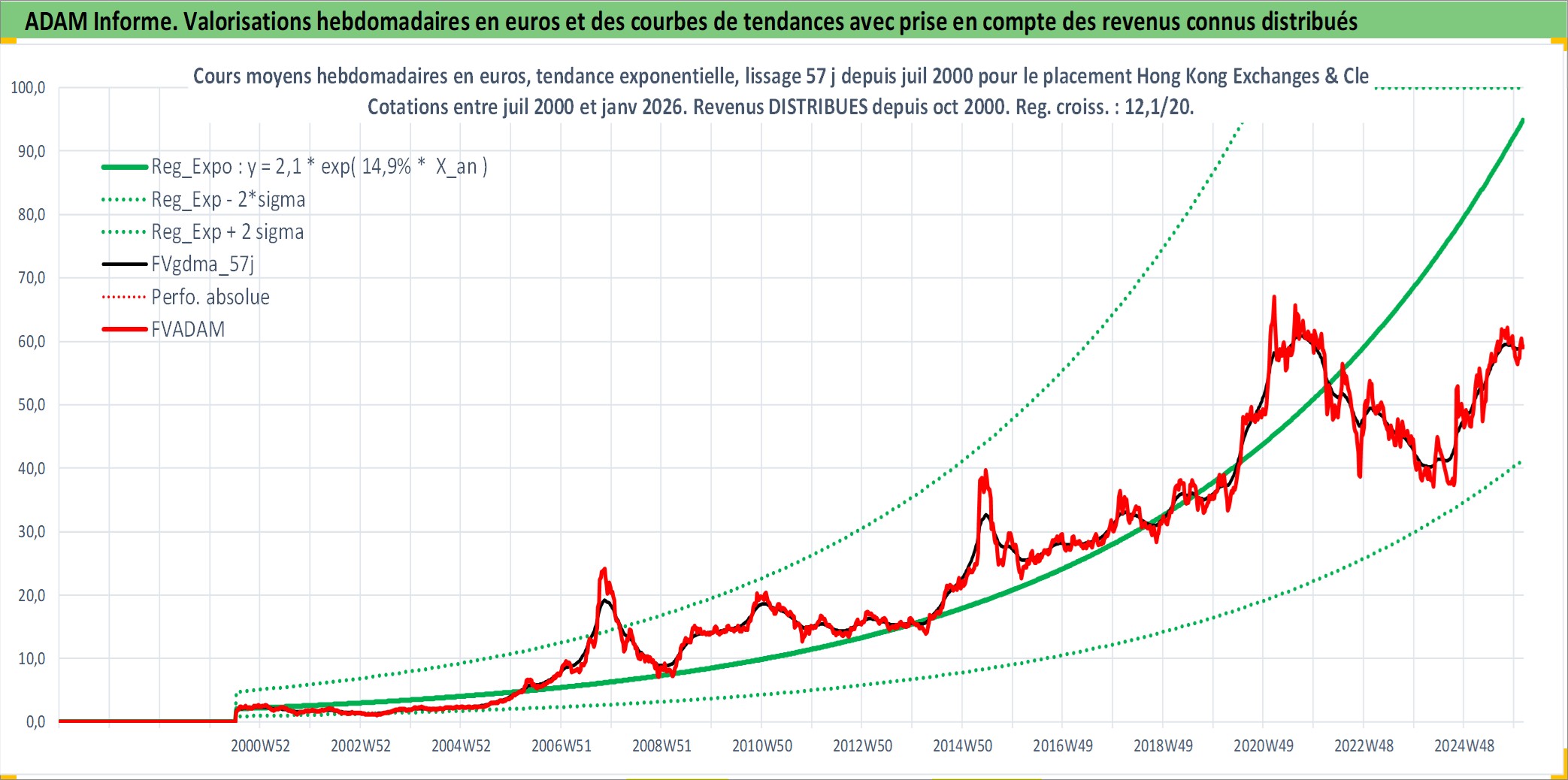 Site dédié aux investisseursPage dédiée sur site financeAnalyse des valorisations hebdomadaires de l'action Hong Kong Exchanges & Clearing Ltd. Cet actif est cote en HKD. Les valorisations sont en contrevaleur EURO et couvrent les semaines 2000W27 a 2026W05. Les revenus de cet actif financier sont pris en compte depuis la semaine 2000W40. La note globale ESG de cet actif est estimee a 12.0 (apres rebasage entre 0 et 20).
