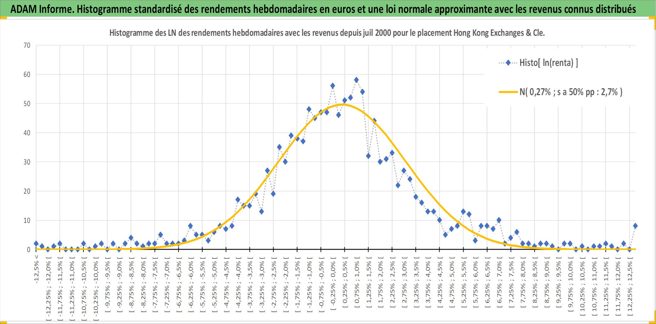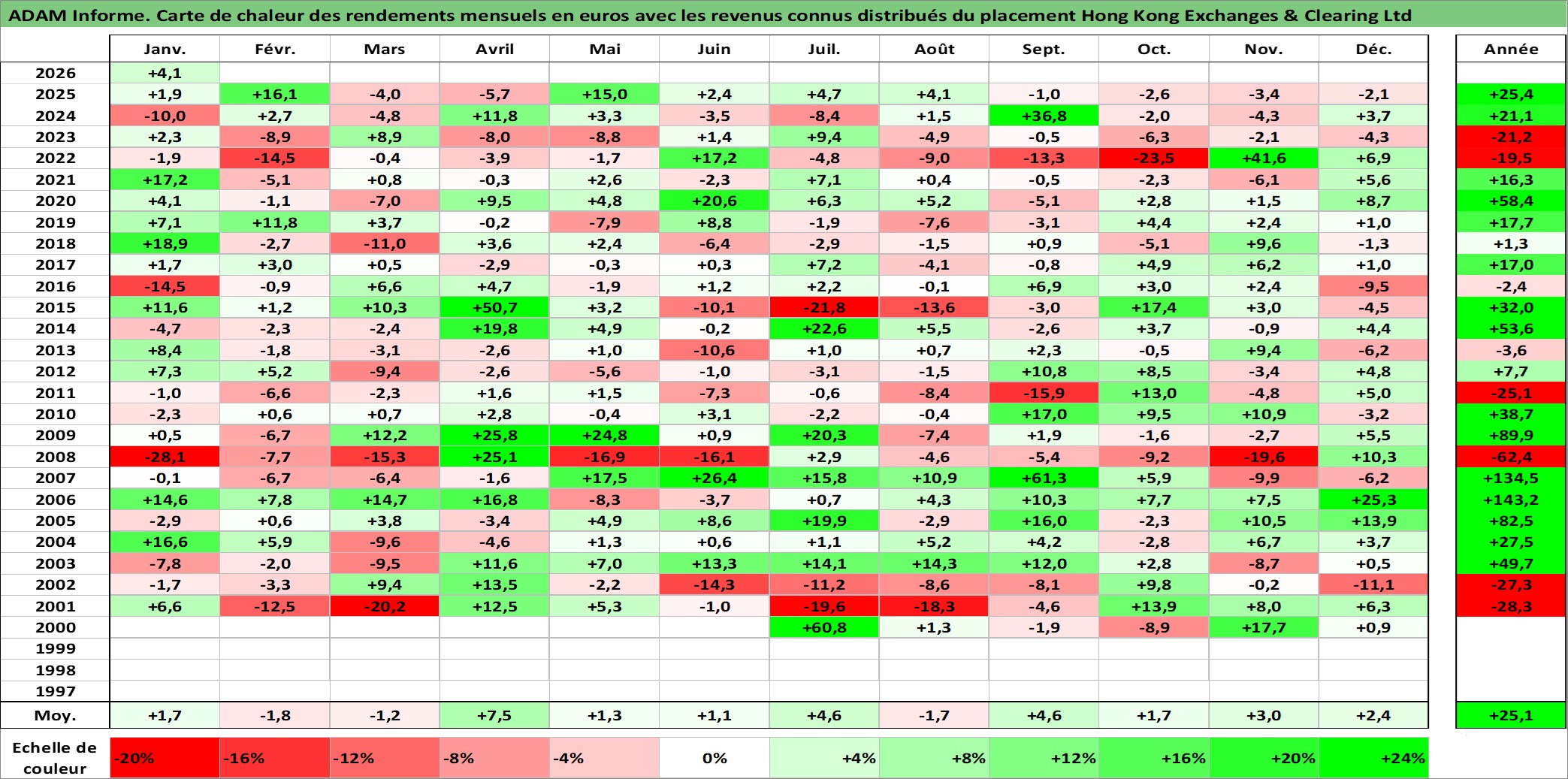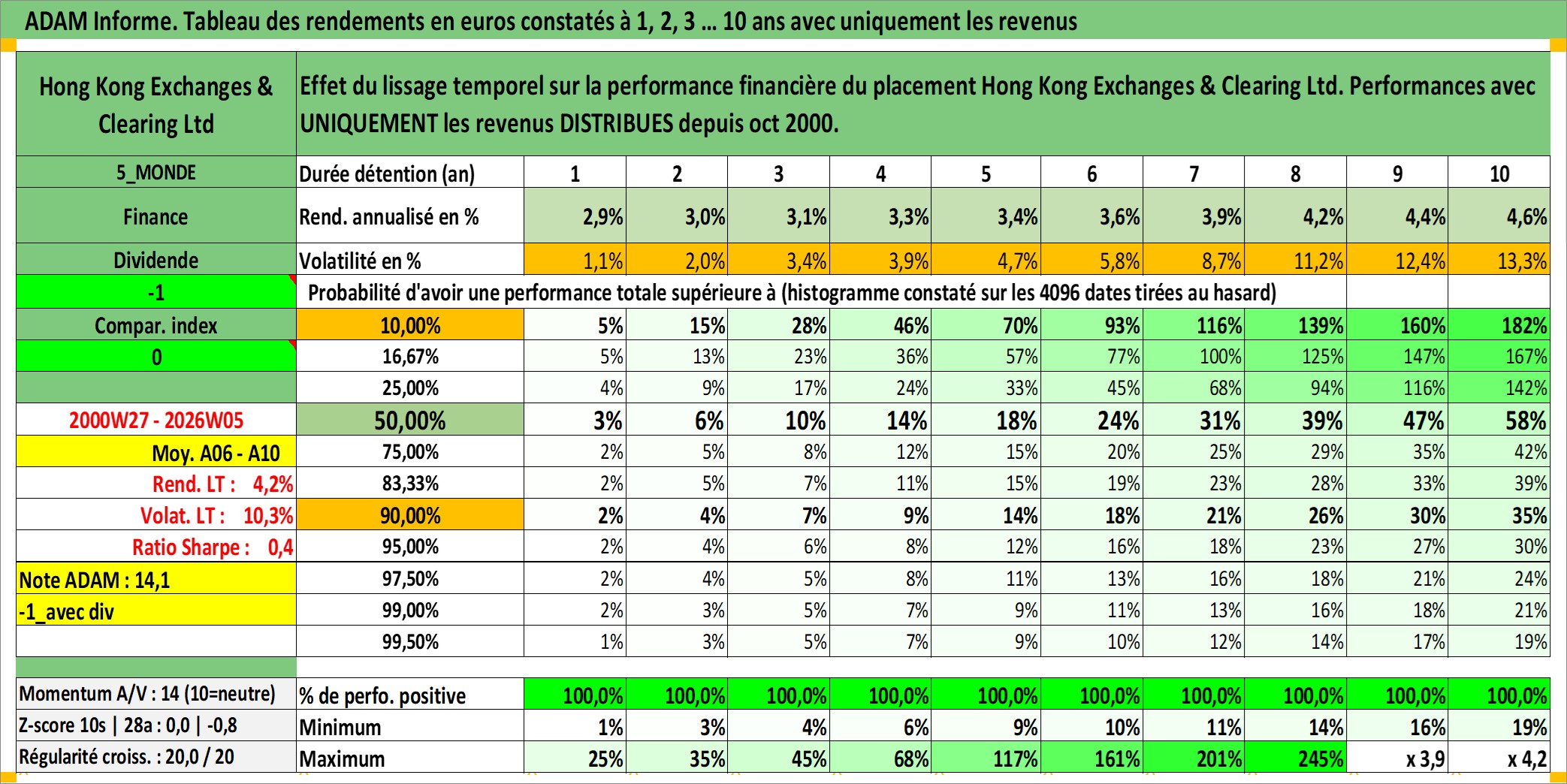 Site dédié aux investisseursPage dédiée sur site financeAnalyse des valorisations hebdomadaires de l'action Hong Kong Exchanges & Clearing Ltd. Cet actif est cote en HKD. Les valorisations sont en contrevaleur EURO et couvrent les semaines 2000W27 a 2026W05. Les revenus de cet actif financier sont pris en compte depuis la semaine 2000W40. La note globale ESG de cet actif est estimee a 12.0 (apres rebasage entre 0 et 20).