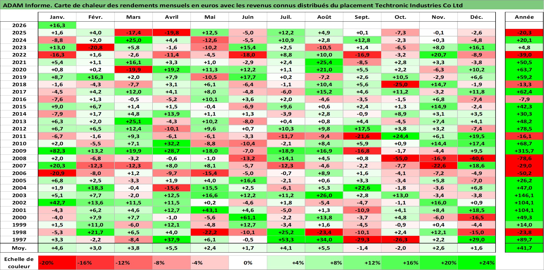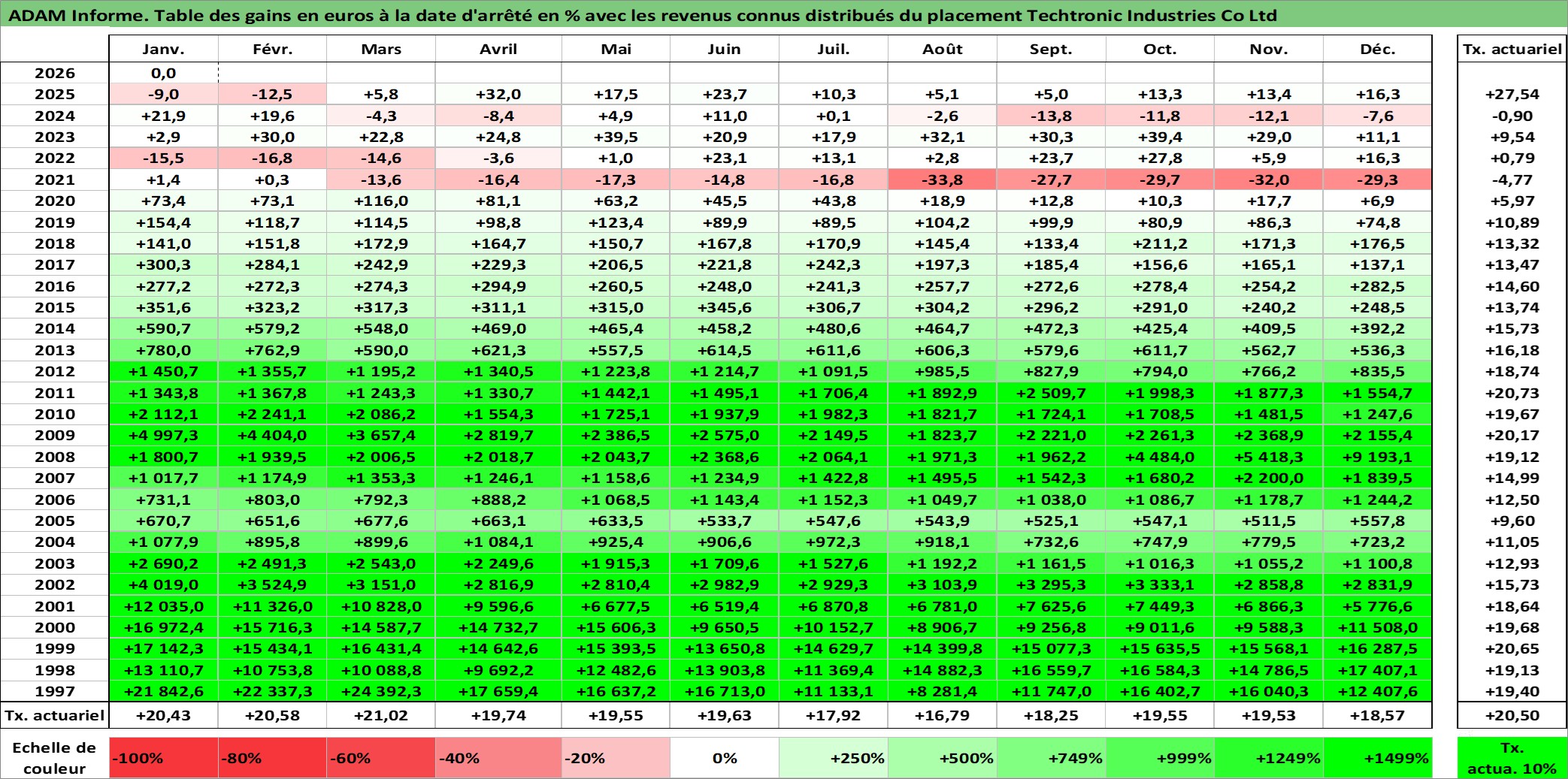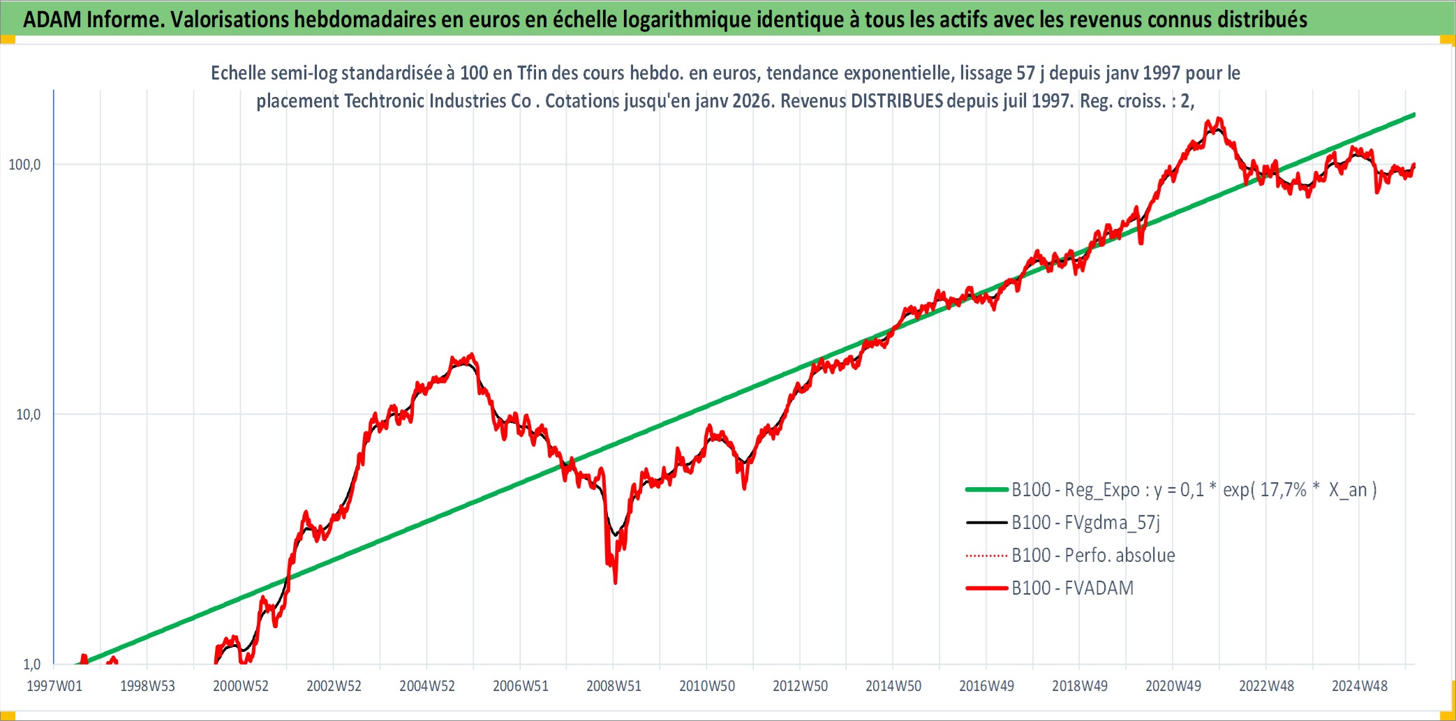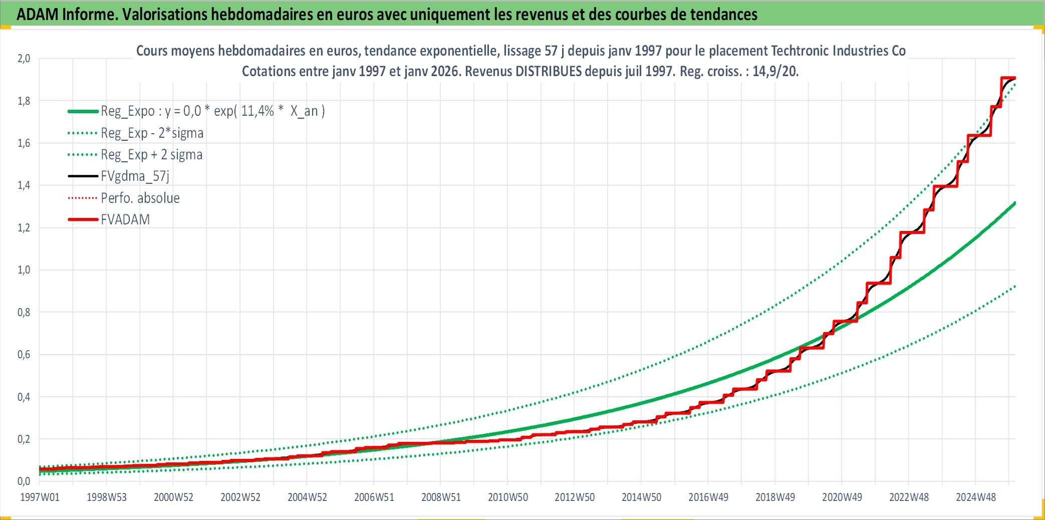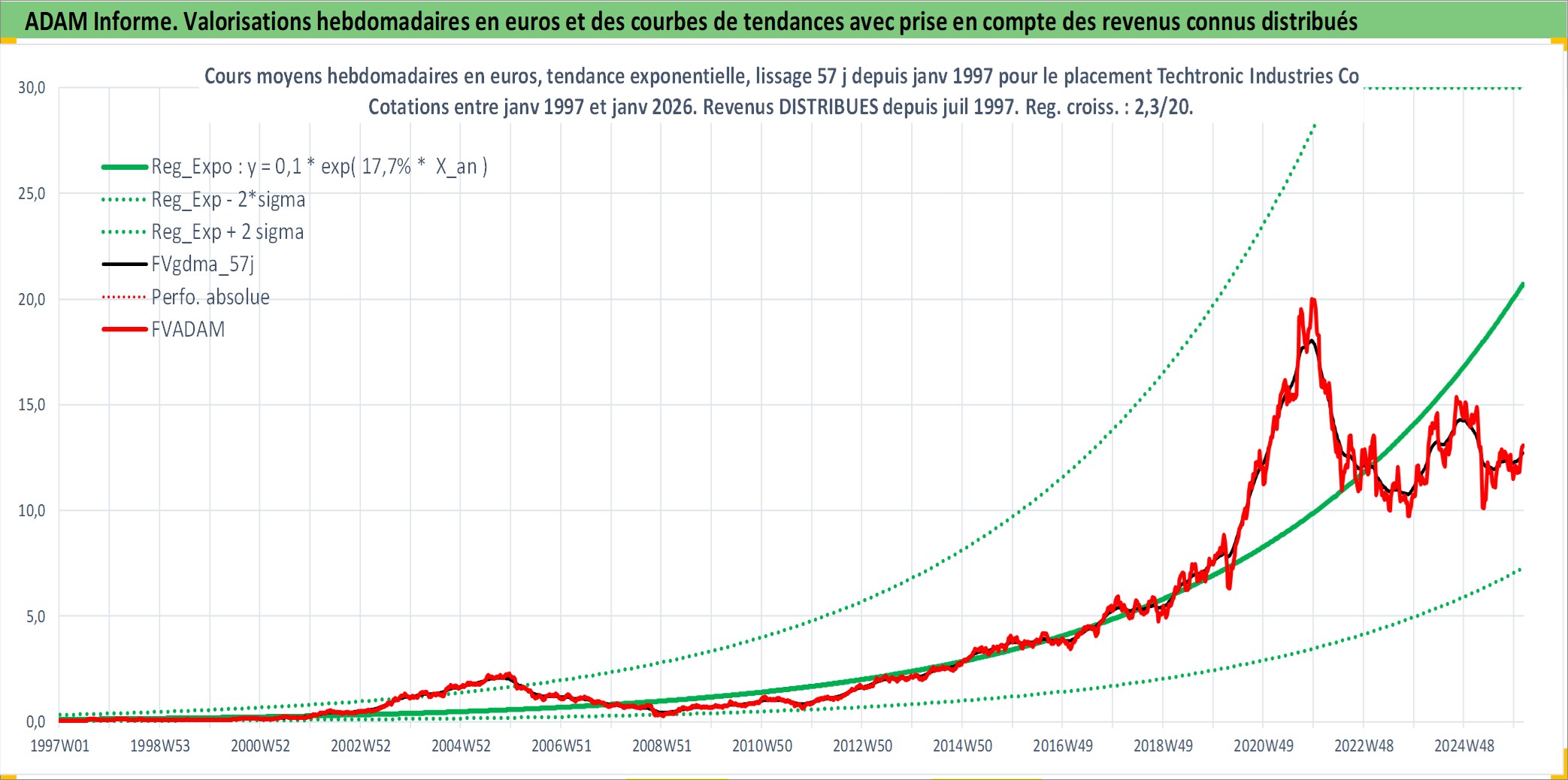 Site dédié aux investisseursPage dédiée sur site financeAnalyse des valorisations hebdomadaires de l'action Techtronic Industries Co Ltd. Cet actif est cote en HKD. Les valorisations sont en contrevaleur EURO et couvrent les semaines 1997W01 a 2026W05. Les revenus de cet actif financier sont pris en compte depuis la semaine 1997W28. La note globale ESG de cet actif est estimee a 9.0 (apres rebasage entre 0 et 20).