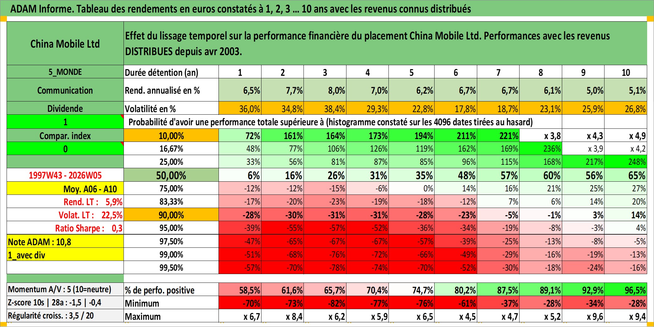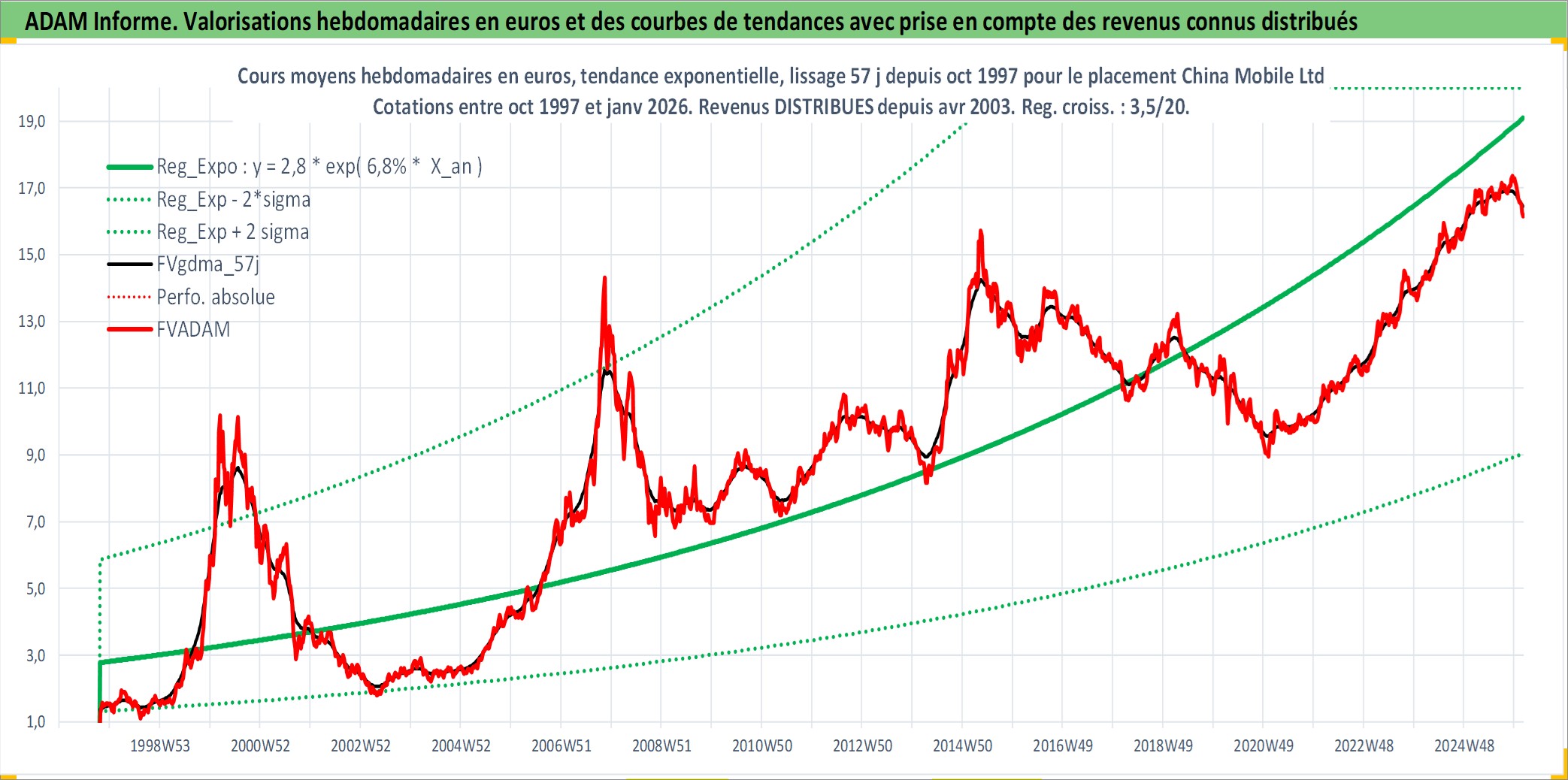 Site dédié aux investisseursPage dédiée sur site financeAnalyse des valorisations hebdomadaires de l'action China Mobile Ltd. Cet actif est cote en HKD. Les valorisations sont en contrevaleur EURO et couvrent les semaines 1997W43 a 2026W05. Les revenus de cet actif financier sont pris en compte depuis la semaine 2003W14. La note globale ESG de cet actif est estimee a 8.0 (apres rebasage entre 0 et 20).