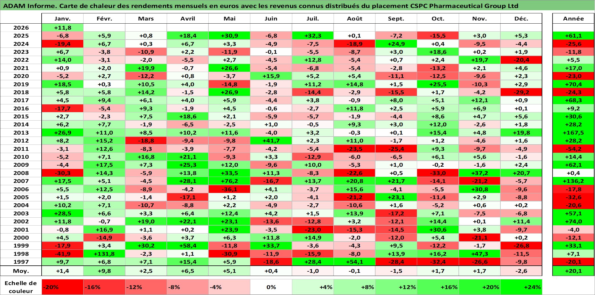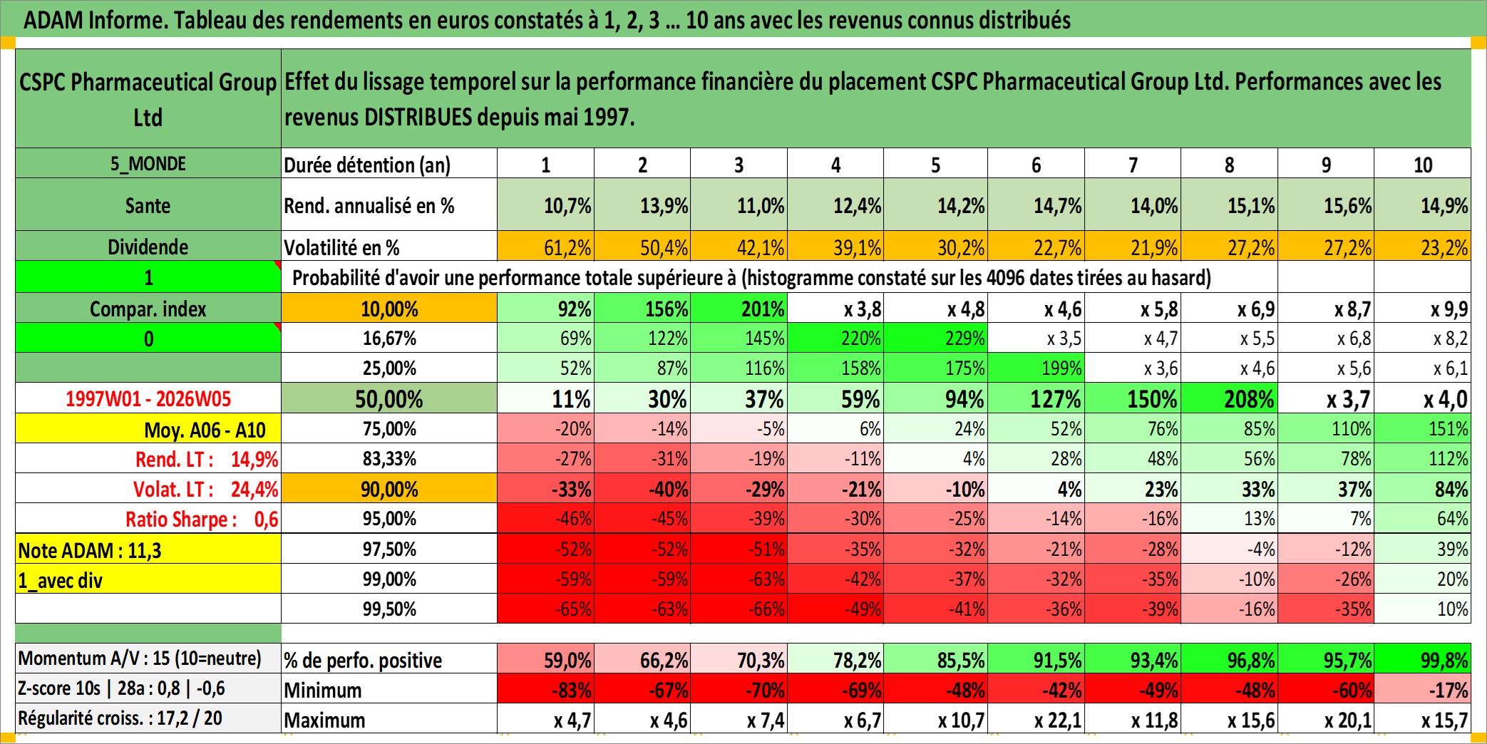 Site dédié aux investisseursPage dédiée sur site financeAnalyse des valorisations hebdomadaires de l'action CSPC Pharmaceutical Group Ltd. Cet actif est cote en HKD. Les valorisations sont en contrevaleur EURO et couvrent les semaines 1997W01 a 2026W05. Les revenus de cet actif financier sont pris en compte depuis la semaine 1997W22. La note globale ESG de cet actif est estimee a 4.0 (apres rebasage entre 0 et 20).