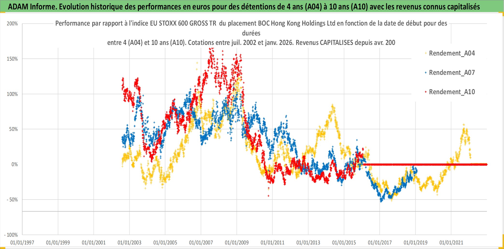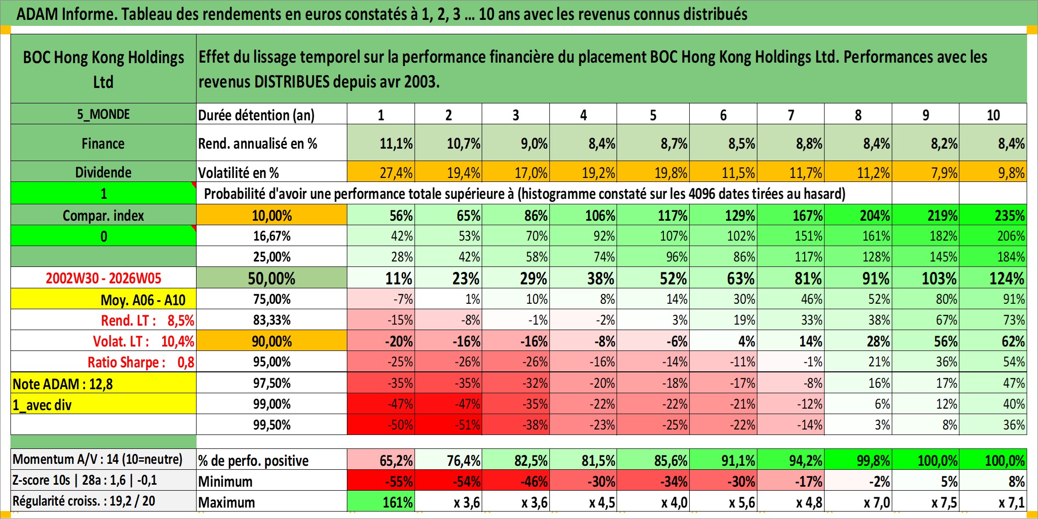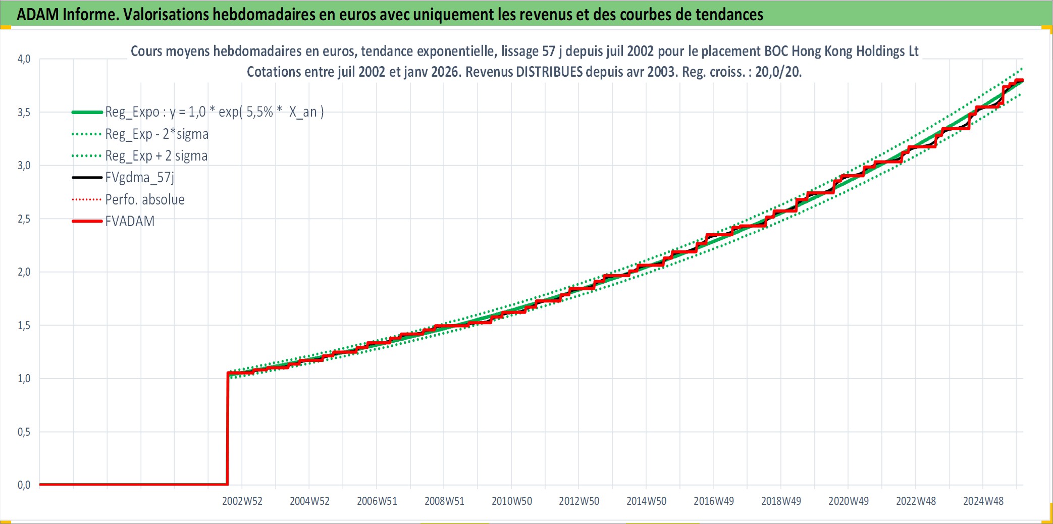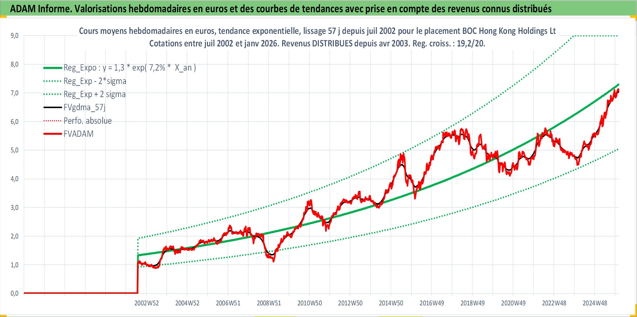 Site dédié aux investisseursPage dédiée sur site financeAnalyse des valorisations hebdomadaires de l'action BOC Hong Kong Holdings Ltd. Cet actif est cote en HKD. Les valorisations sont en contrevaleur EURO et couvrent les semaines 2002W30 a 2026W05. Les revenus de cet actif financier sont pris en compte depuis la semaine 2003W18. La note globale ESG de cet actif est estimee a 9.0 (apres rebasage entre 0 et 20).