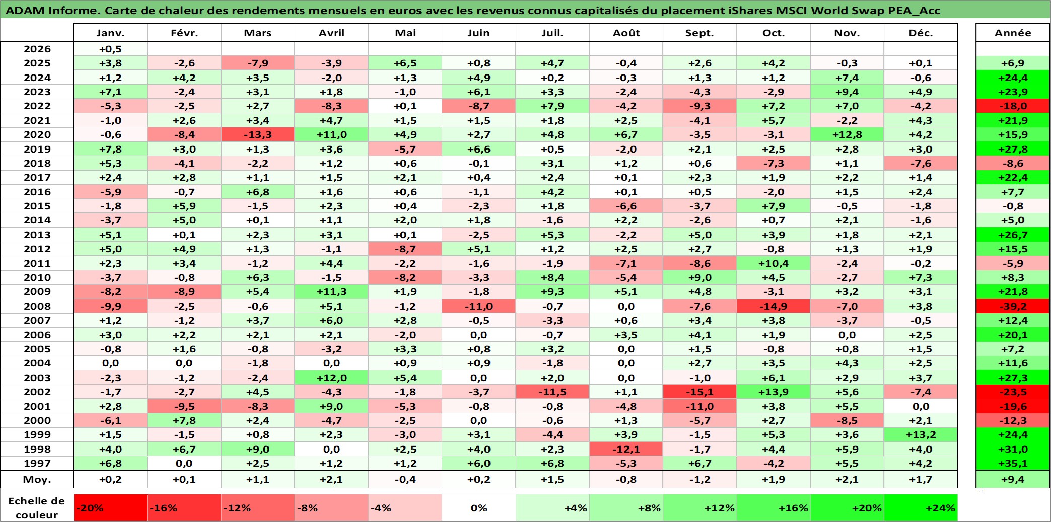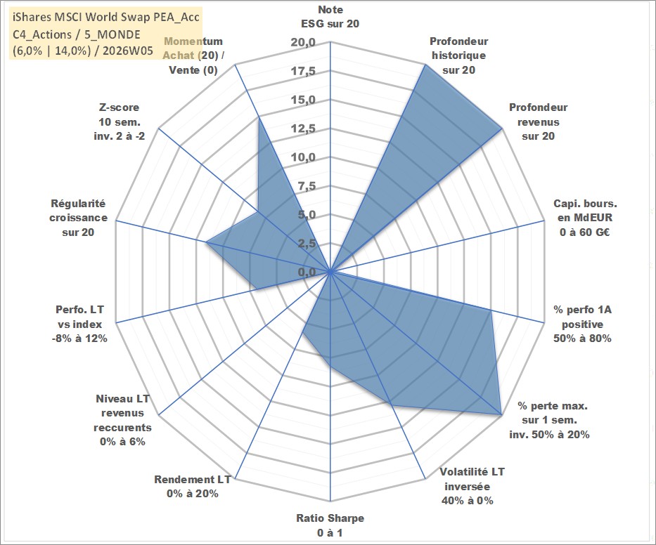 Site dédié aux investisseursPage dédiée sur site financeAnalyse des valorisations hebdomadaires du fonds iShares MSCI World Swap PEA_Acc. Cet actif est cote en EUR. Les valorisations couvrent les semaines 1997W01 a 2026W05. Les revenus de cet actif financier sont pris en compte depuis la semaine 1997W01. La note ESG de cet actif n'est pas connue.