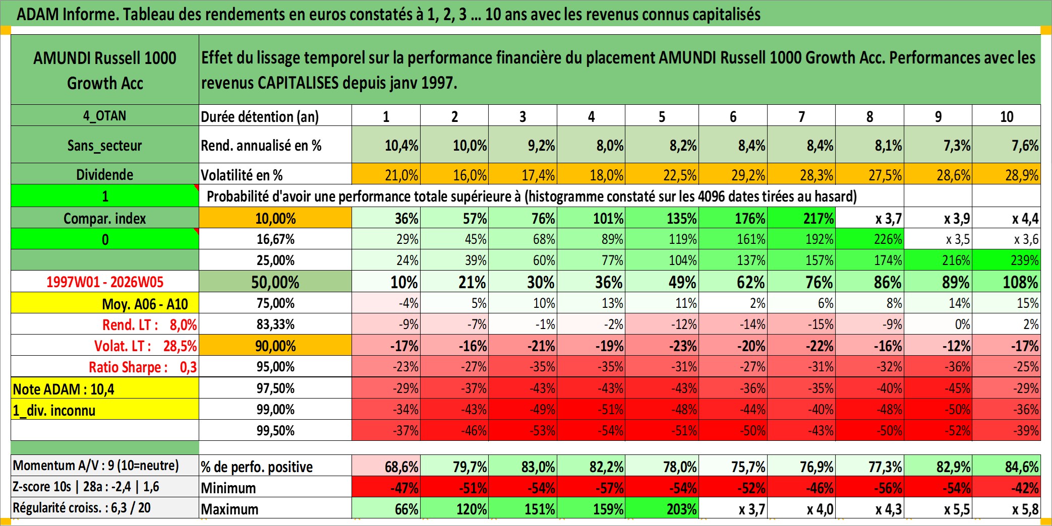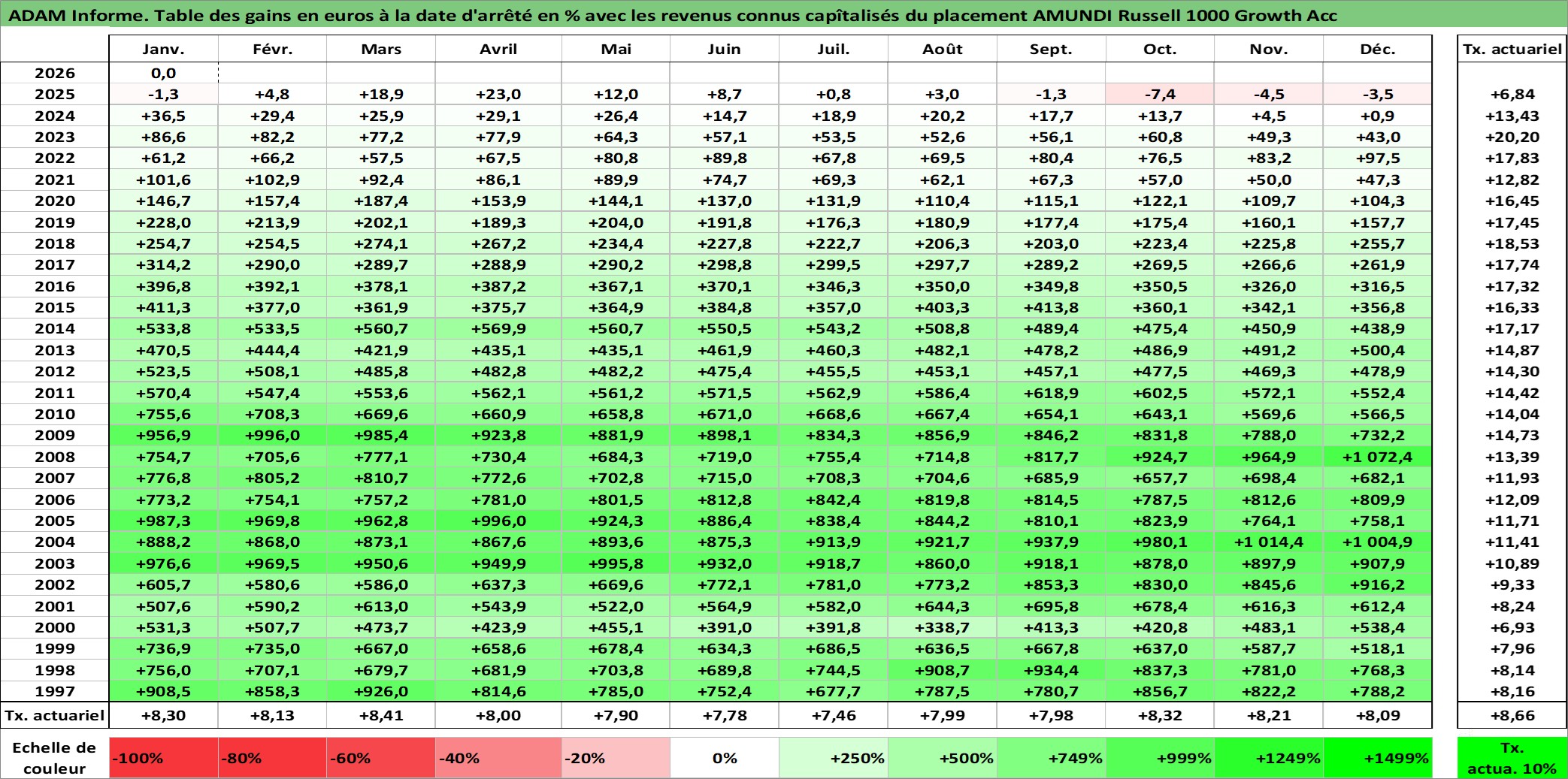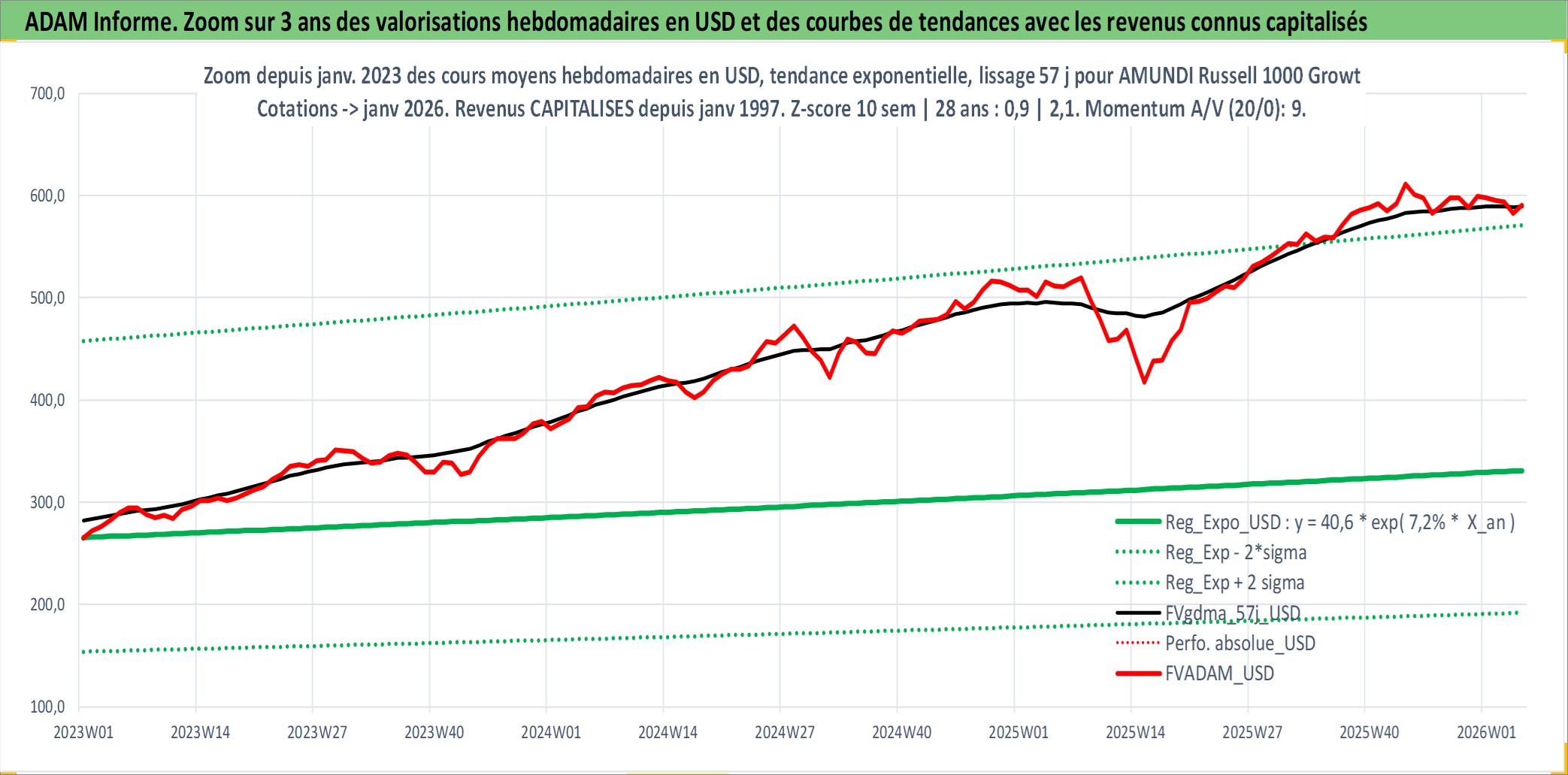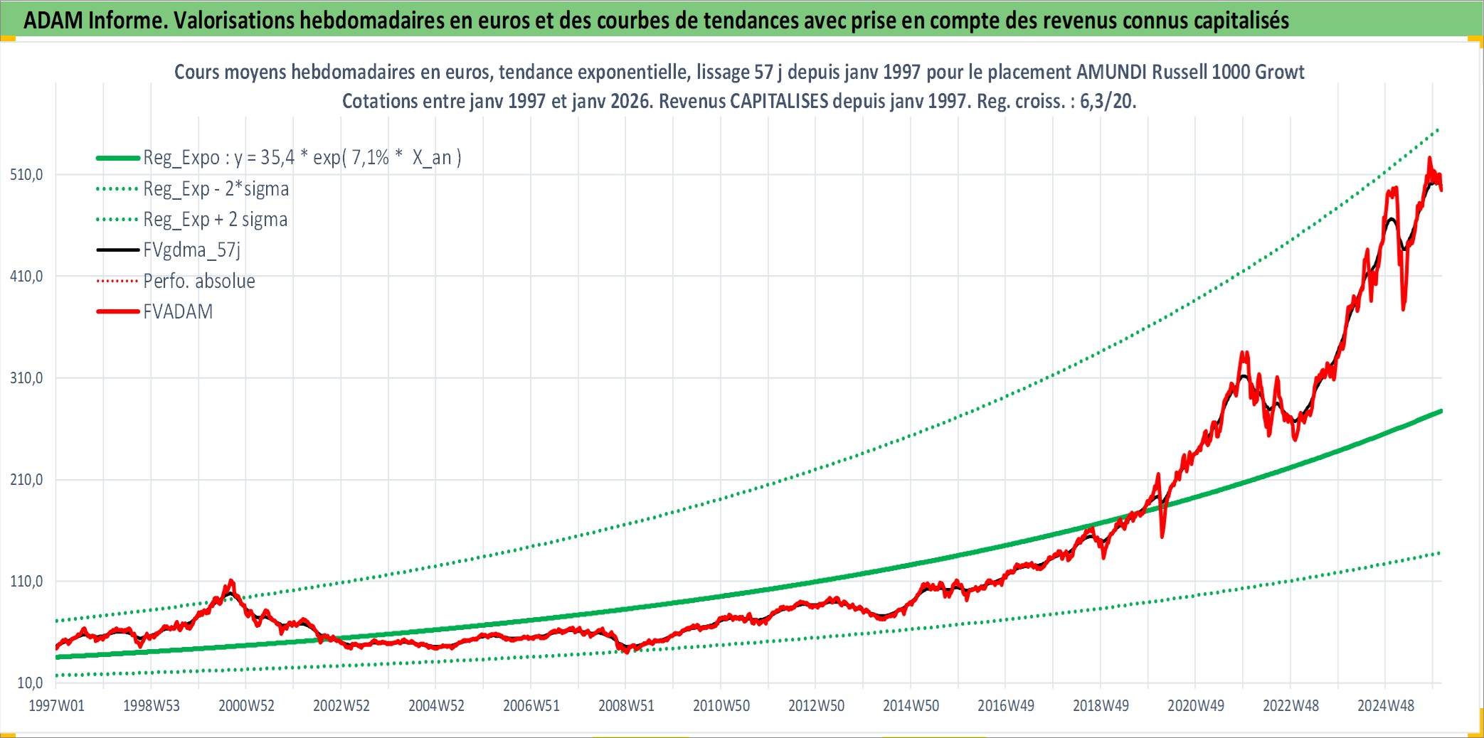 Site dédié aux investisseursPage dédiée sur site financeAnalyse des valorisations hebdomadaires du fonds AMUNDI Russell 1000 Growth Acc. Cet actif est cote en USD. Les valorisations sont en contrevaleur EURO et couvrent les semaines 1997W01 a 2026W05. Les revenus de cet actif financier sont pris en compte depuis la semaine 1997W01. La note ESG de cet actif n'est pas connue.