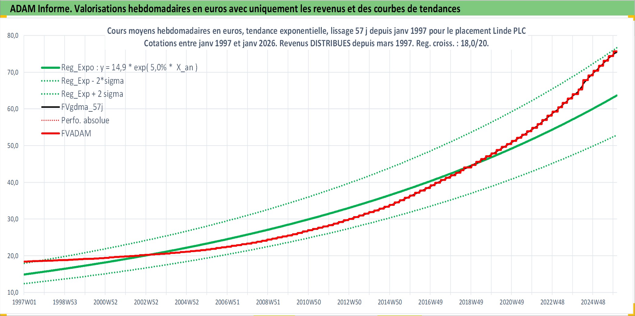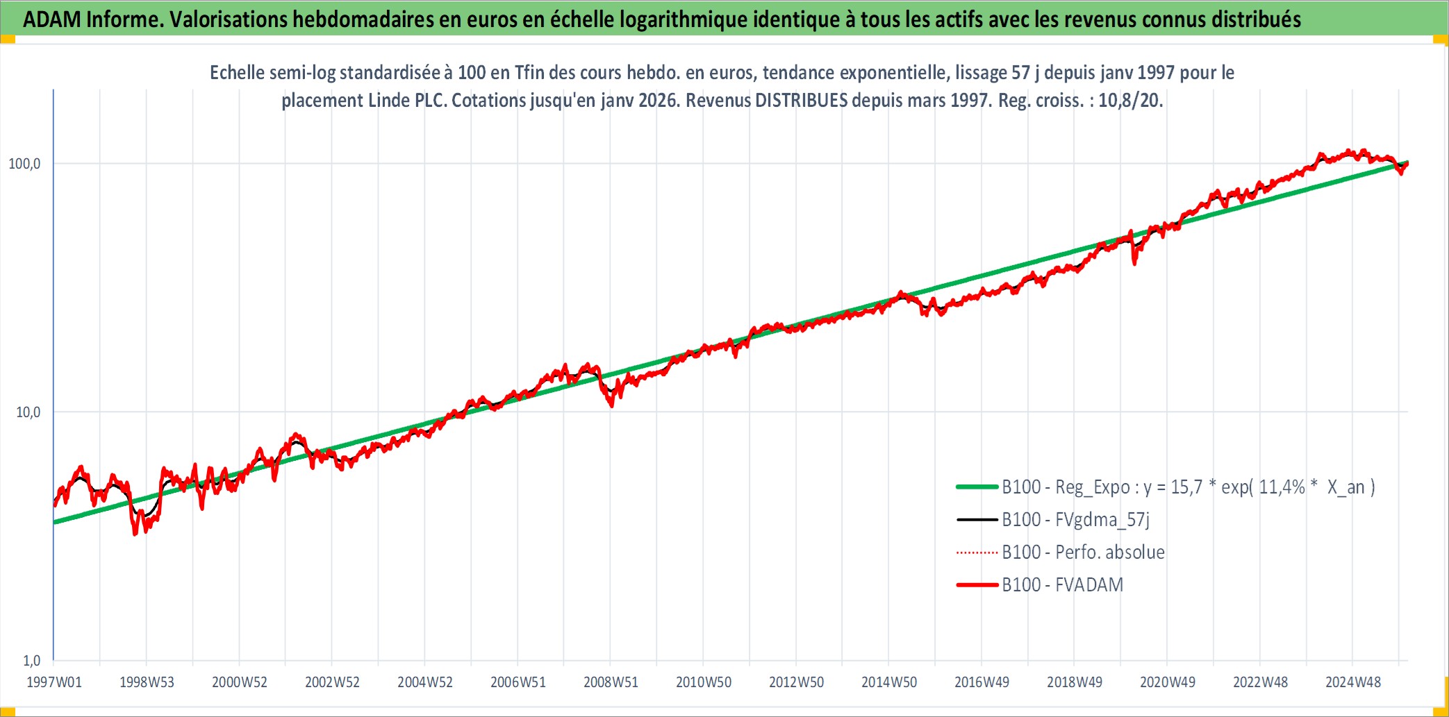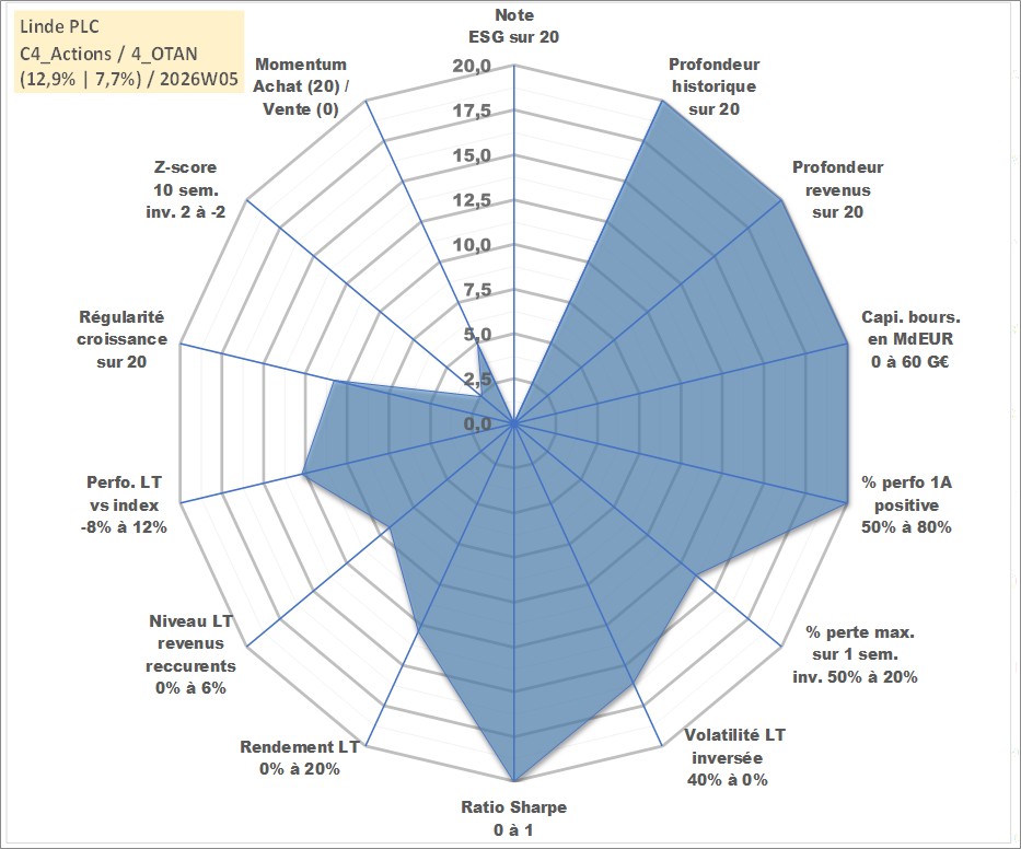 Site dédié aux investisseursPage dédiée sur site financeAnalyse des valorisations hebdomadaires de l'action Linde PLC. Cet actif est cote en USD. Les valorisations sont en contrevaleur EURO et couvrent les semaines 1997W01 a 2026W05. Les revenus de cet actif financier sont pris en compte depuis la semaine 1997W10. La note ESG de cet actif n'est pas connue.
