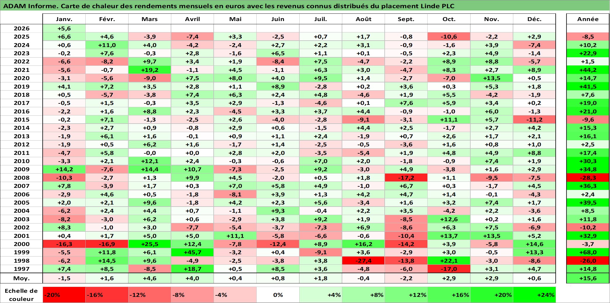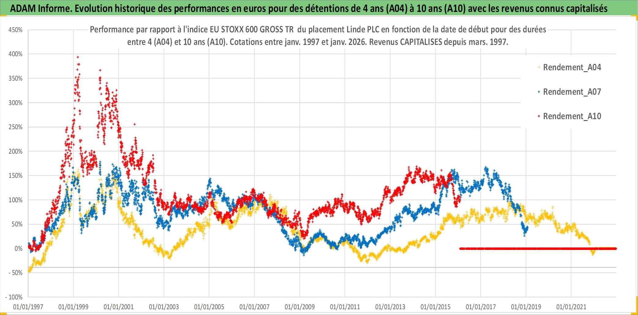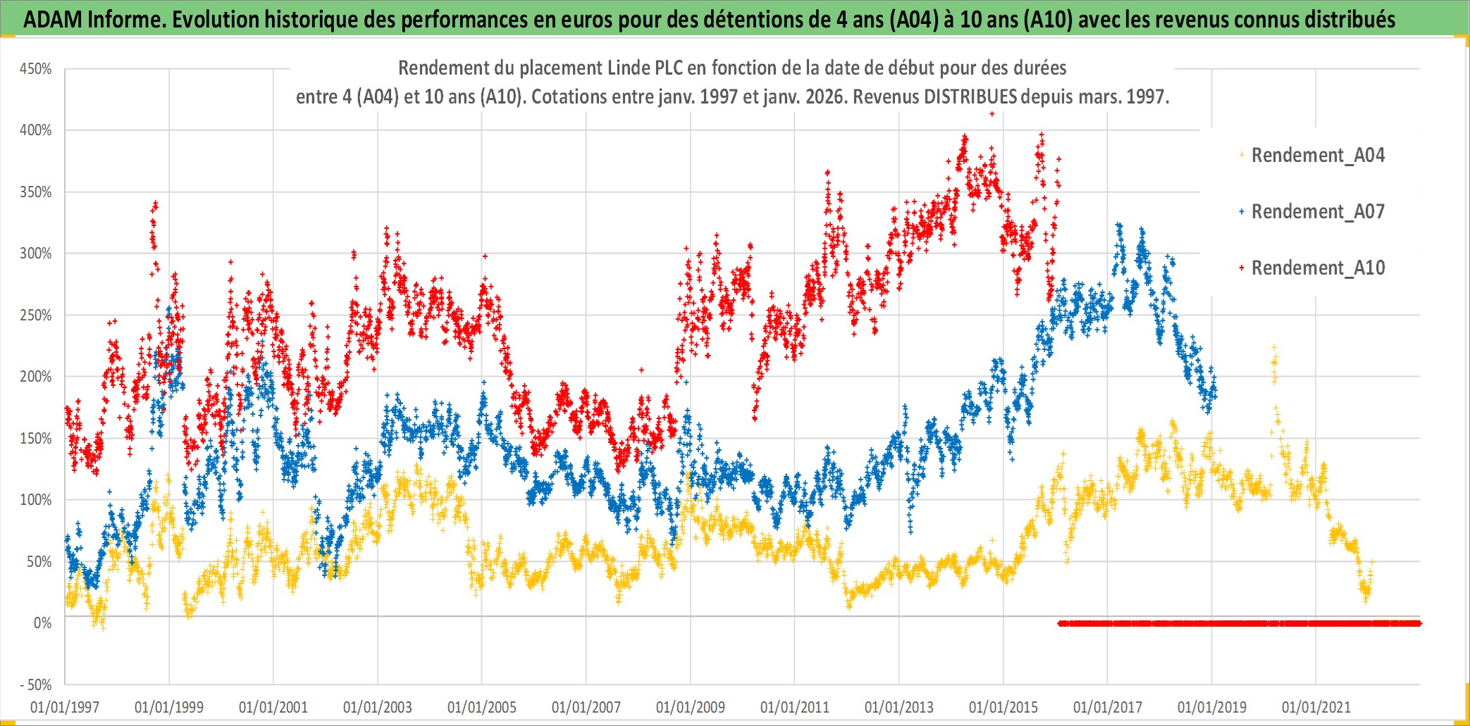 Site dédié aux investisseursPage dédiée sur site financeAnalyse des valorisations hebdomadaires de l'action Linde PLC. Cet actif est cote en USD. Les valorisations sont en contrevaleur EURO et couvrent les semaines 1997W01 a 2026W05. Les revenus de cet actif financier sont pris en compte depuis la semaine 1997W10. La note ESG de cet actif n'est pas connue.