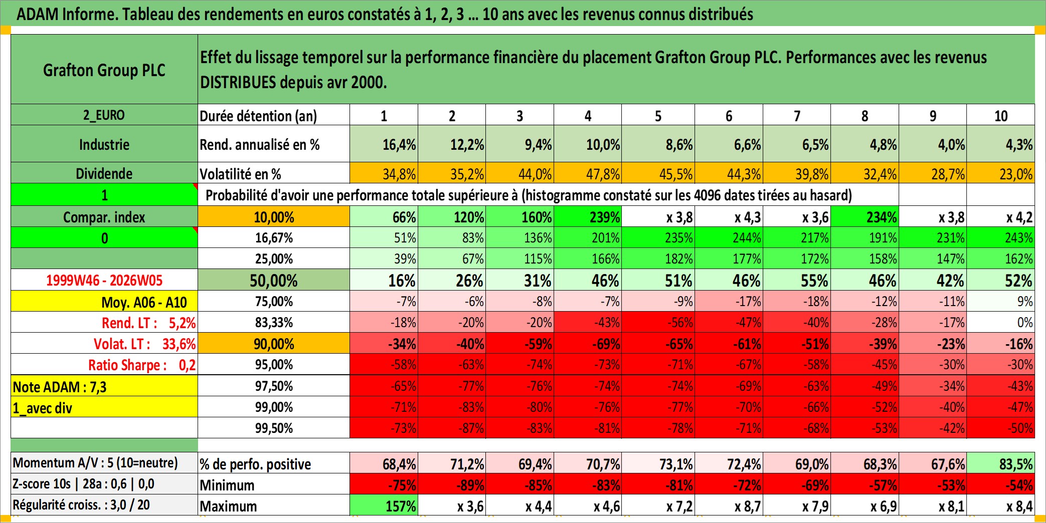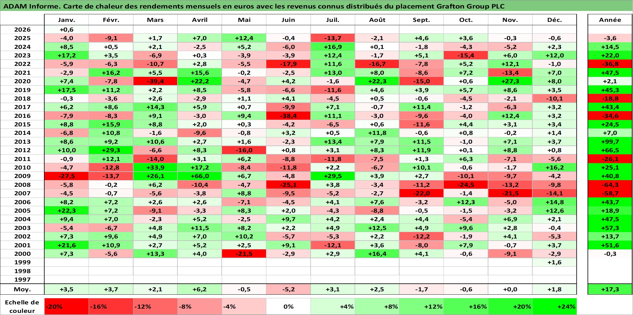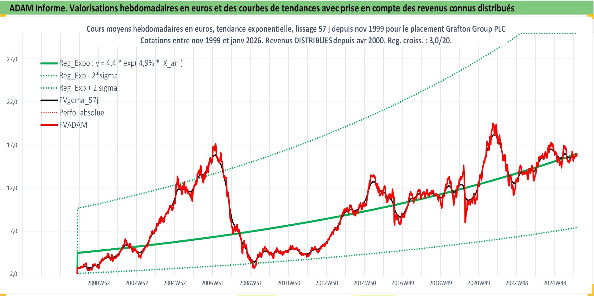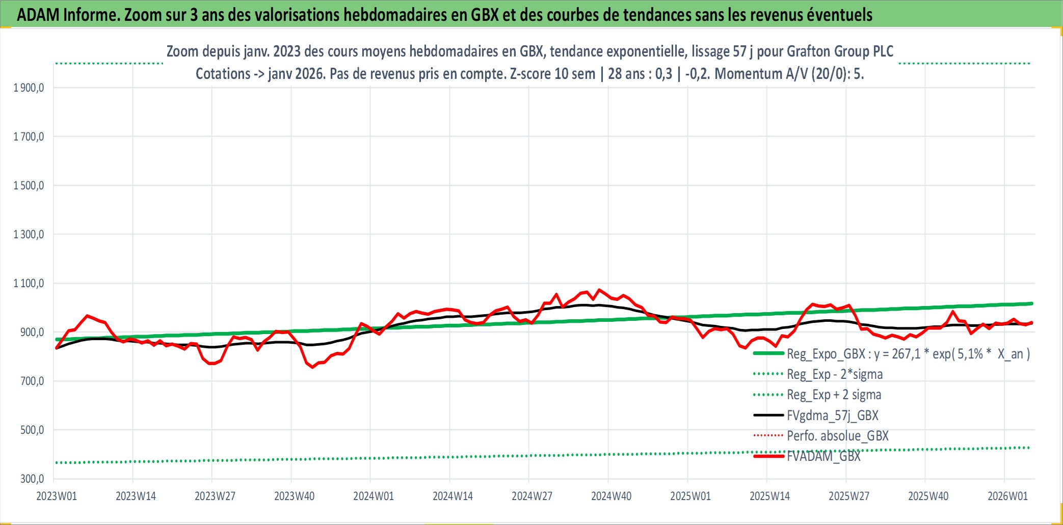 Site dédié aux investisseursPage dédiée sur site financeAnalyse des valorisations hebdomadaires de l'action Grafton Group PLC. Cet actif est cote en GBX. Les valorisations sont en contrevaleur EURO et couvrent les semaines 1999W46 a 2026W05. Les revenus de cet actif financier sont pris en compte depuis la semaine 2000W14. La note ESG de cet actif n'est pas connue.