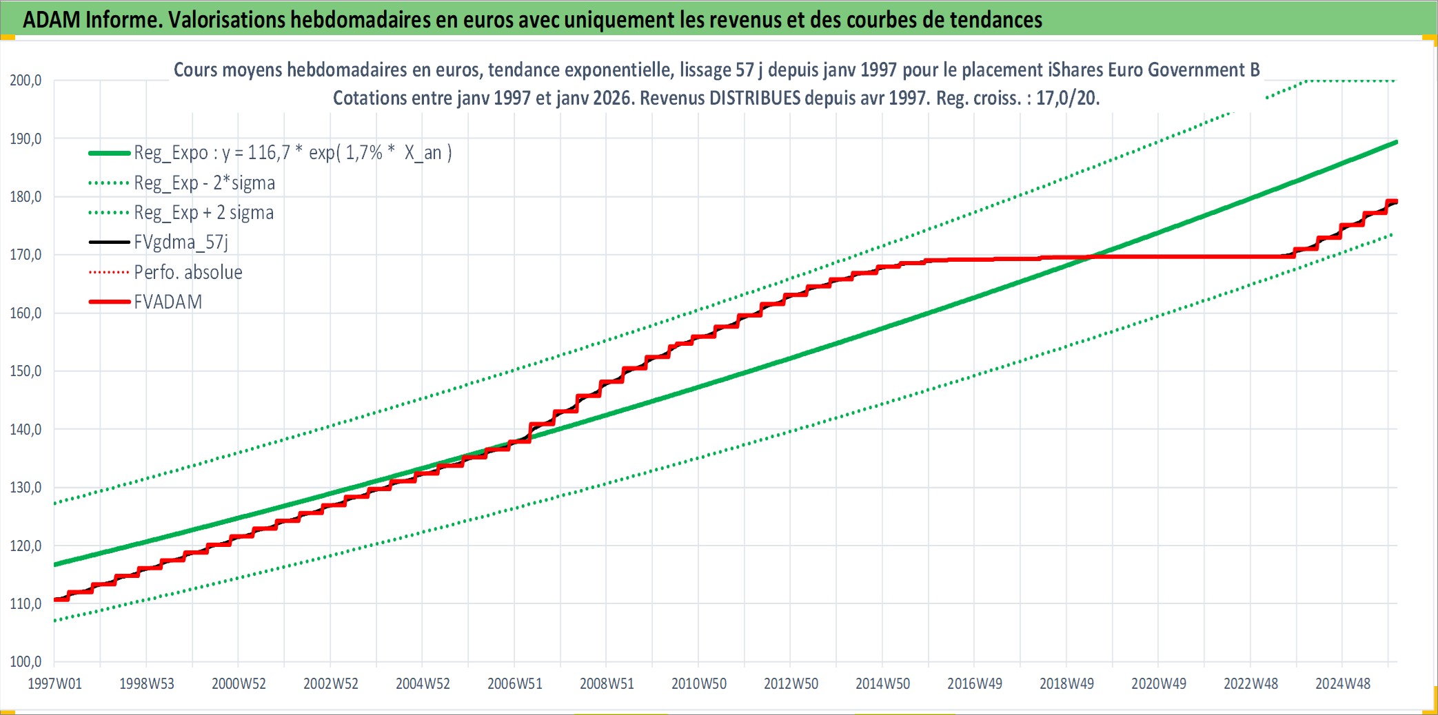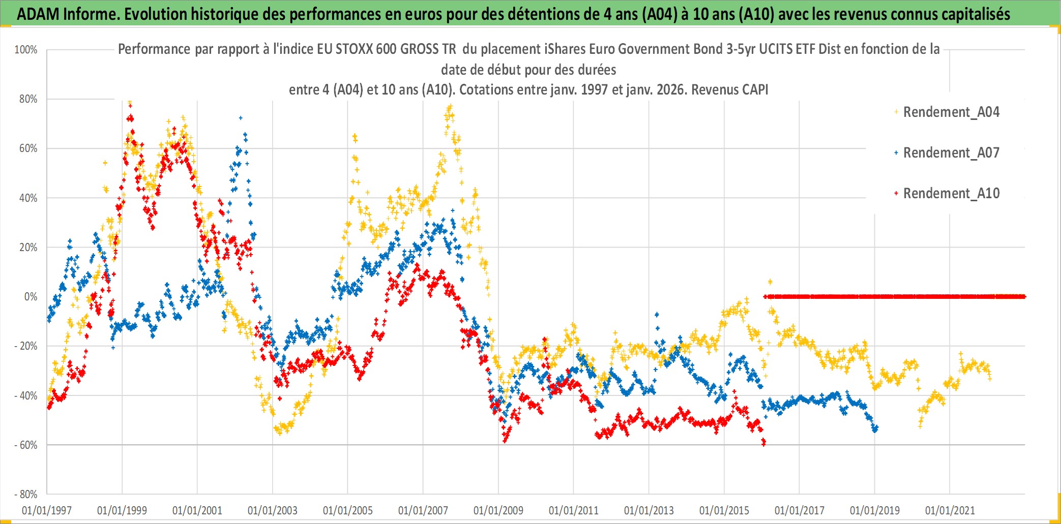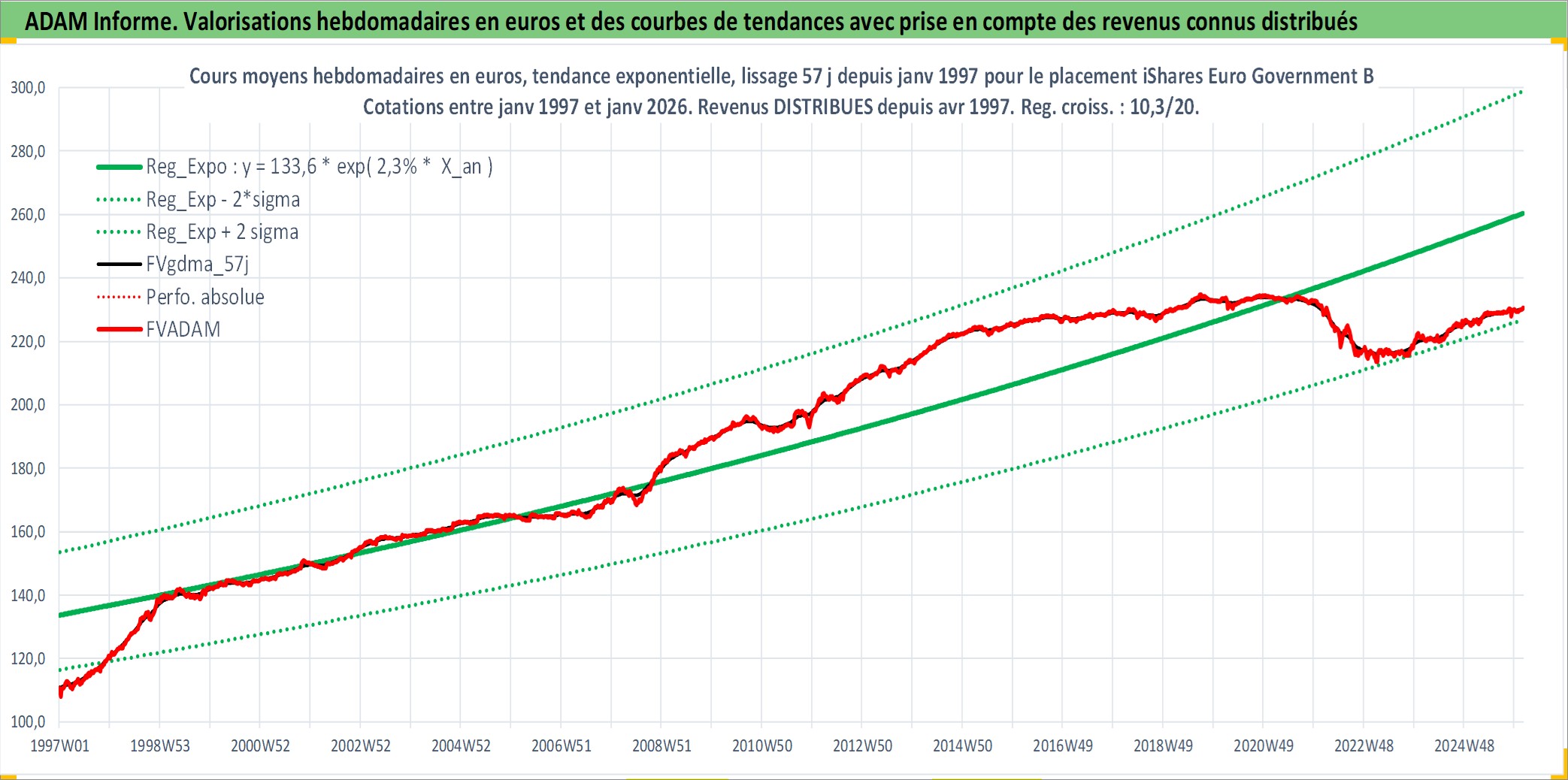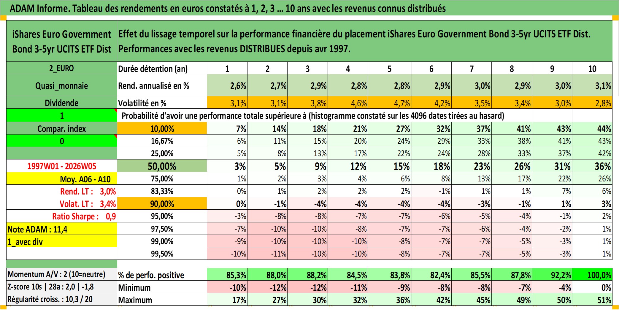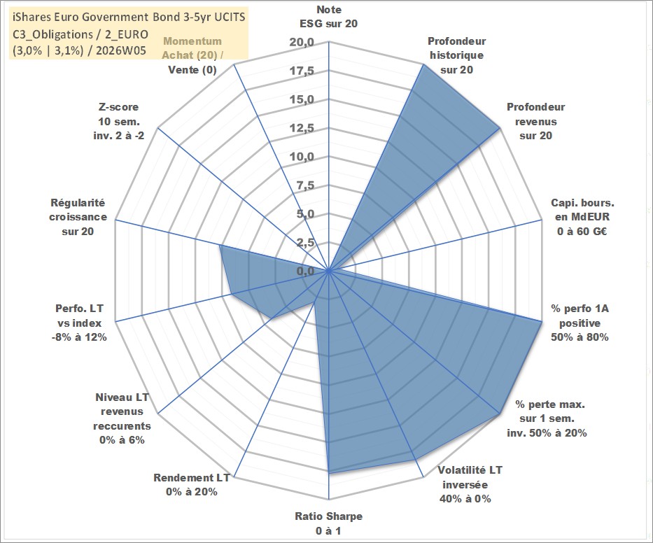 Site dédié aux investisseursPage dédiée sur site financeAnalyse des valorisations hebdomadaires du fonds iShares Euro Government Bond 3-5yr UCITS ETF Dist. Cet actif est cote en EUR. Les valorisations couvrent les semaines 1997W01 a 2026W05. Les revenus de cet actif financier sont pris en compte depuis la semaine 1997W17. La note ESG de cet actif n'est pas connue.