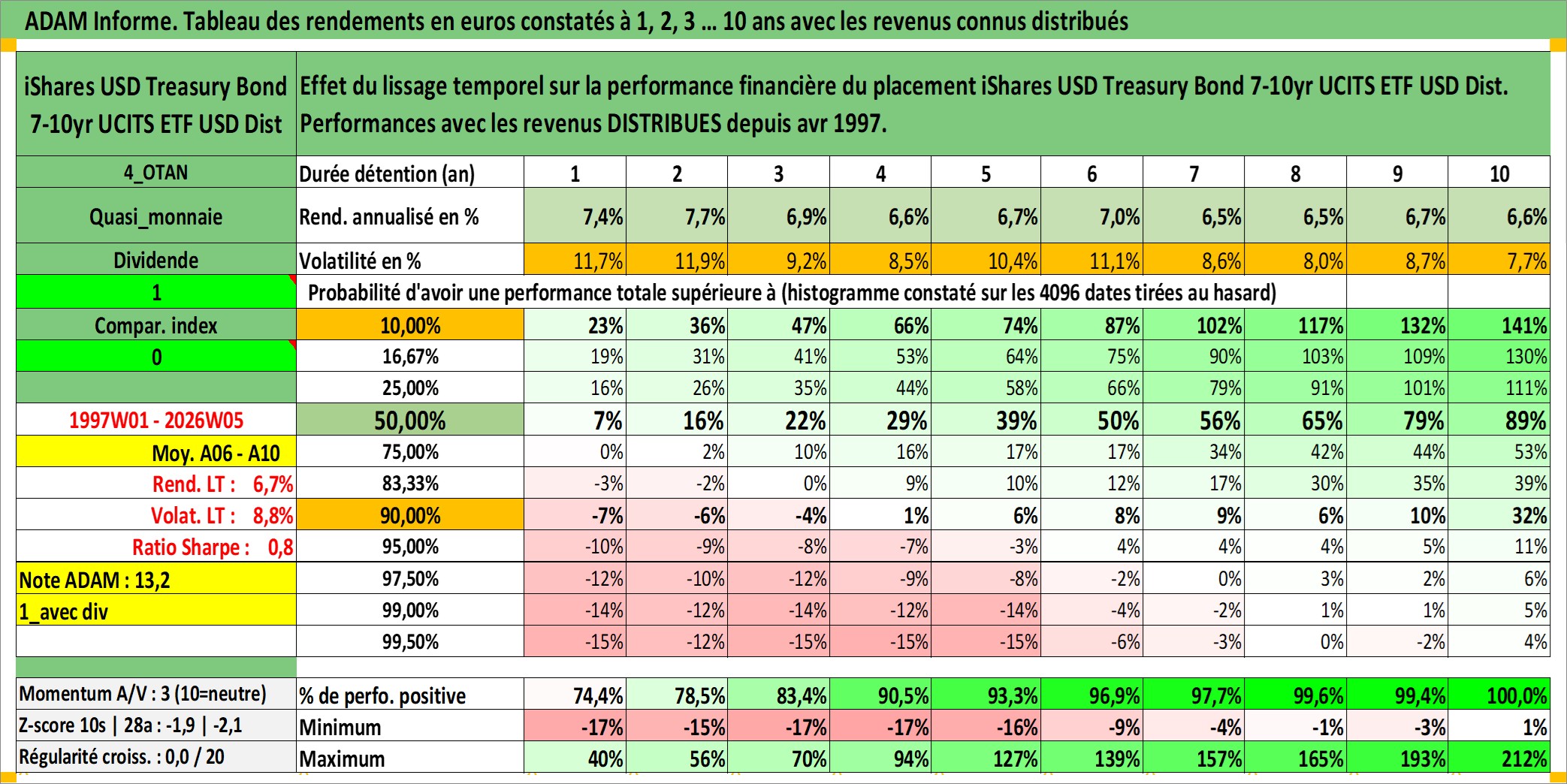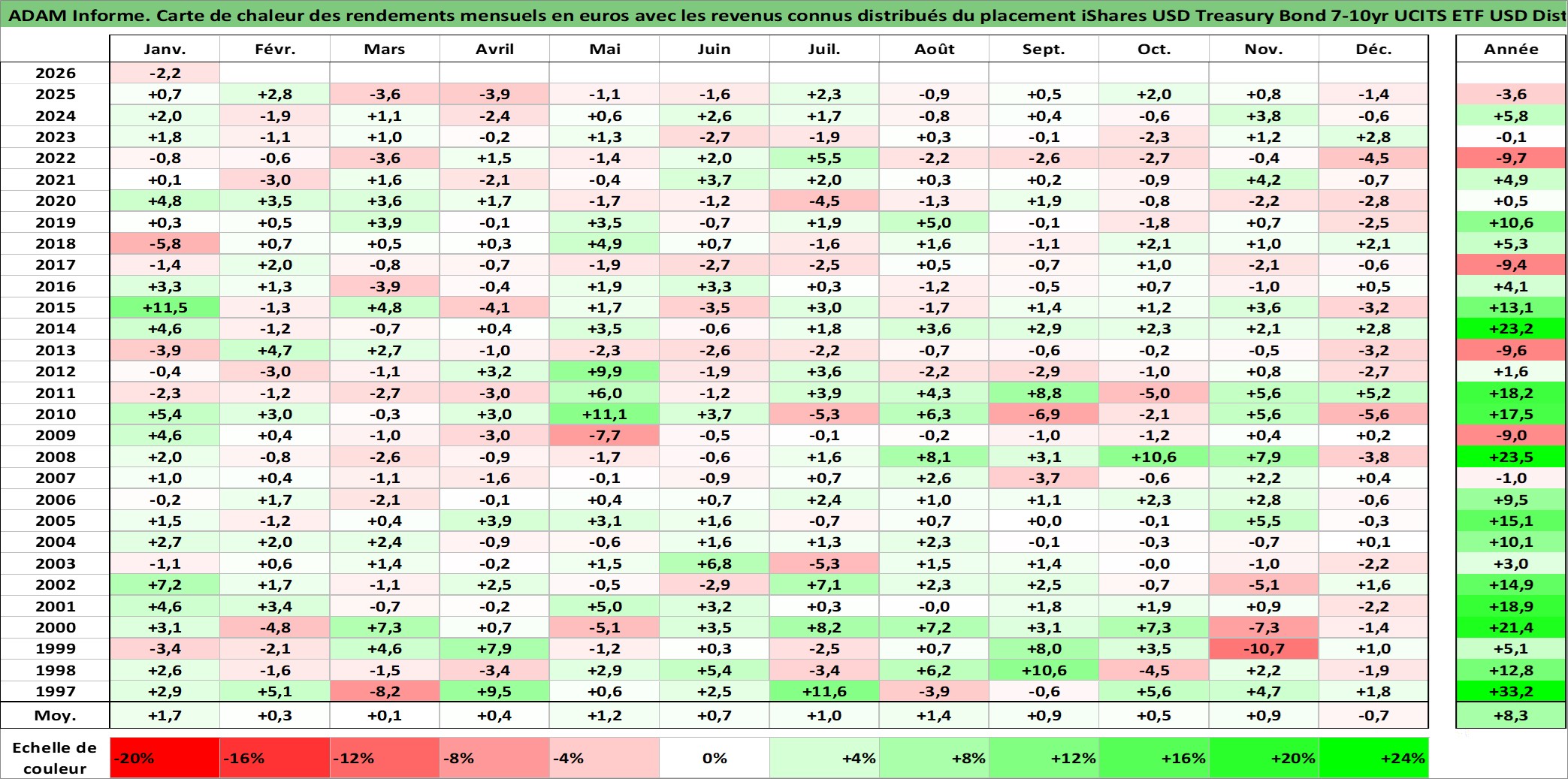 Site dédié aux investisseursPage dédiée sur site financeAnalyse des valorisations hebdomadaires du fonds iShares USD Treasury Bond 7-10yr UCITS ETF USD Dist. Cet actif est cote en USD. Les valorisations sont en contrevaleur EURO et couvrent les semaines 1997W01 a 2026W05. Les revenus de cet actif financier sont pris en compte depuis la semaine 1997W17. La note ESG de cet actif n'est pas connue.