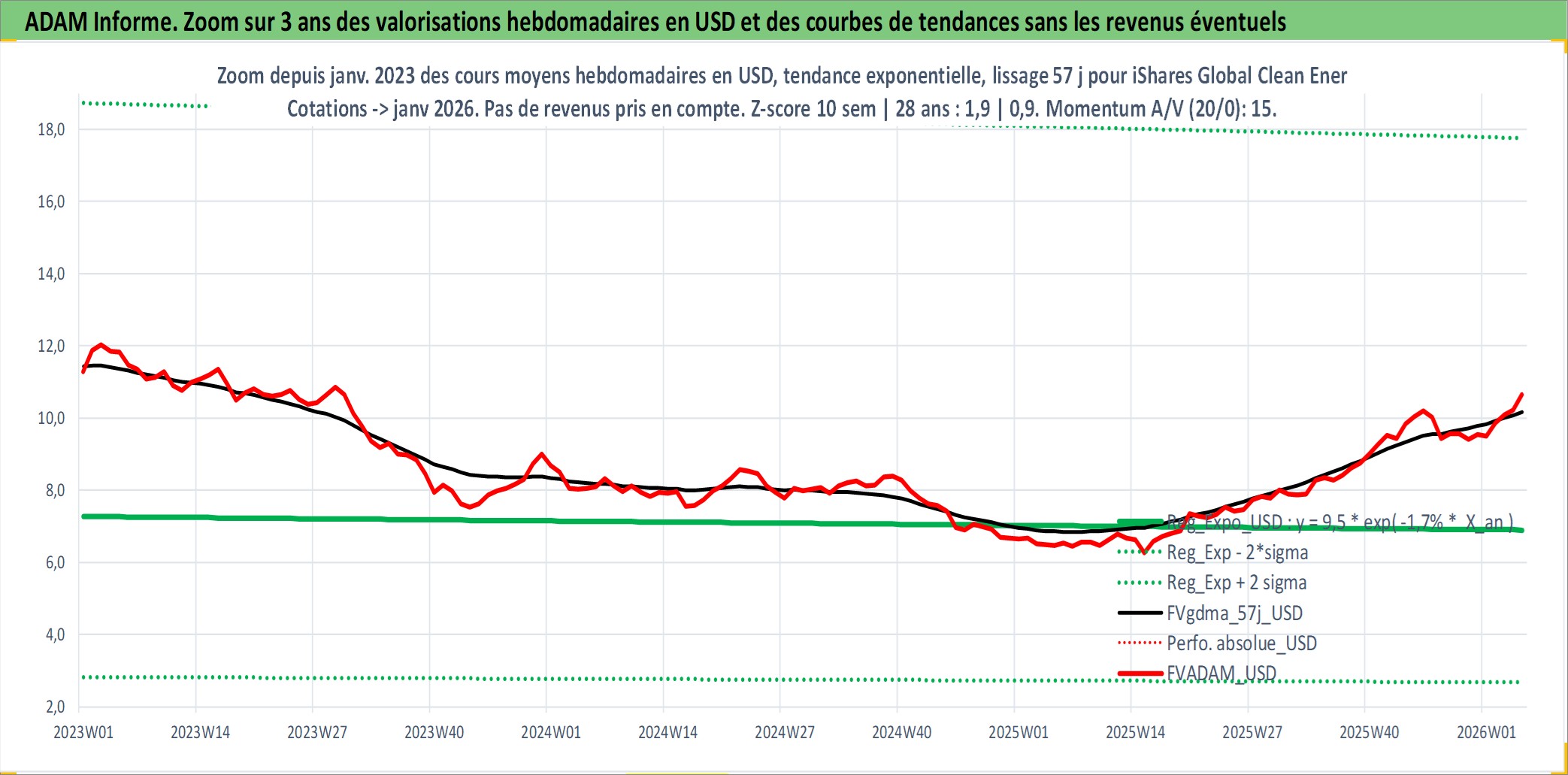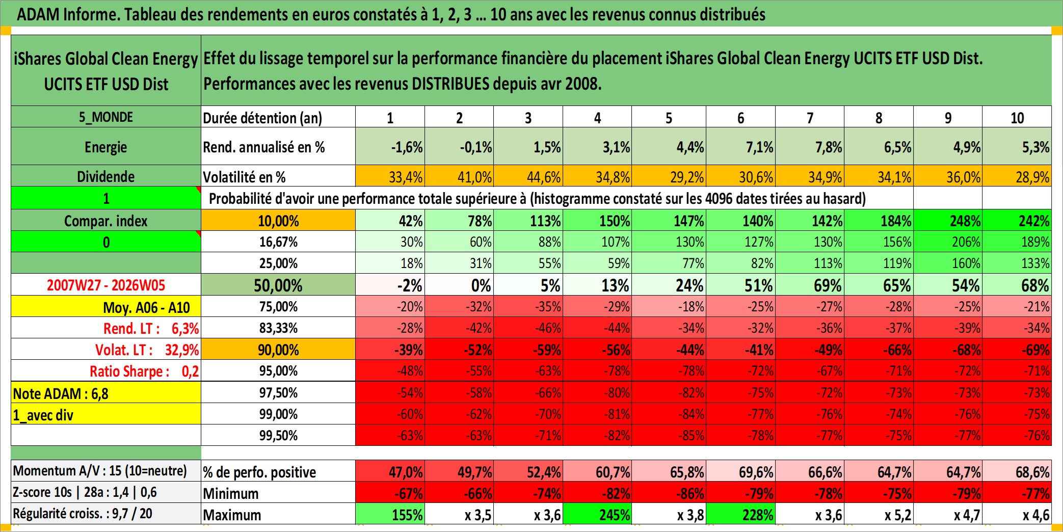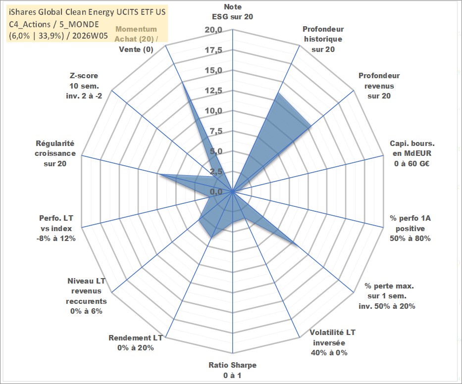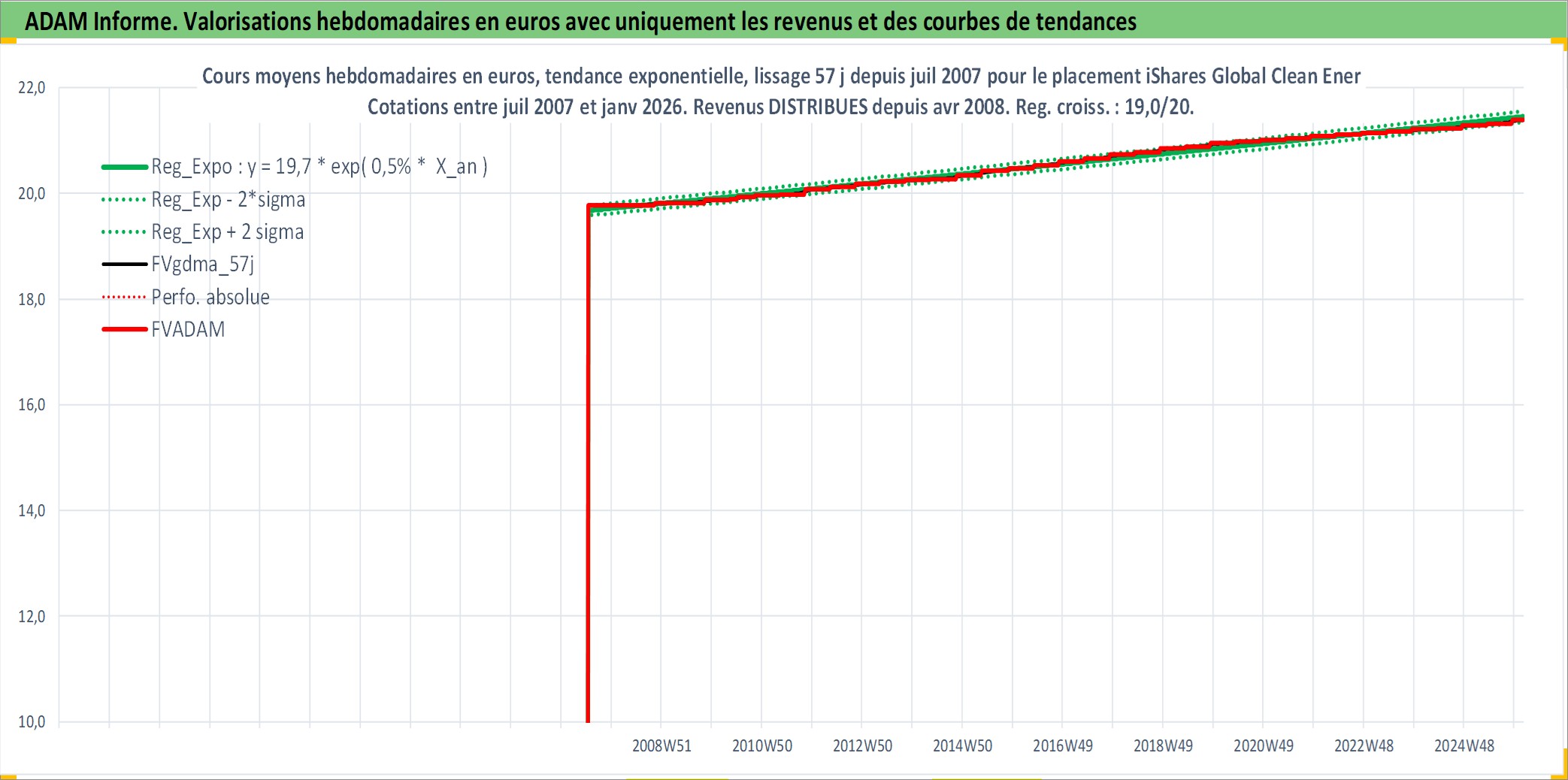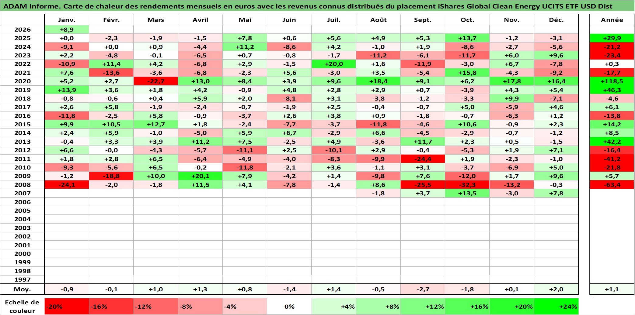 Site dédié aux investisseursPage dédiée sur site financeAnalyse des valorisations hebdomadaires du fonds iShares Global Clean Energy UCITS ETF USD Dist. Cet actif est cote en USD. Les valorisations sont en contrevaleur EURO et couvrent les semaines 2007W27 a 2026W05. Les revenus de cet actif financier sont pris en compte depuis la semaine 2008W18. La note ESG de cet actif n'est pas connue.