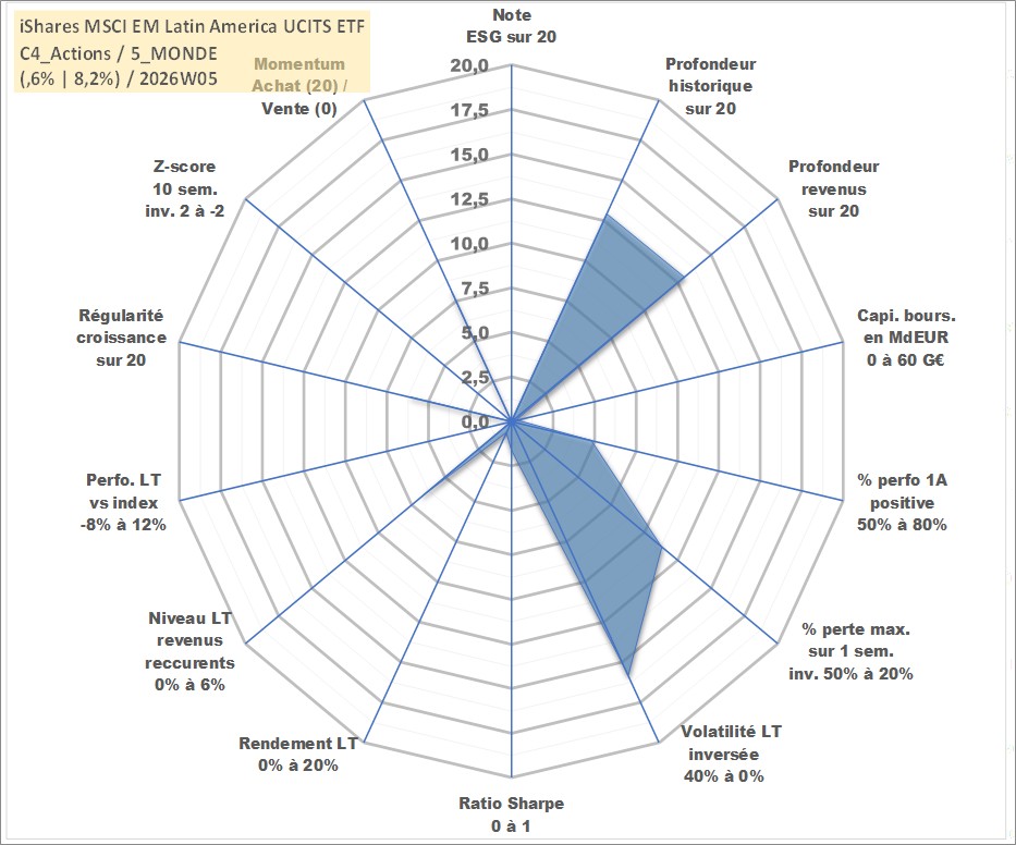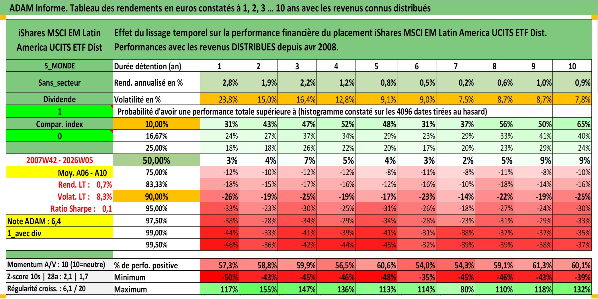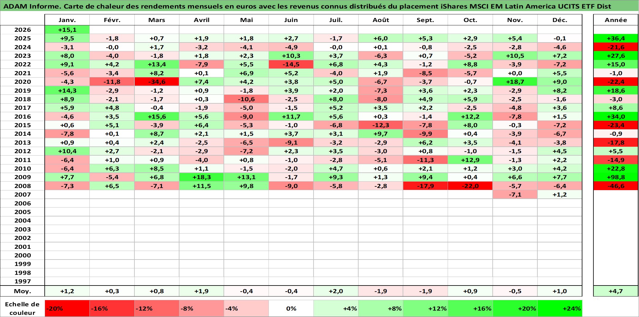 Site dédié aux investisseursPage dédiée sur site financeAnalyse des valorisations hebdomadaires du fonds iShares MSCI EM Latin America UCITS ETF Dist. Cet actif est cote en USD. Les valorisations sont en contrevaleur EURO et couvrent les semaines 2007W42 a 2026W05. Les revenus de cet actif financier sont pris en compte depuis la semaine 2008W18. La note ESG de cet actif n'est pas connue.