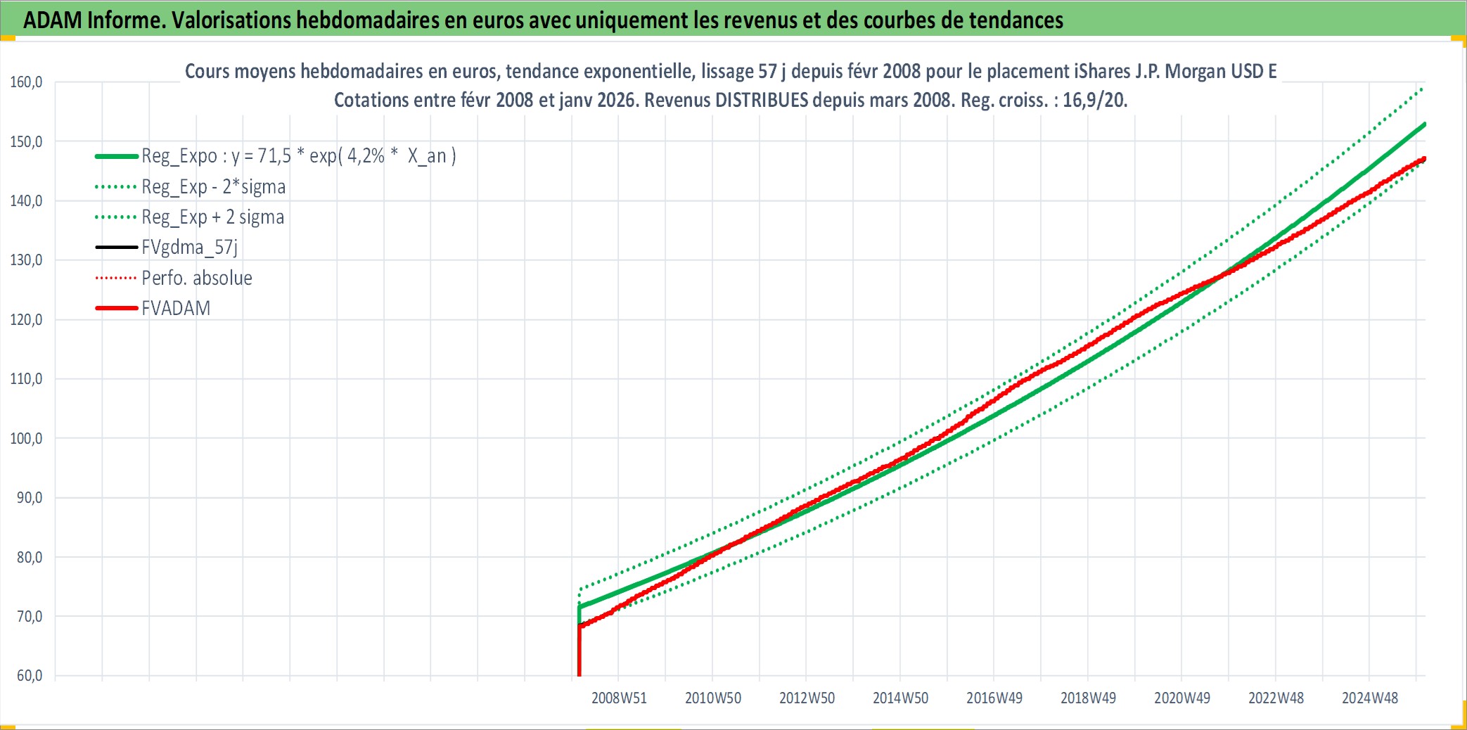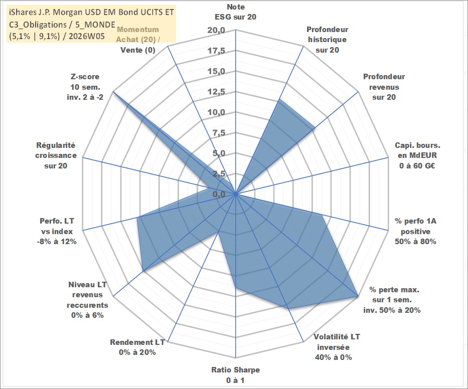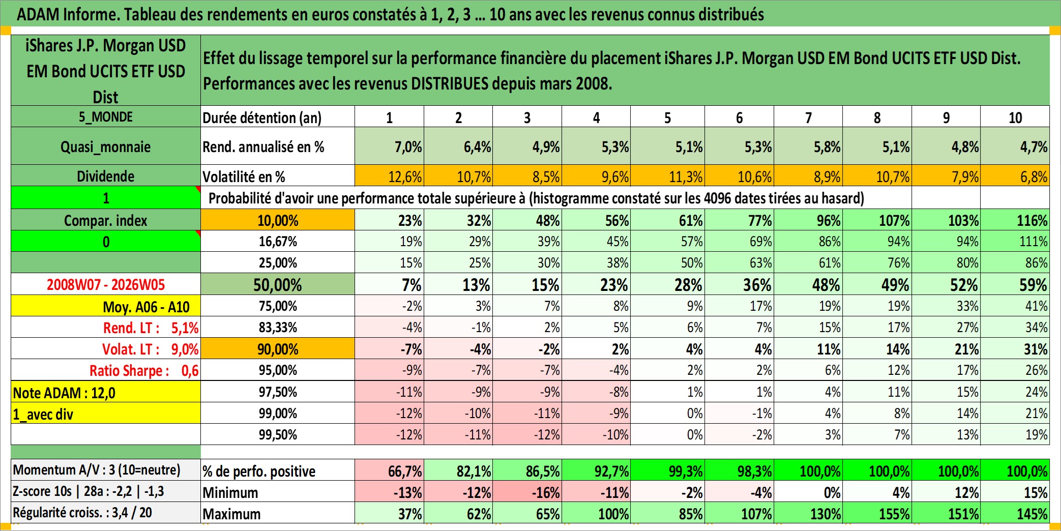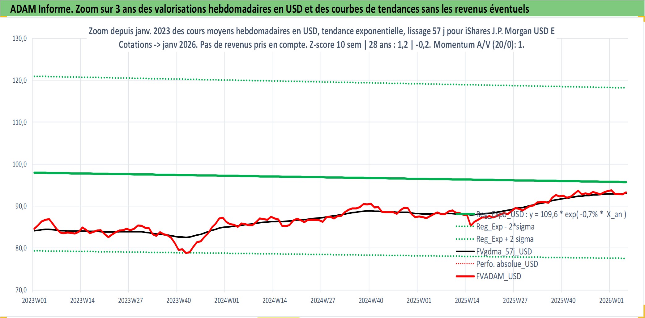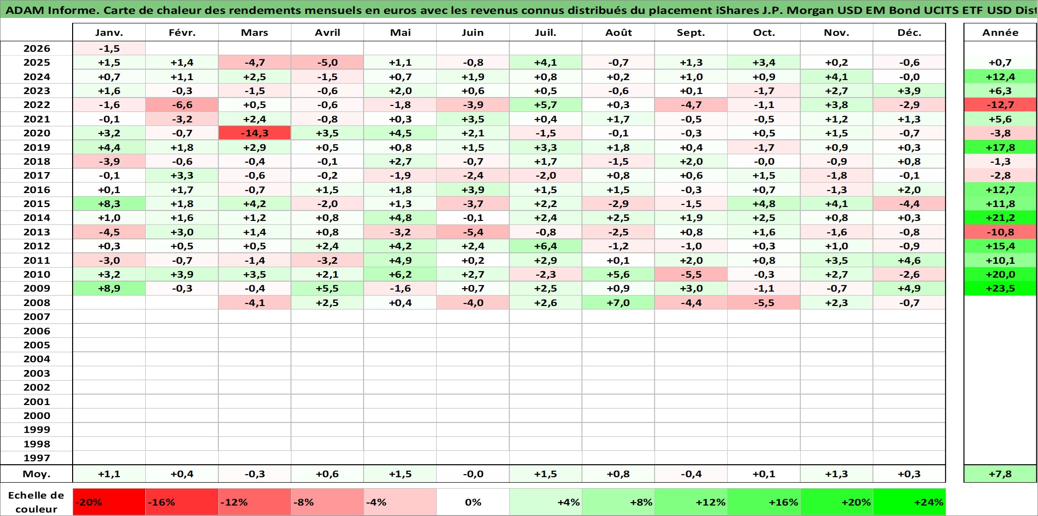 Site dédié aux investisseursPage dédiée sur site financeAnalyse des valorisations hebdomadaires du fonds iShares J.P. Morgan USD EM Bond UCITS ETF USD Dist. Cet actif est cote en USD. Les valorisations sont en contrevaleur EURO et couvrent les semaines 2008W07 a 2026W05. Les revenus de cet actif financier sont pris en compte depuis la semaine 2008W13. La note ESG de cet actif n'est pas connue.