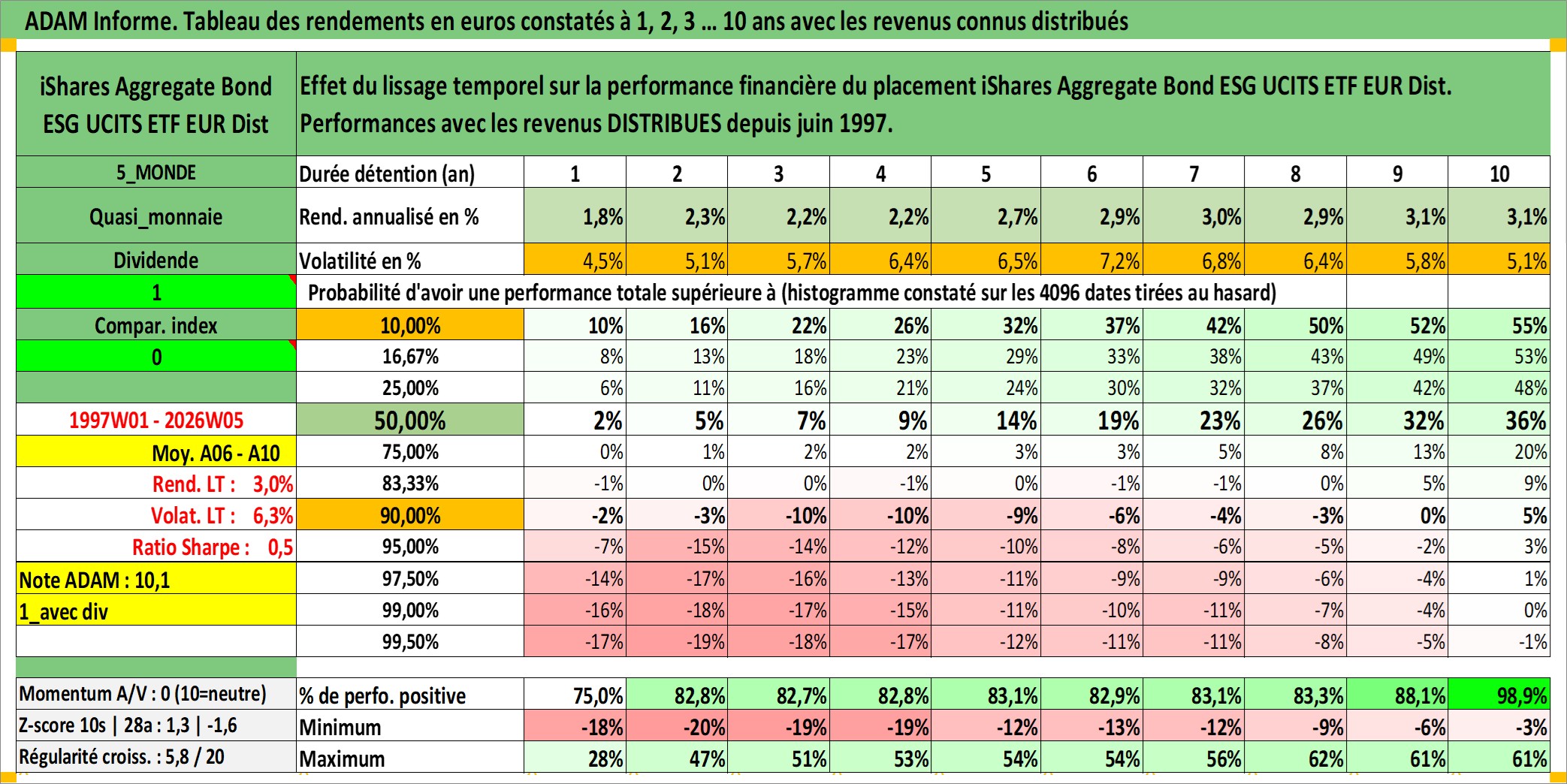 Site dédié aux investisseursPage dédiée sur site financeAnalyse des valorisations hebdomadaires du fonds iShares Aggregate Bond ESG UCITS ETF EUR Dist. Cet actif est cote en EUR. Les valorisations couvrent les semaines 1997W01 a 2026W05. Les revenus de cet actif financier sont pris en compte depuis la semaine 1997W26. La note ESG de cet actif n'est pas connue.