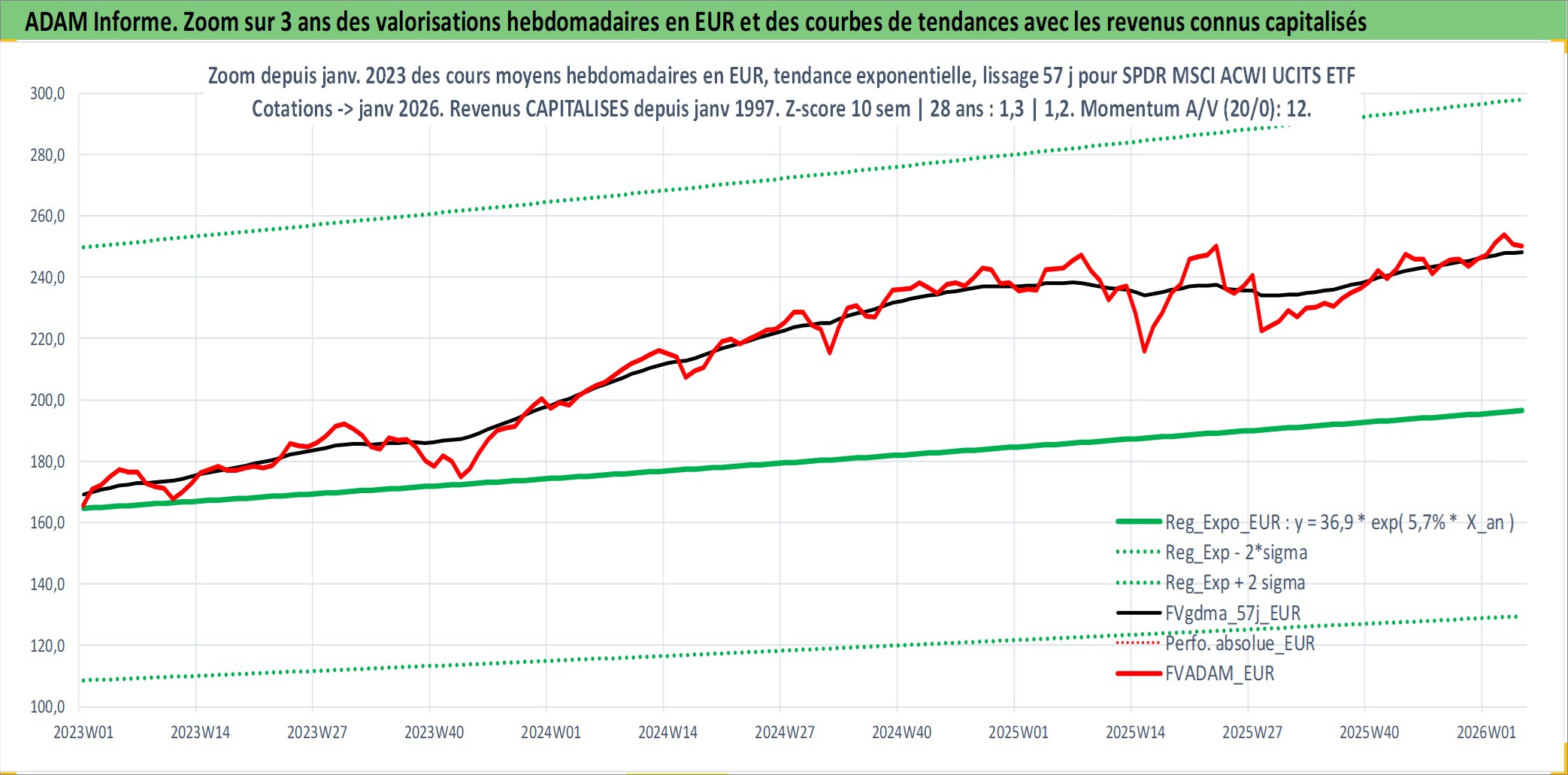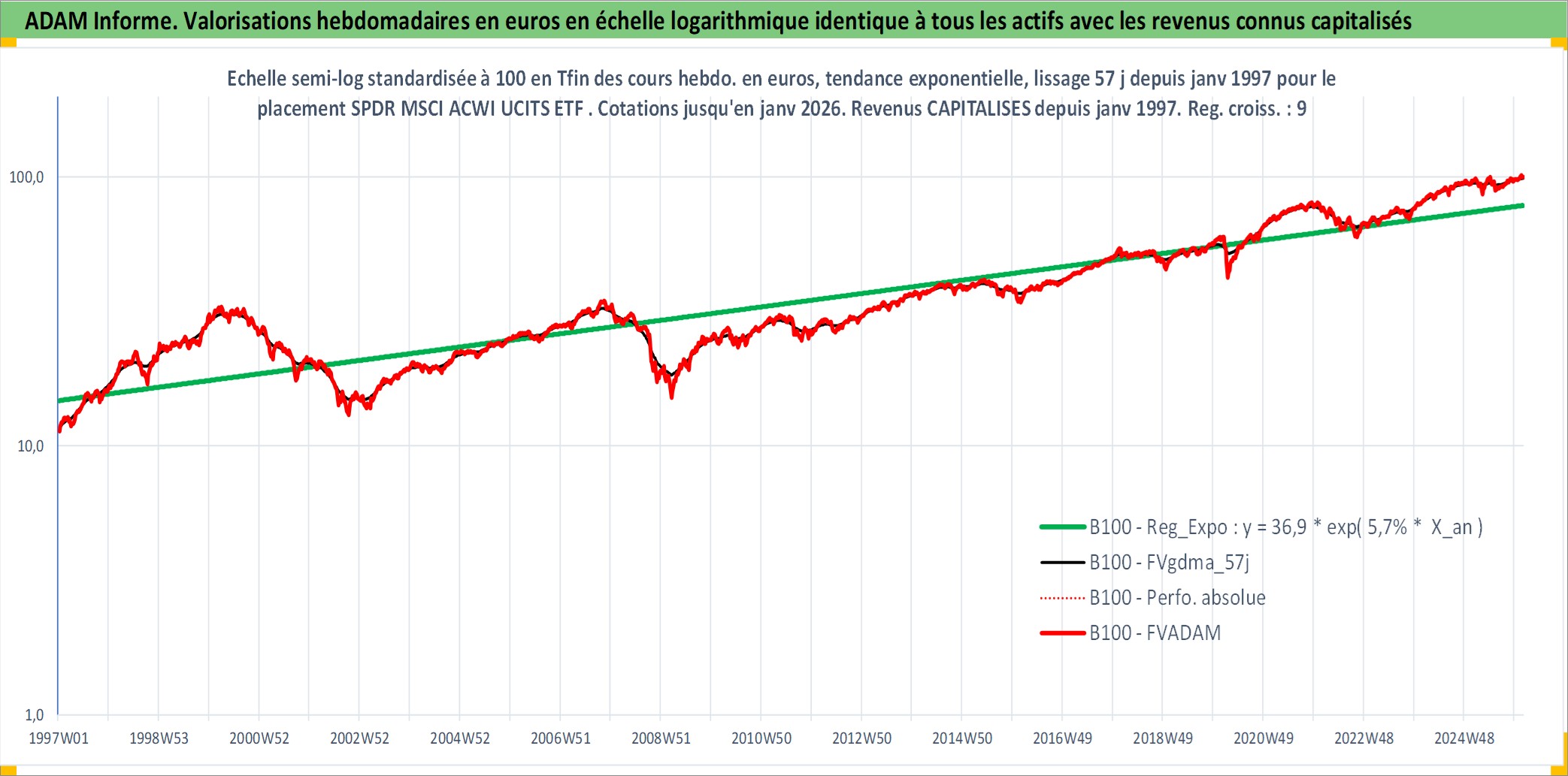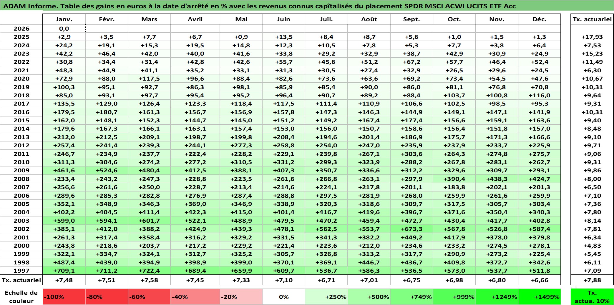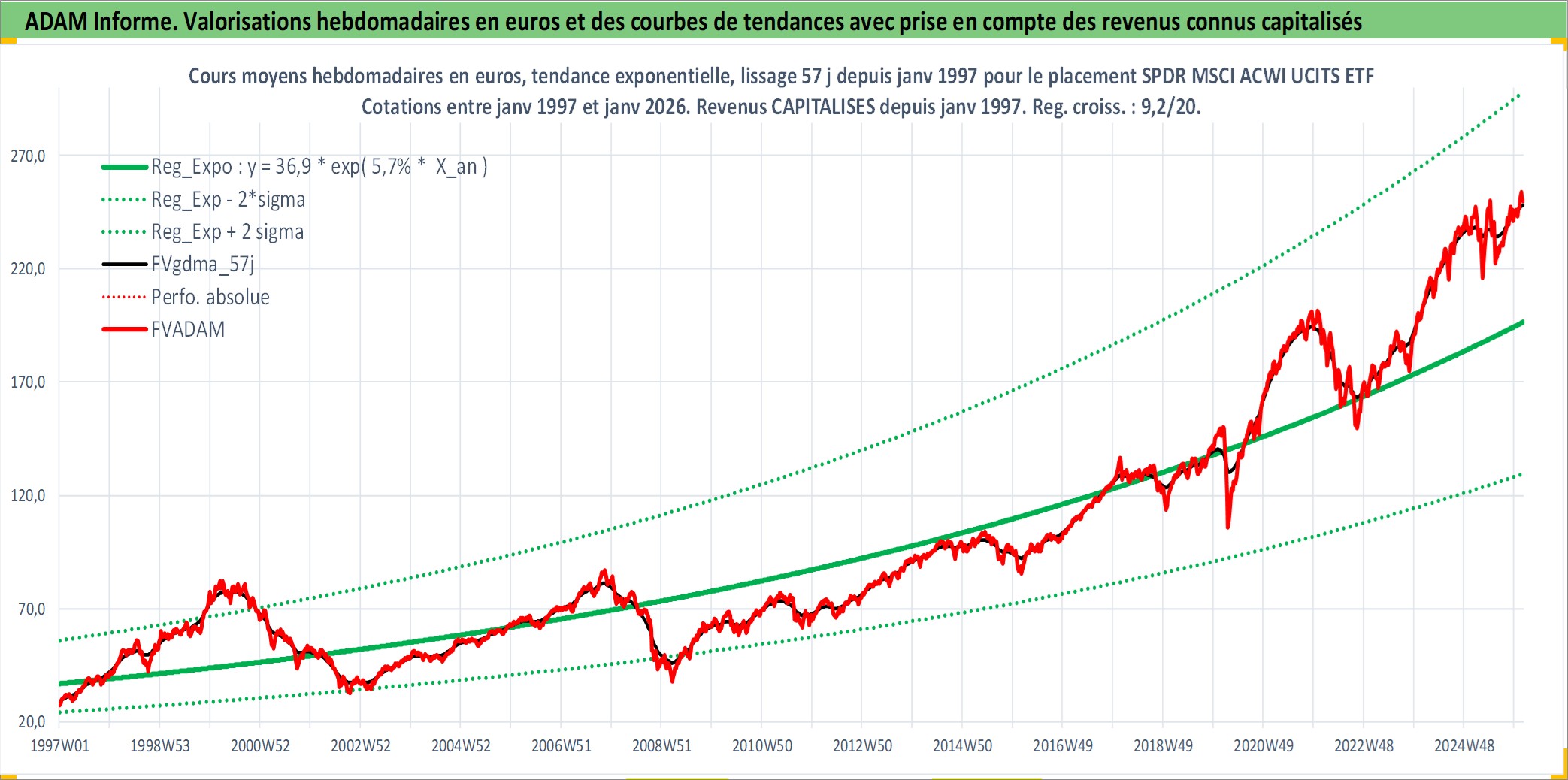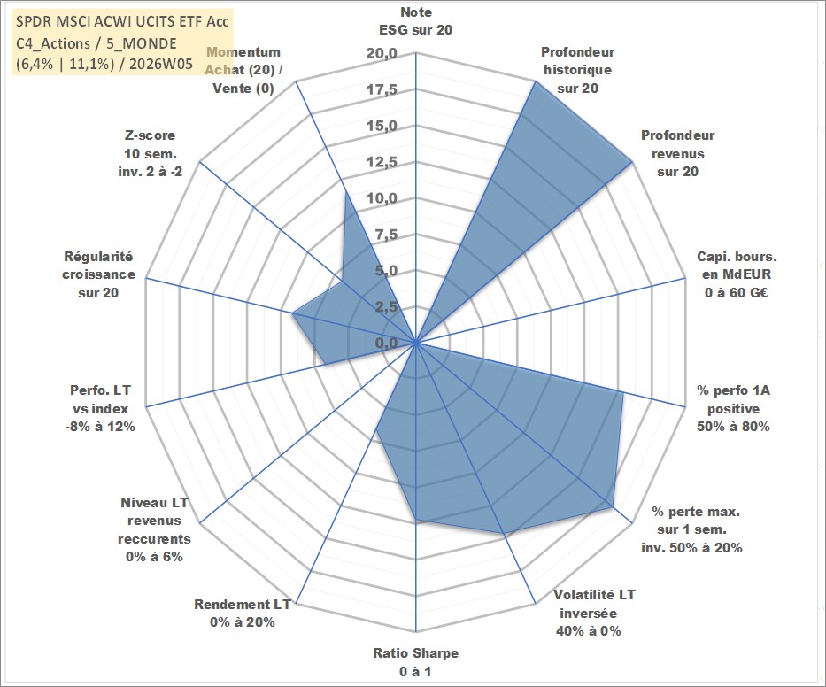 Site dédié aux investisseursPage dédiée sur site financeAnalyse des valorisations hebdomadaires du fonds SPDR MSCI ACWI UCITS ETF Acc. Cet actif est cote en EUR. Les valorisations couvrent les semaines 1997W01 a 2026W05. Les revenus de cet actif financier sont pris en compte depuis la semaine 1997W01. La note ESG de cet actif n'est pas connue.