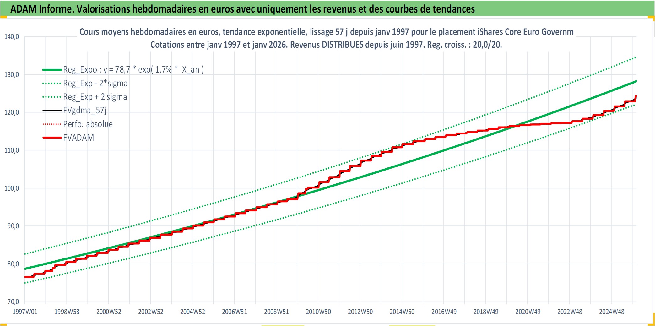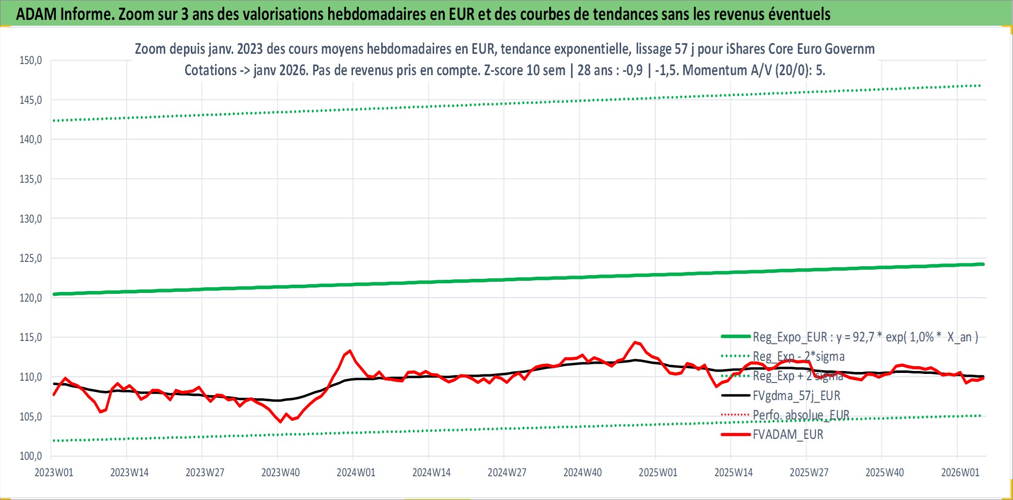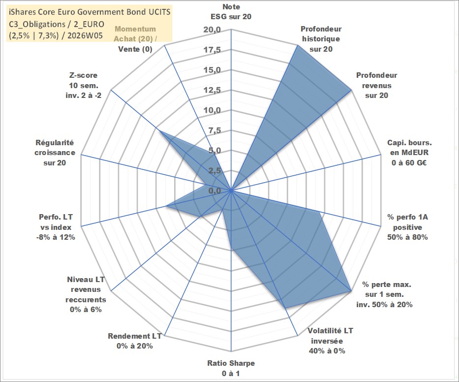 Site dédié aux investisseursPage dédiée sur site financeAnalyse des valorisations hebdomadaires du fonds iShares Core Euro Government Bond UCITS ETF Dist. Cet actif est cote en EUR. Les valorisations couvrent les semaines 1997W01 a 2026W05. Les revenus de cet actif financier sont pris en compte depuis la semaine 1997W24. La note ESG de cet actif n'est pas connue.