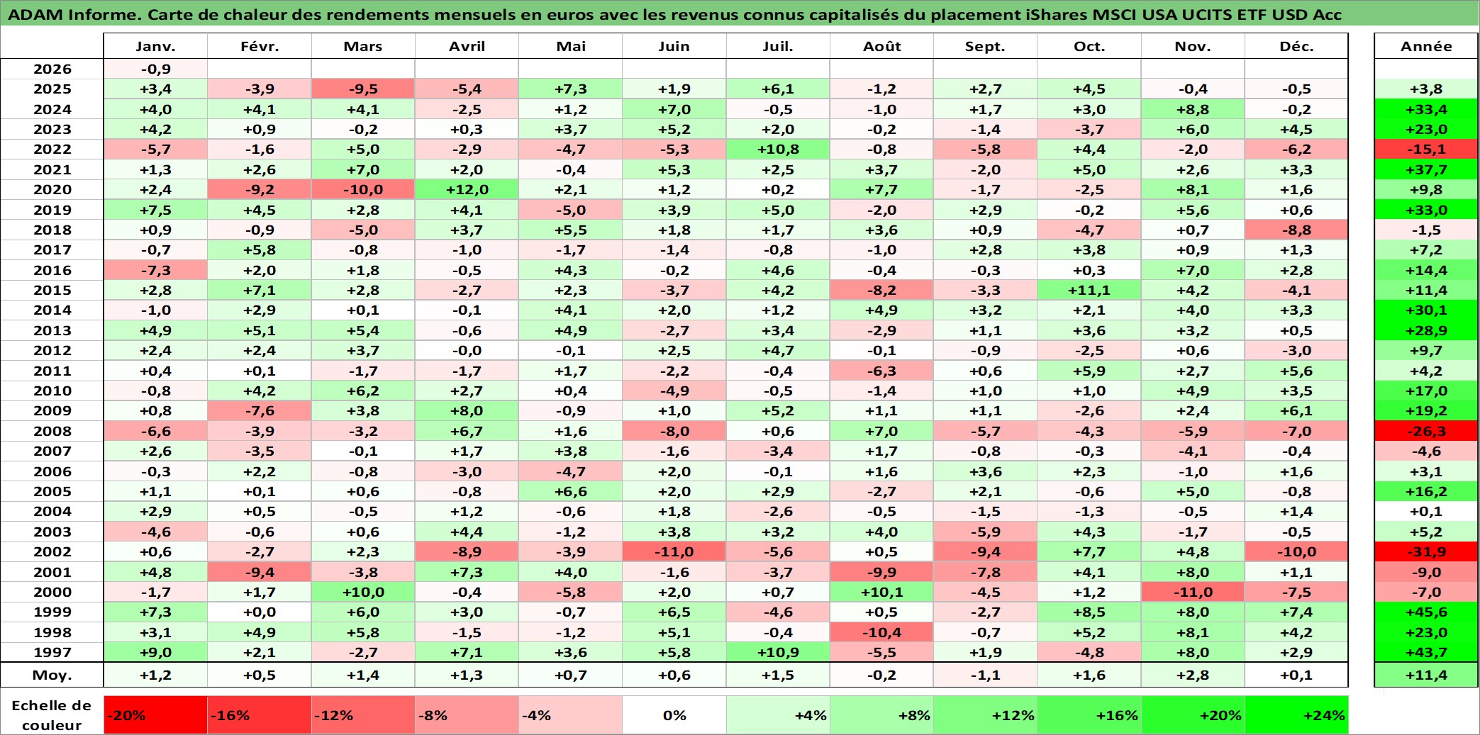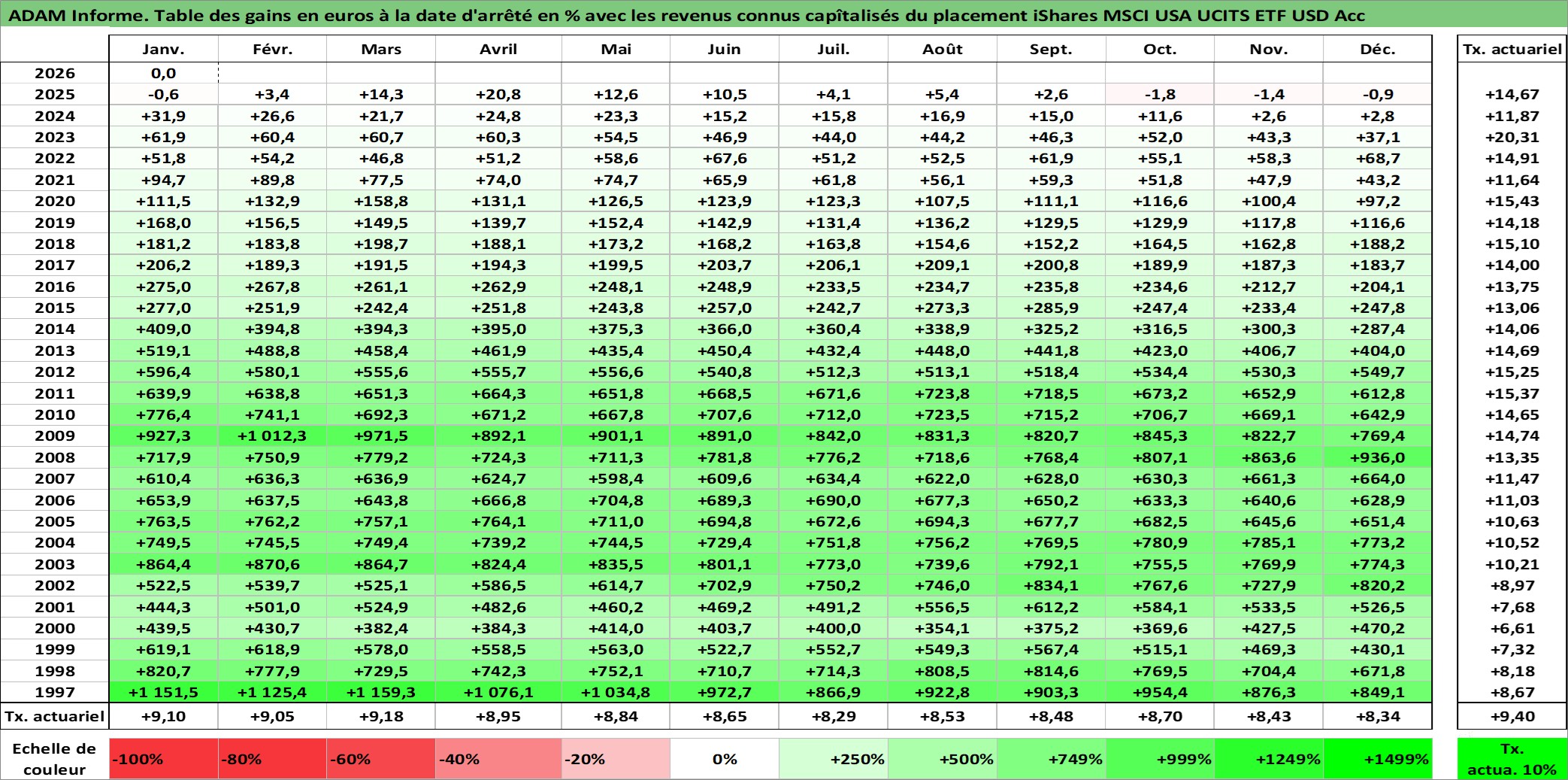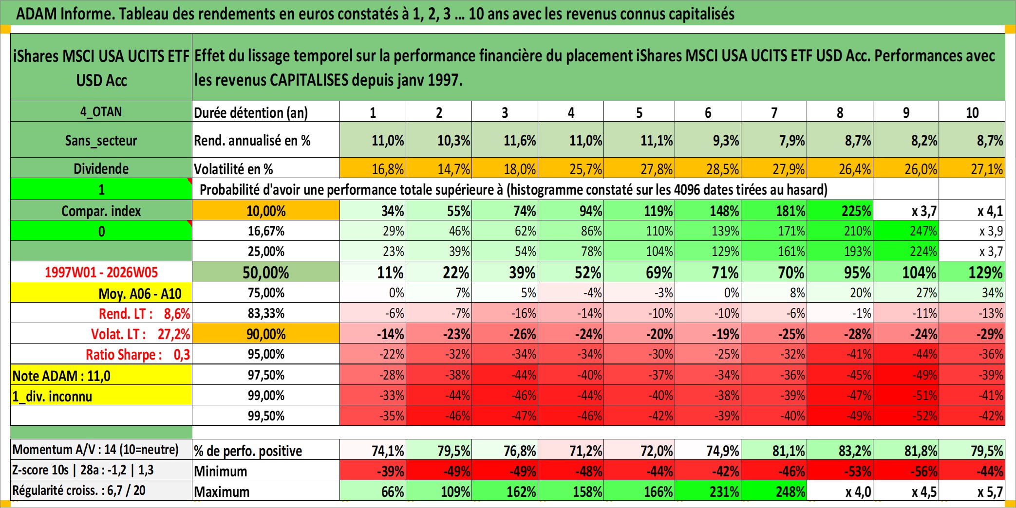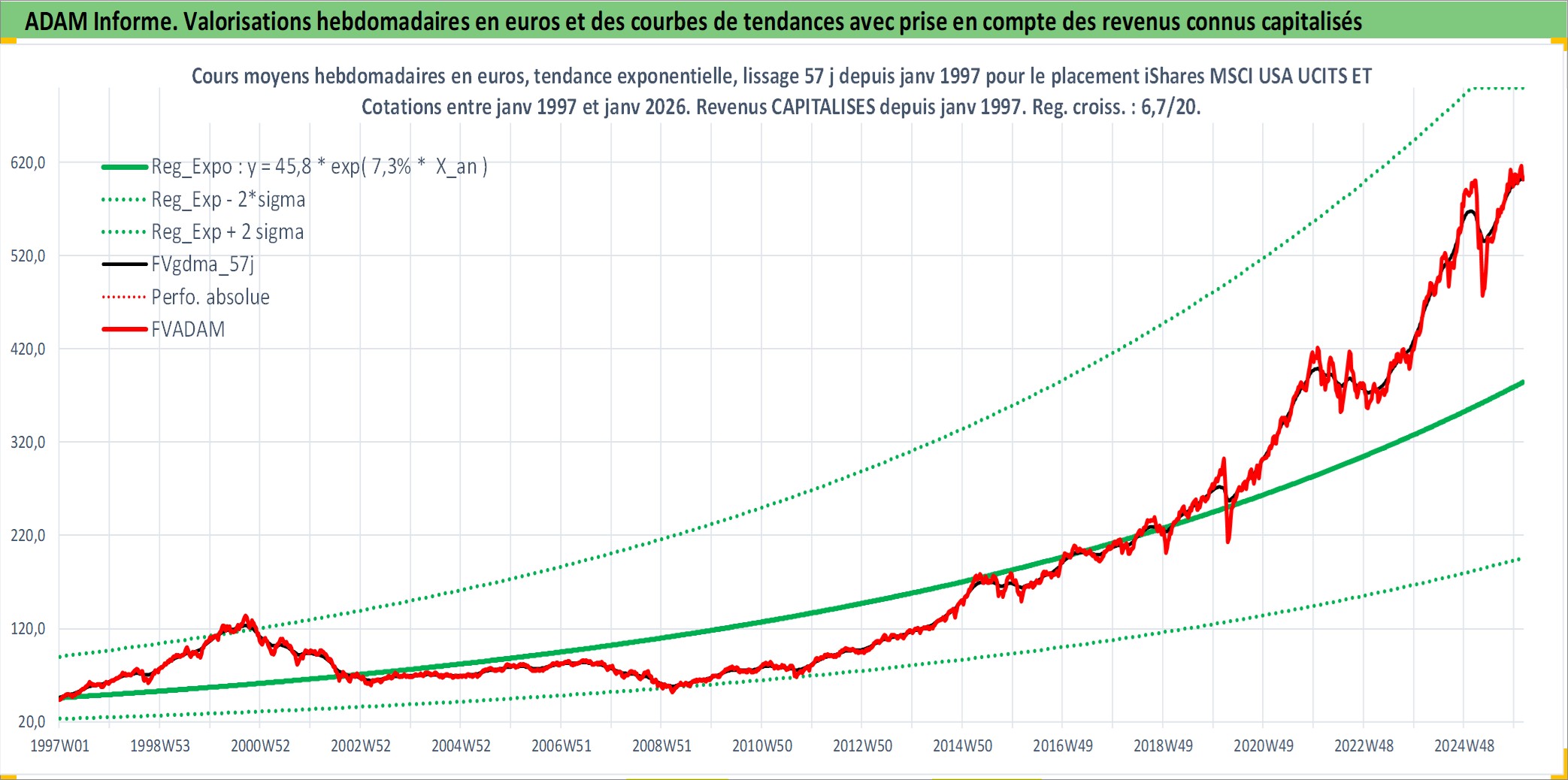 Site dédié aux investisseursPage dédiée sur site financeAnalyse des valorisations hebdomadaires du fonds iShares MSCI USA UCITS ETF USD Acc. Cet actif est cote en USD. Les valorisations sont en contrevaleur EURO et couvrent les semaines 1997W01 a 2026W05. Les revenus de cet actif financier sont pris en compte depuis la semaine 1997W01. La note ESG de cet actif n'est pas connue.