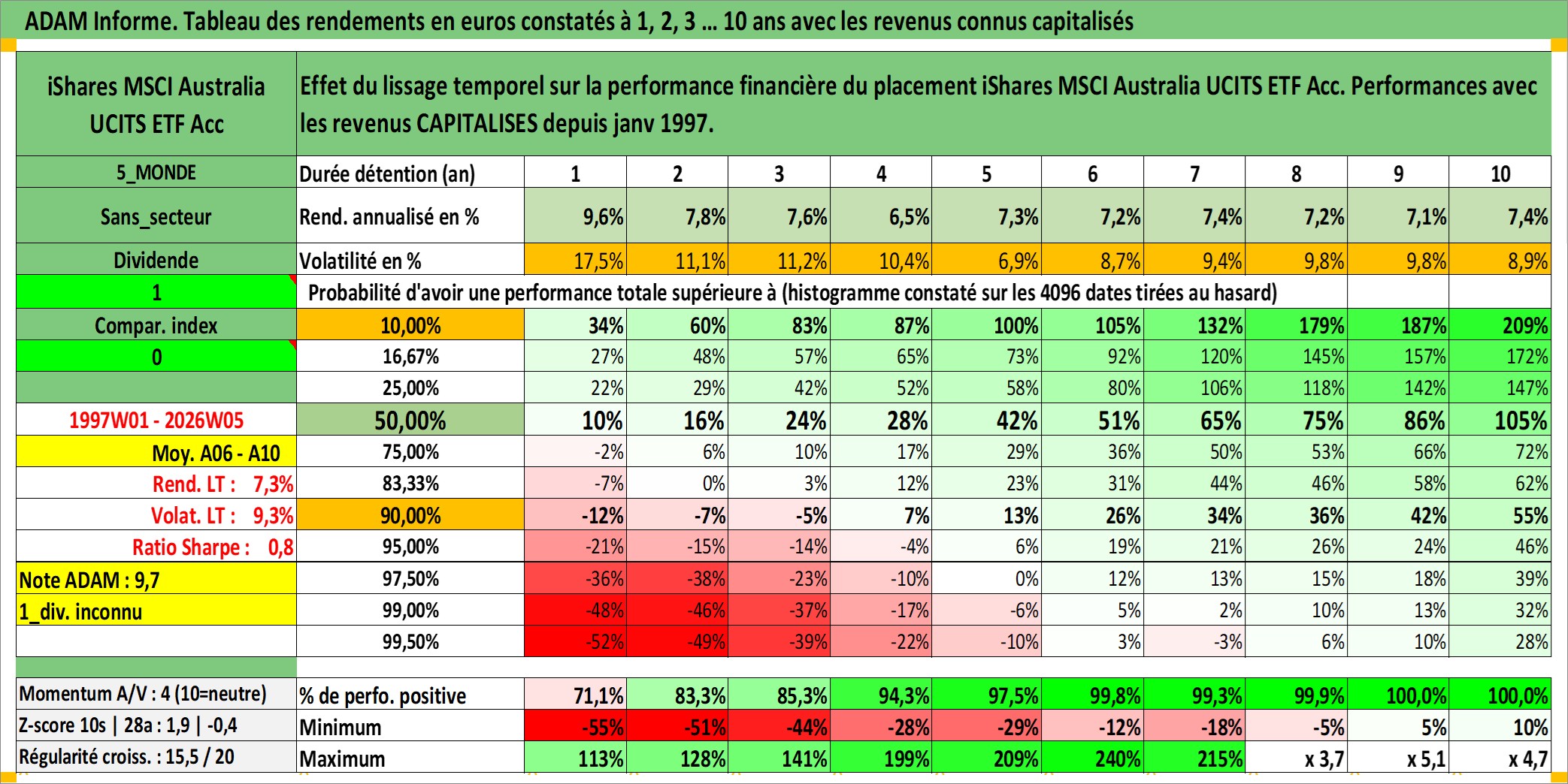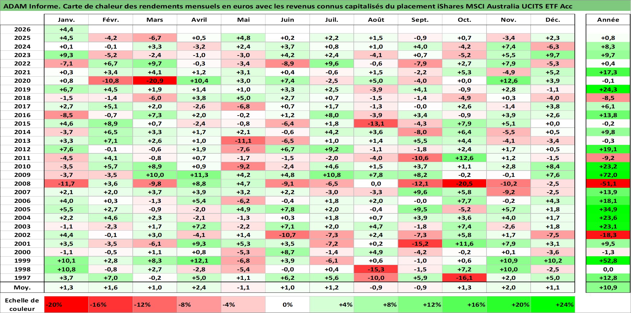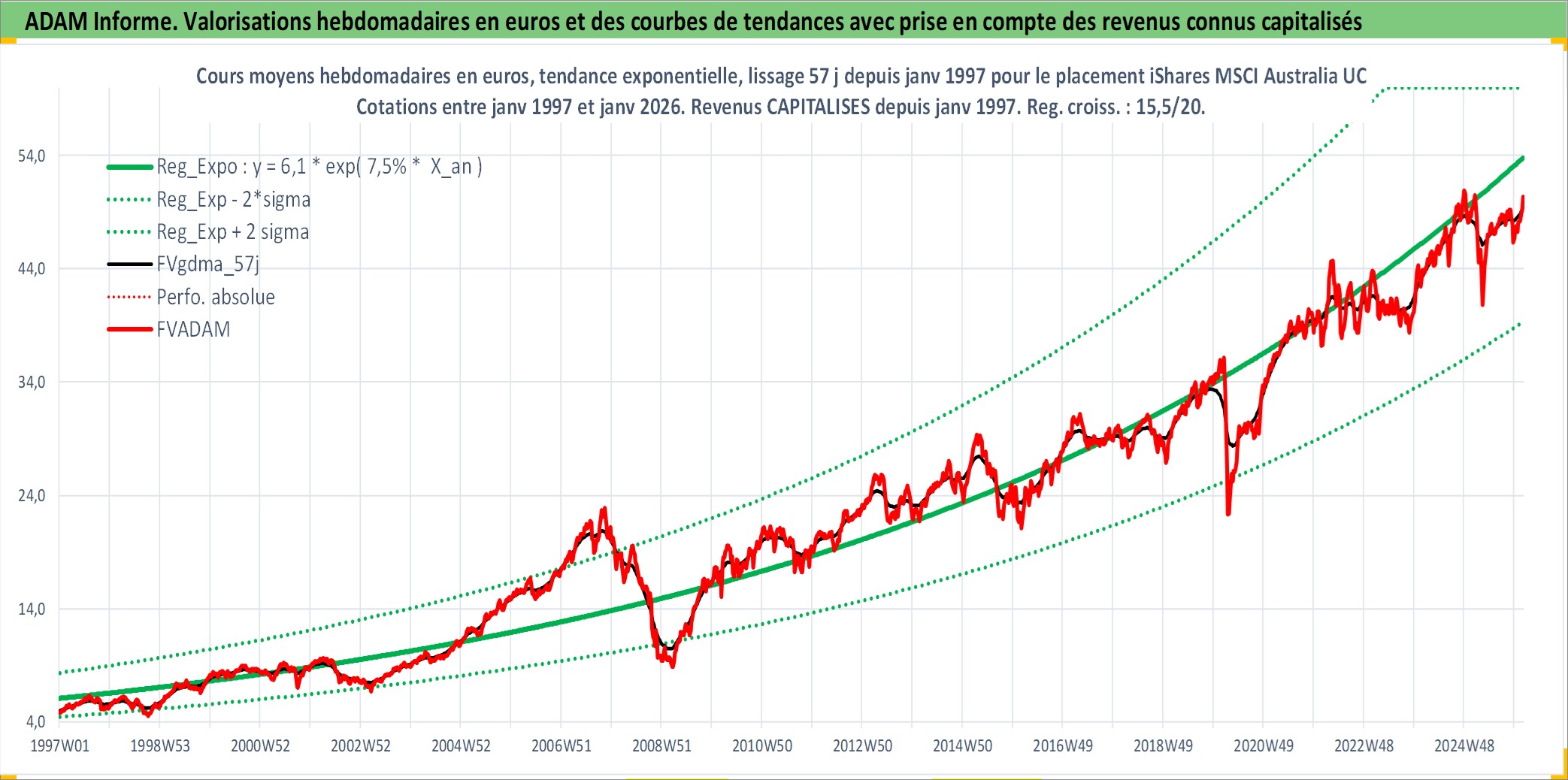 Site dédié aux investisseursPage dédiée sur site financeAnalyse des valorisations hebdomadaires du fonds iShares MSCI Australia UCITS ETF Acc. Cet actif est cote en USD. Les valorisations sont en contrevaleur EURO et couvrent les semaines 1997W01 a 2026W05. Les revenus de cet actif financier sont pris en compte depuis la semaine 1997W01. La note ESG de cet actif n'est pas connue.