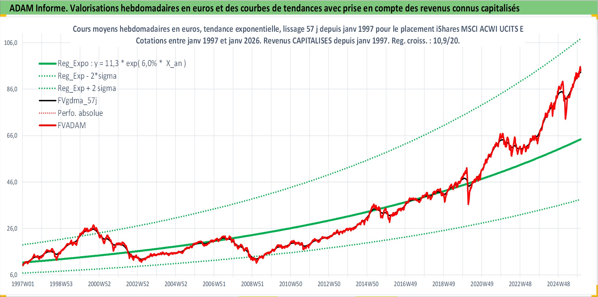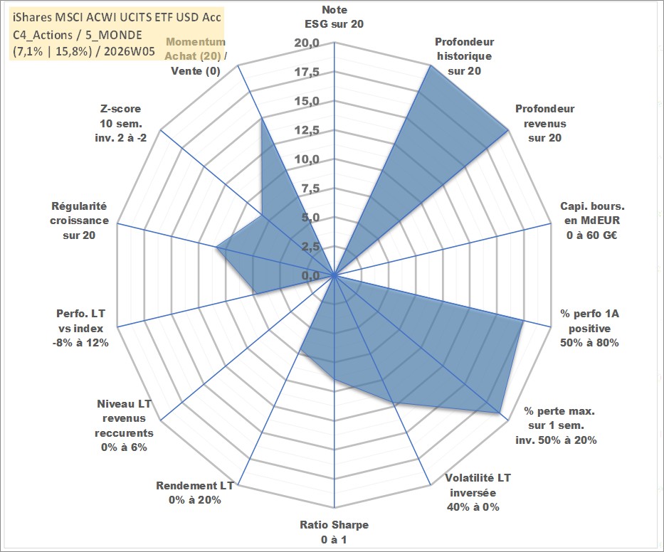 Site dédié aux investisseursPage dédiée sur site financeAnalyse des valorisations hebdomadaires du fonds iShares MSCI ACWI UCITS ETF USD Acc. Cet actif est cote en USD. Les valorisations sont en contrevaleur EURO et couvrent les semaines 1997W01 a 2026W05. Les revenus de cet actif financier sont pris en compte depuis la semaine 1997W01. La note ESG de cet actif n'est pas connue.