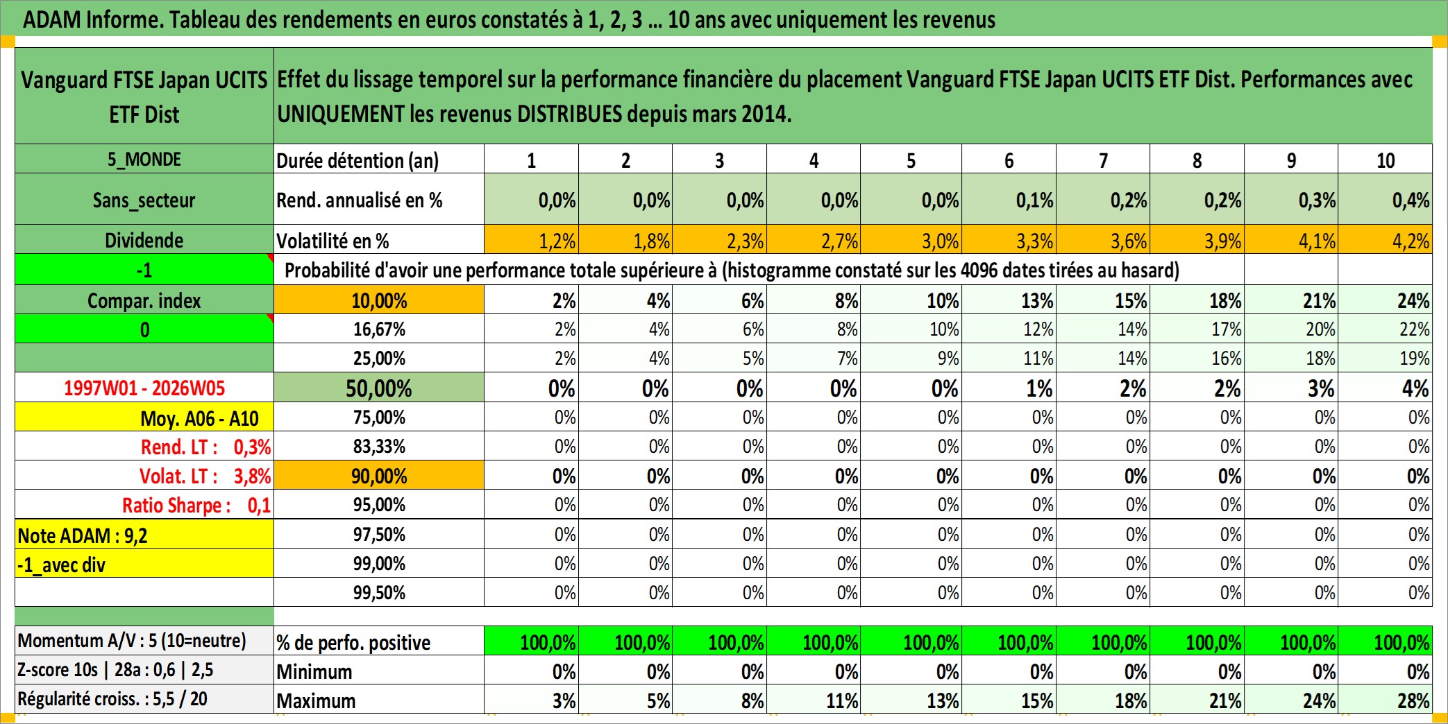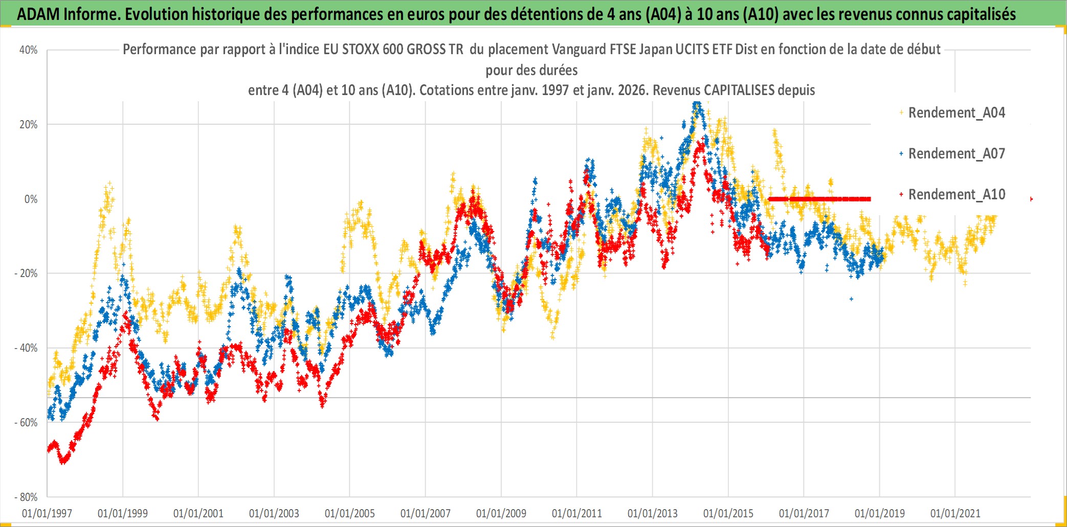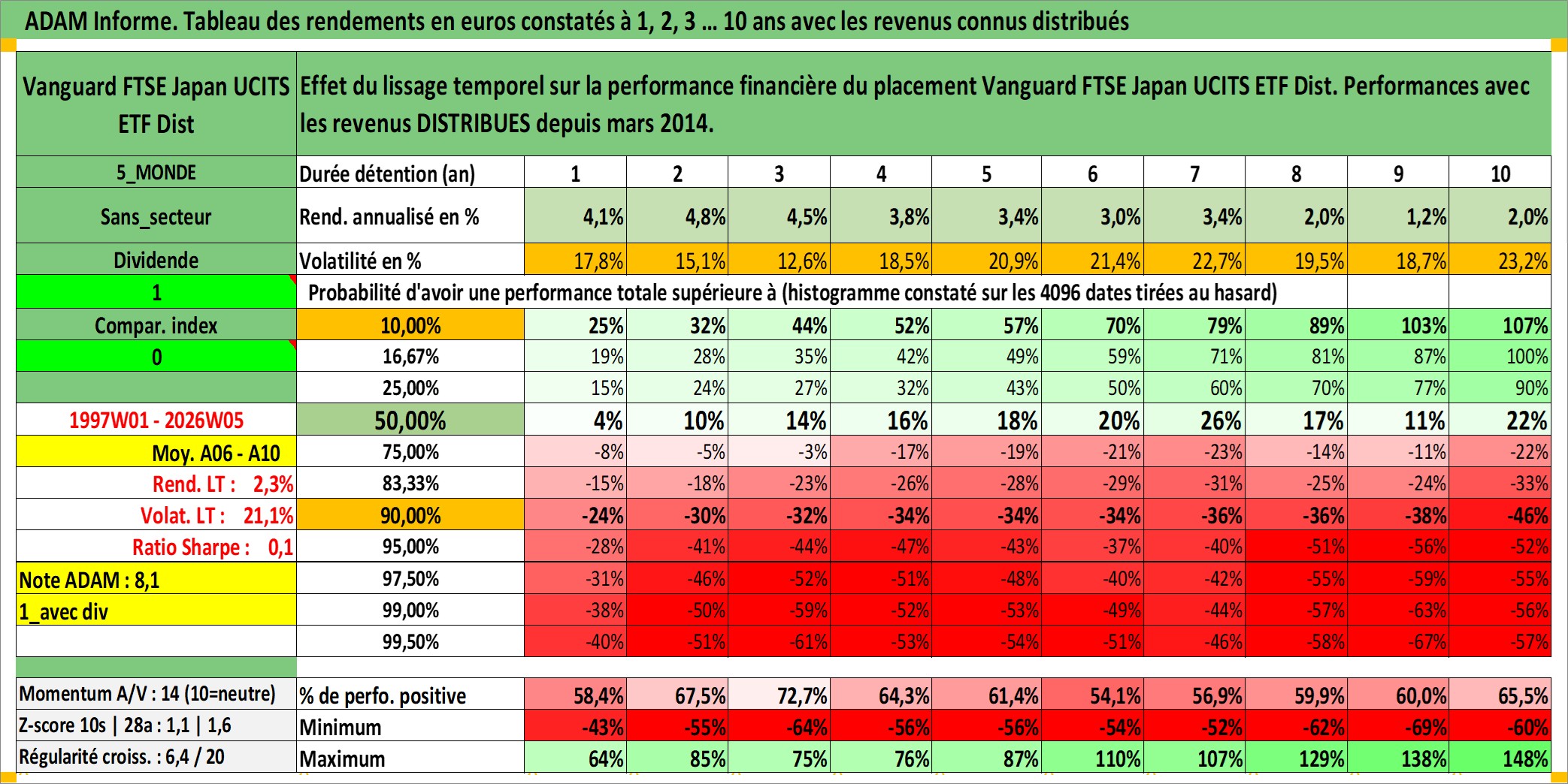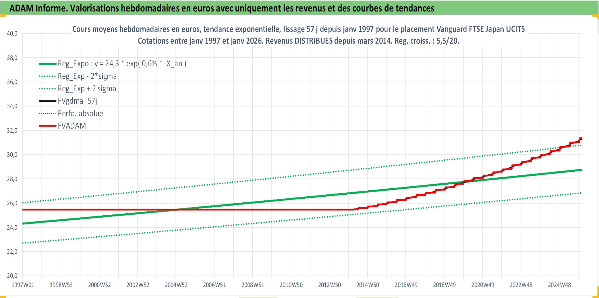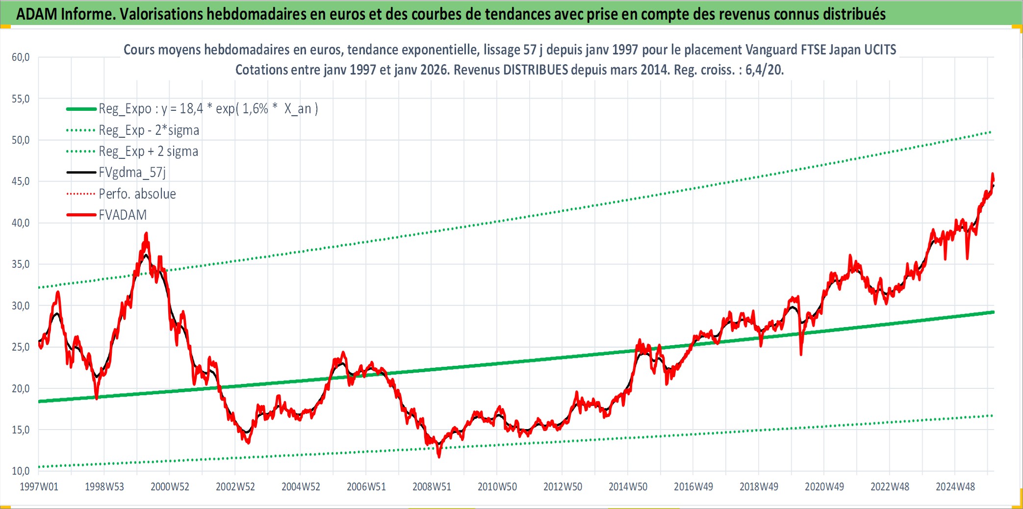 Site dédié aux investisseursPage dédiée sur site financeAnalyse des valorisations hebdomadaires du fonds Vanguard FTSE Japan UCITS ETF Dist. Cet actif est cote en CHF. Les valorisations sont en contrevaleur EURO et couvrent les semaines 1997W01 a 2026W05. Les revenus de cet actif financier sont pris en compte depuis la semaine 2014W12. La note ESG de cet actif n'est pas connue.
