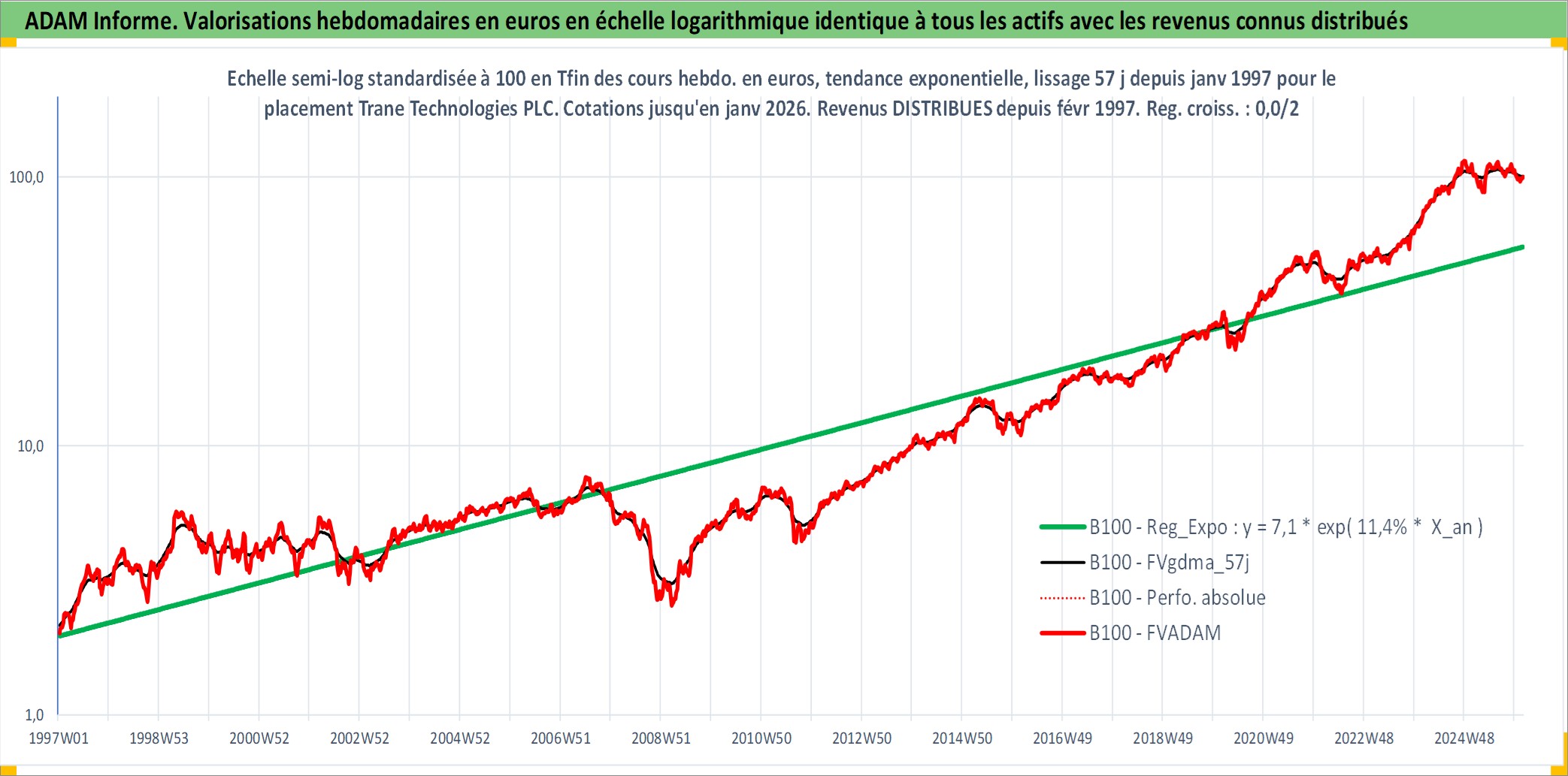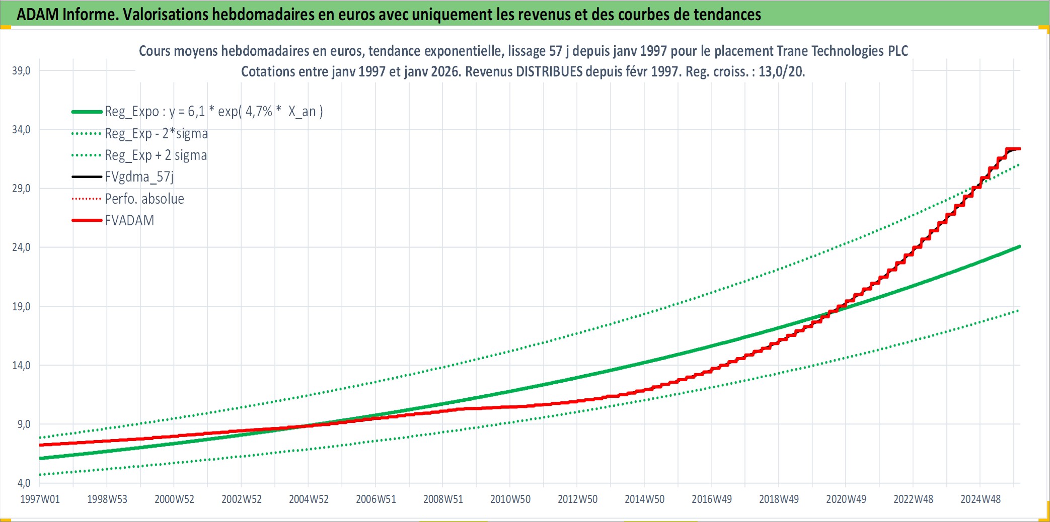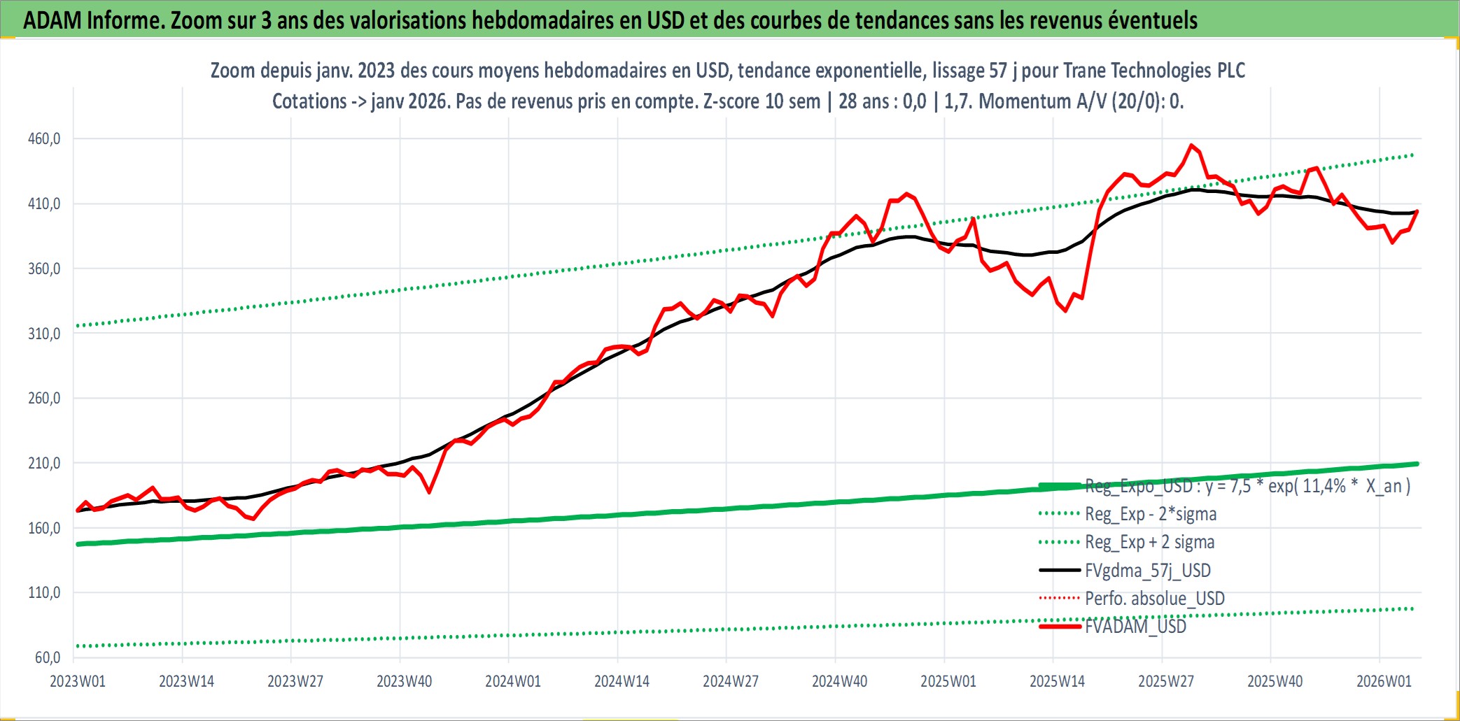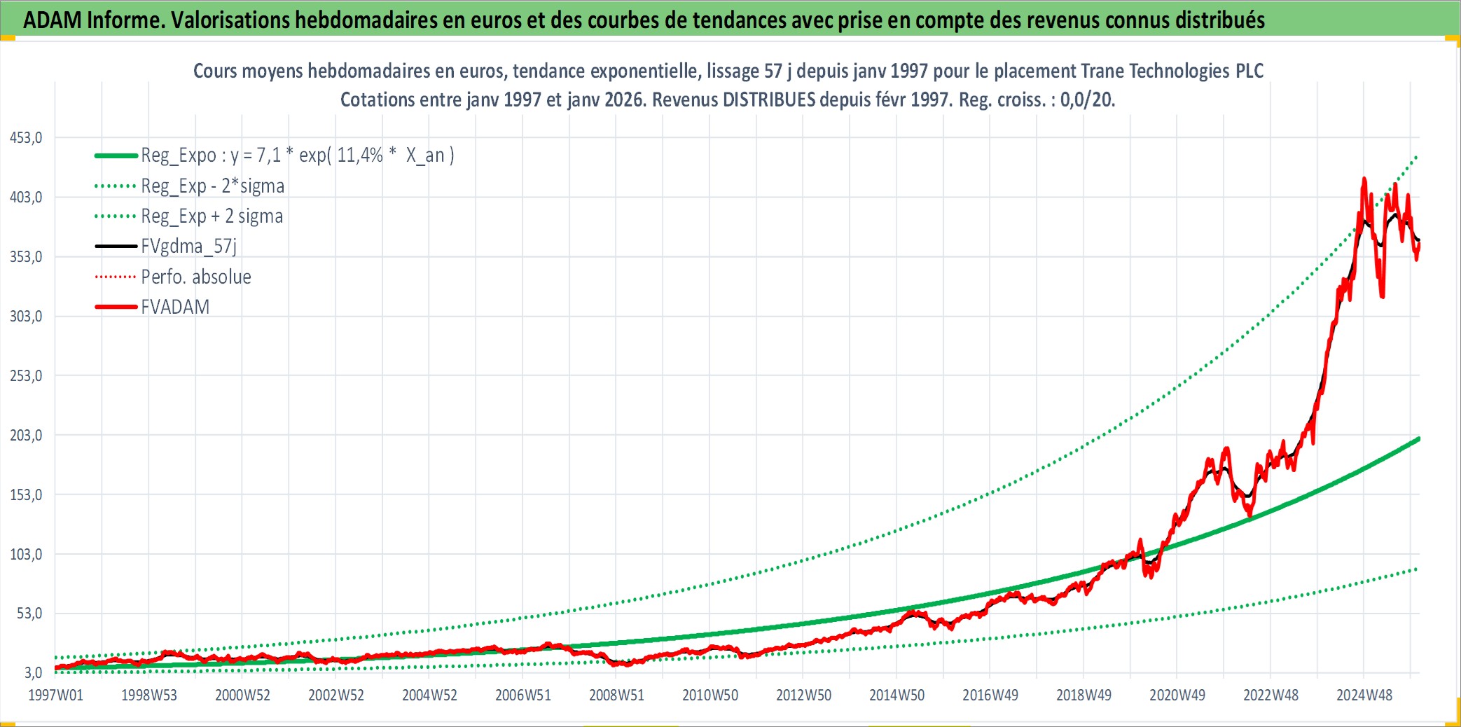 Site dédié aux investisseursPage dédiée sur site financeAnalyse des valorisations hebdomadaires de l'action Trane Technologies PLC. Cet actif est cote en USD. Les valorisations sont en contrevaleur EURO et couvrent les semaines 1997W01 a 2026W05. Les revenus de cet actif financier sont pris en compte depuis la semaine 1997W07. La note globale ESG de cet actif est estimee a 13.0 (apres rebasage entre 0 et 20).