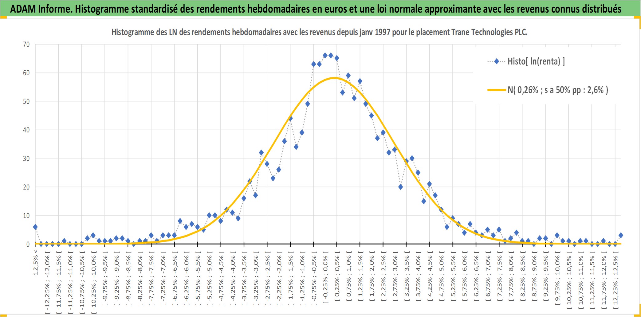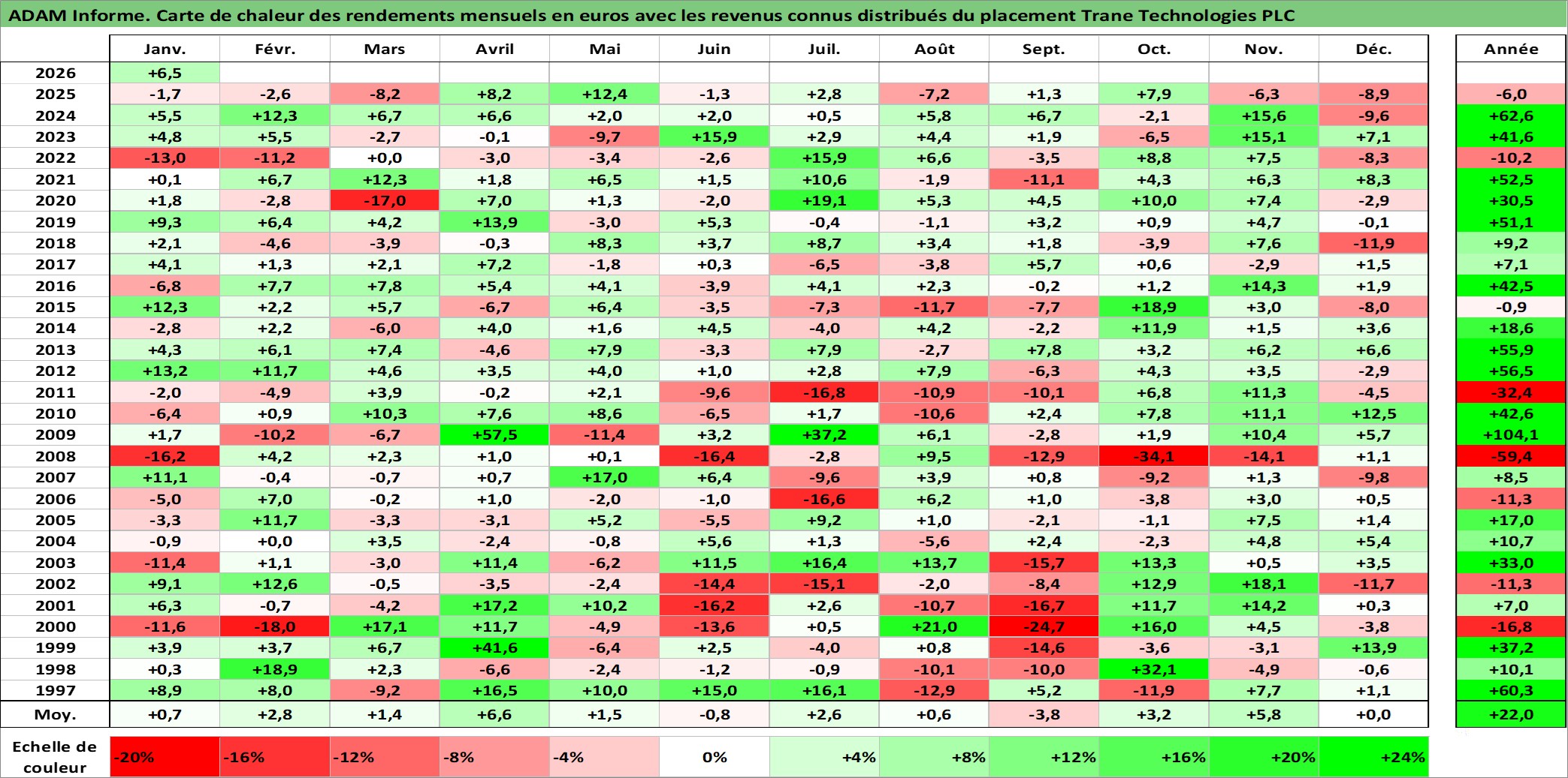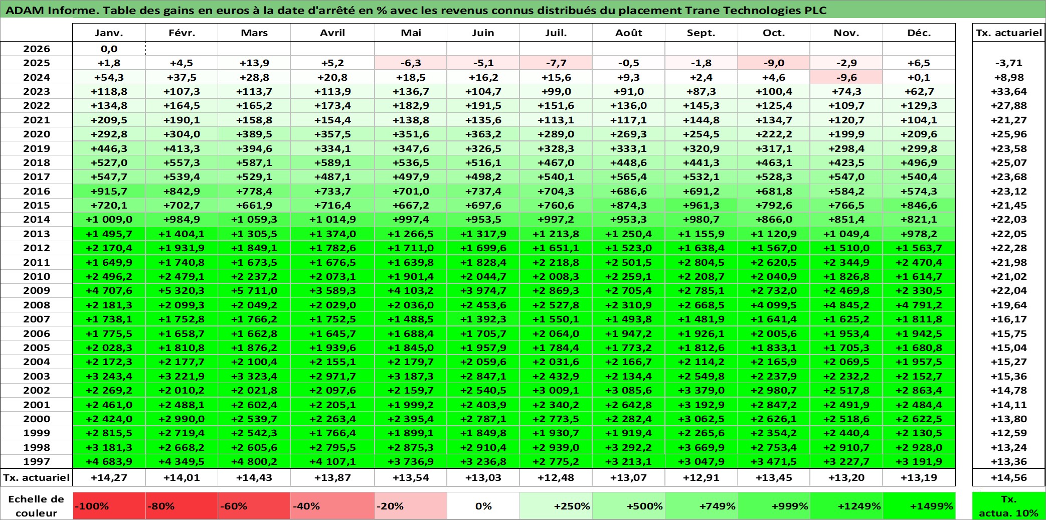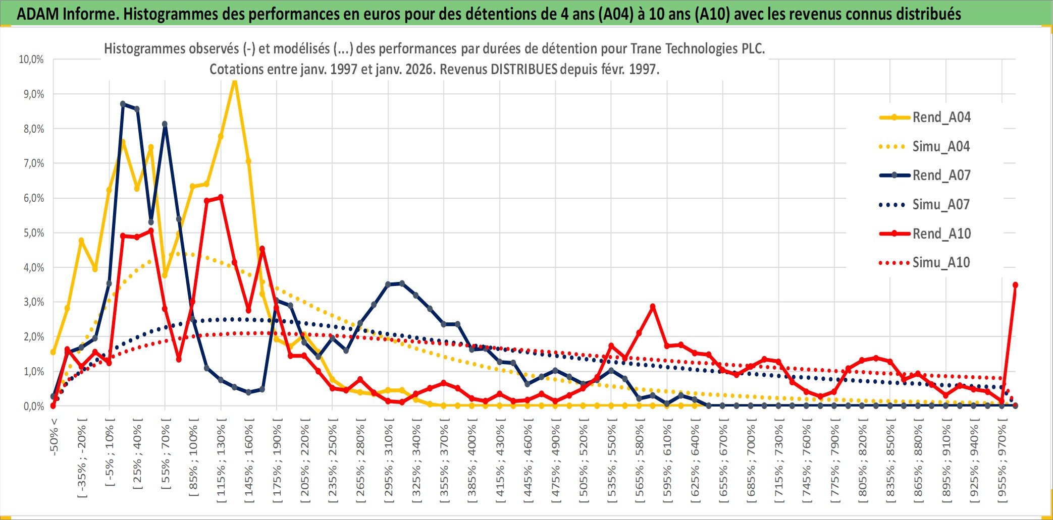 Site dédié aux investisseursPage dédiée sur site financeAnalyse des valorisations hebdomadaires de l'action Trane Technologies PLC. Cet actif est cote en USD. Les valorisations sont en contrevaleur EURO et couvrent les semaines 1997W01 a 2026W05. Les revenus de cet actif financier sont pris en compte depuis la semaine 1997W07. La note globale ESG de cet actif est estimee a 13.0 (apres rebasage entre 0 et 20).