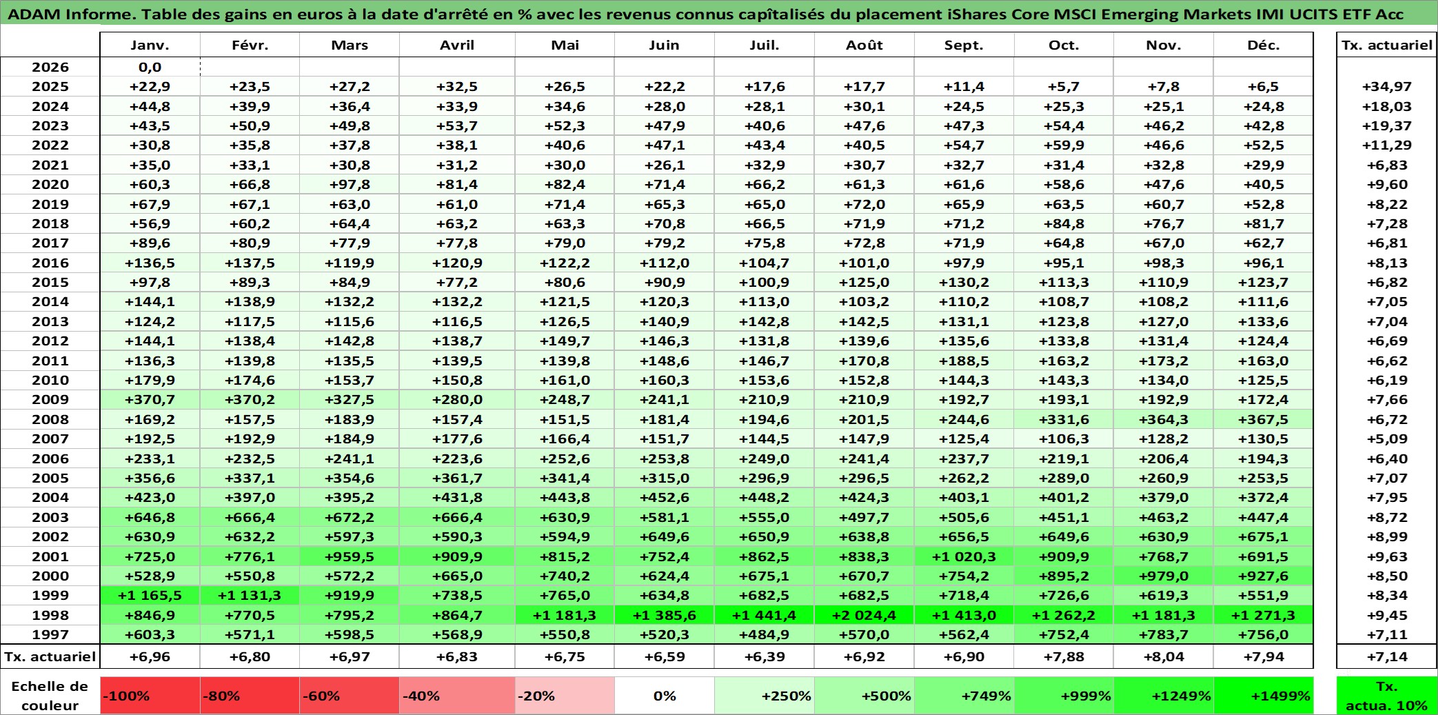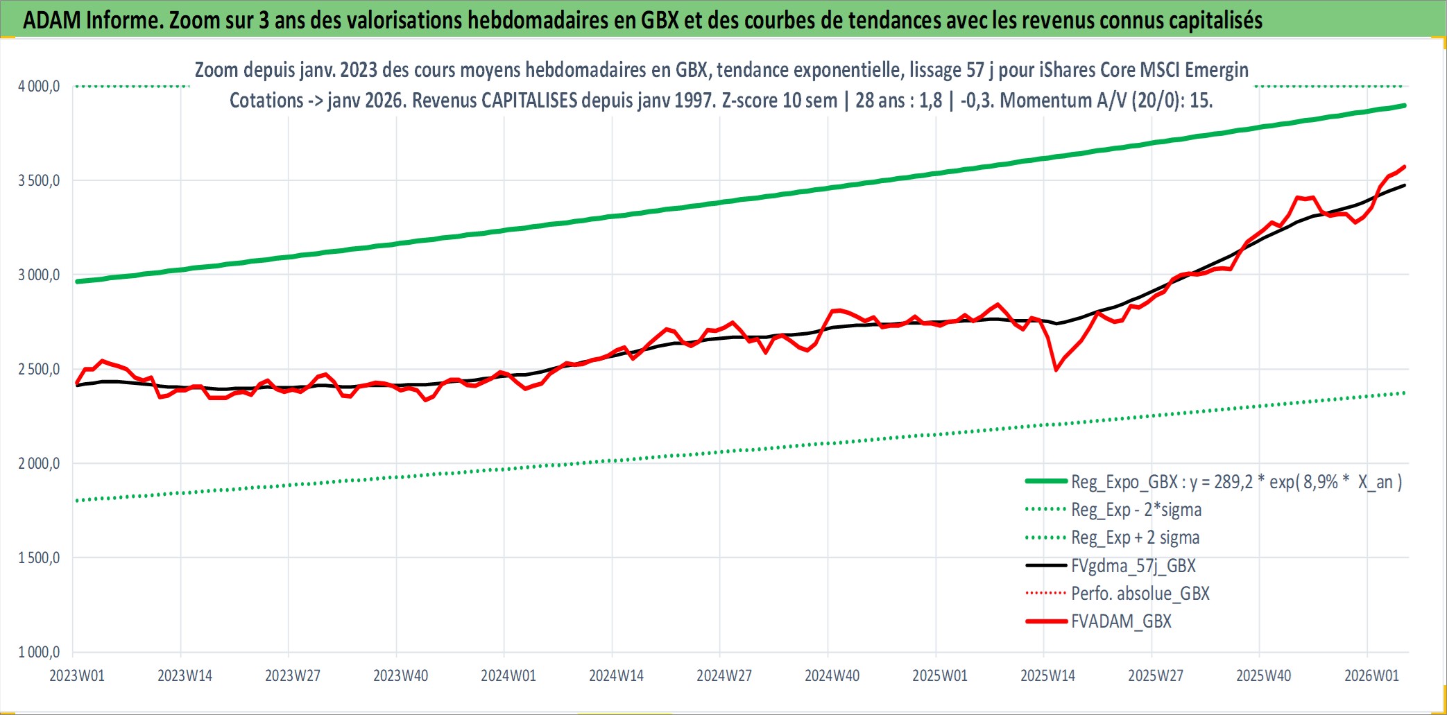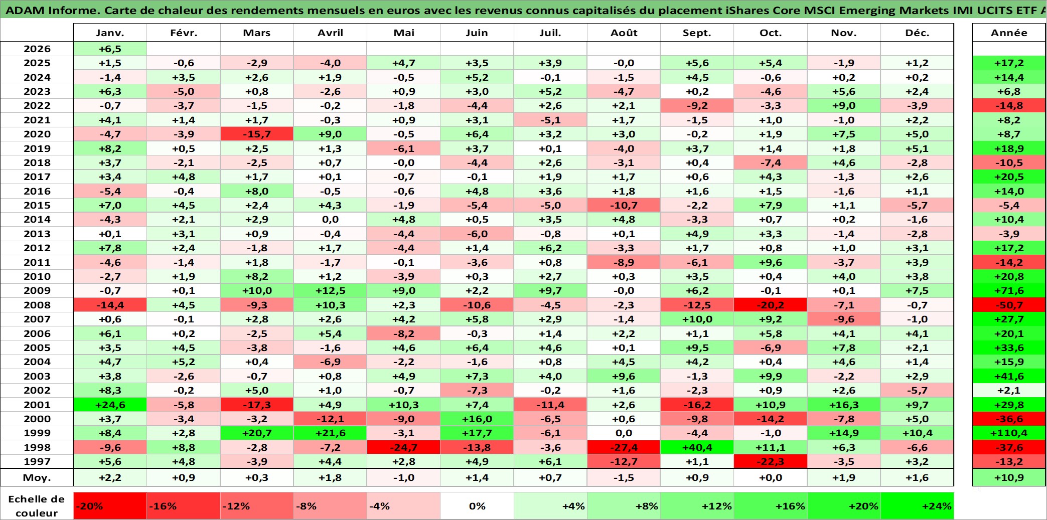 Site dédié aux investisseursPage dédiée sur site financeAnalyse des valorisations hebdomadaires du fonds iShares Core MSCI Emerging Markets IMI UCITS ETF Acc. Cet actif est cote en GBX. Les valorisations sont en contrevaleur EURO et couvrent les semaines 1997W01 a 2026W05. Les revenus de cet actif financier sont pris en compte depuis la semaine 1997W01. La note ESG de cet actif n'est pas connue.