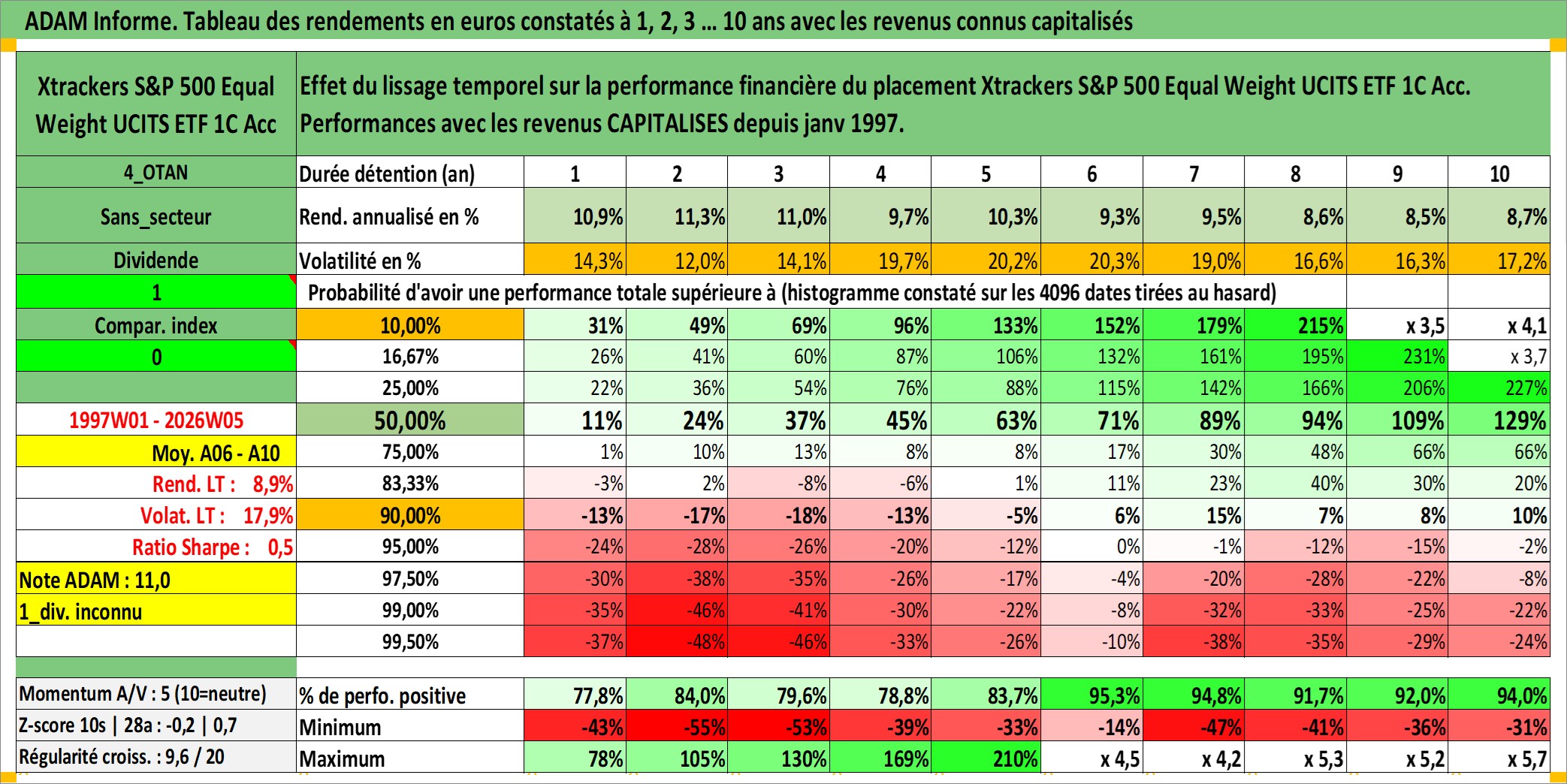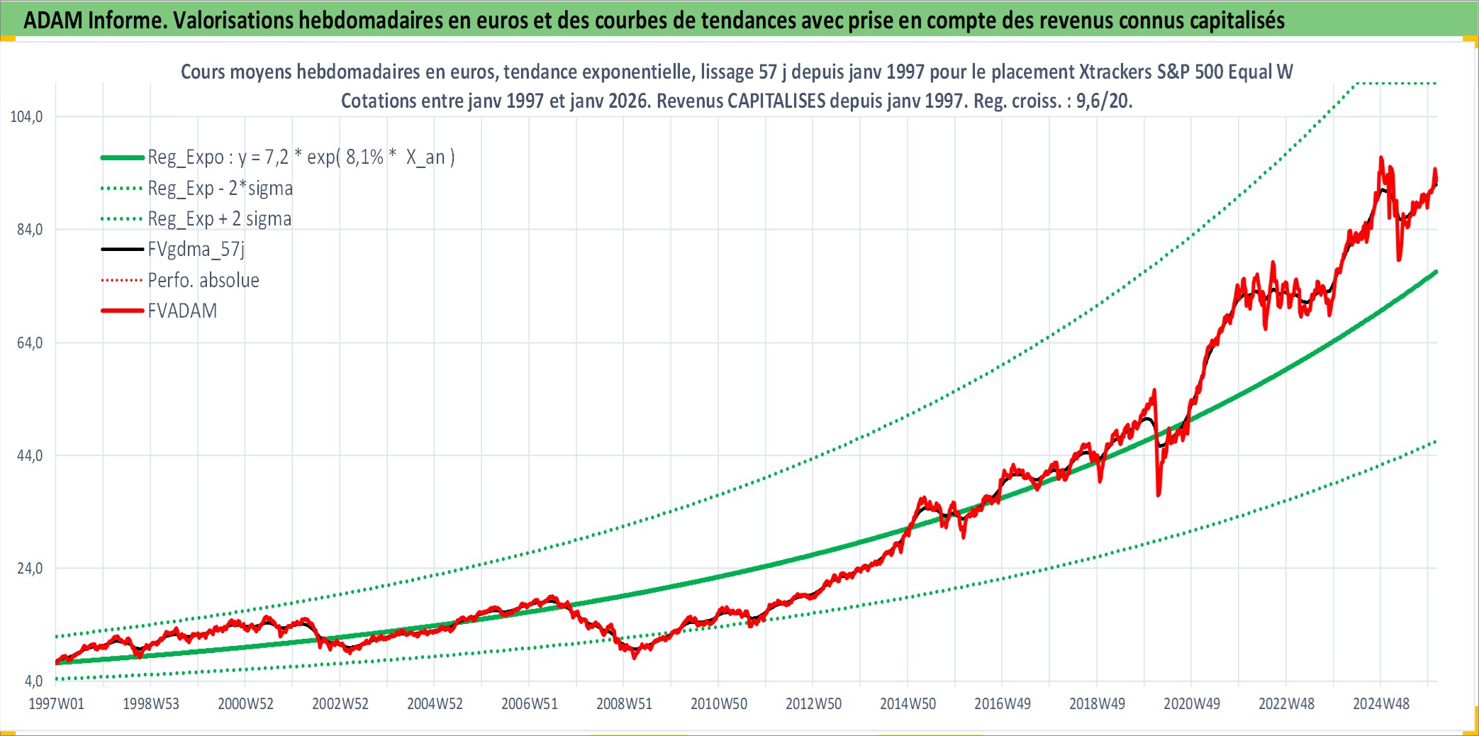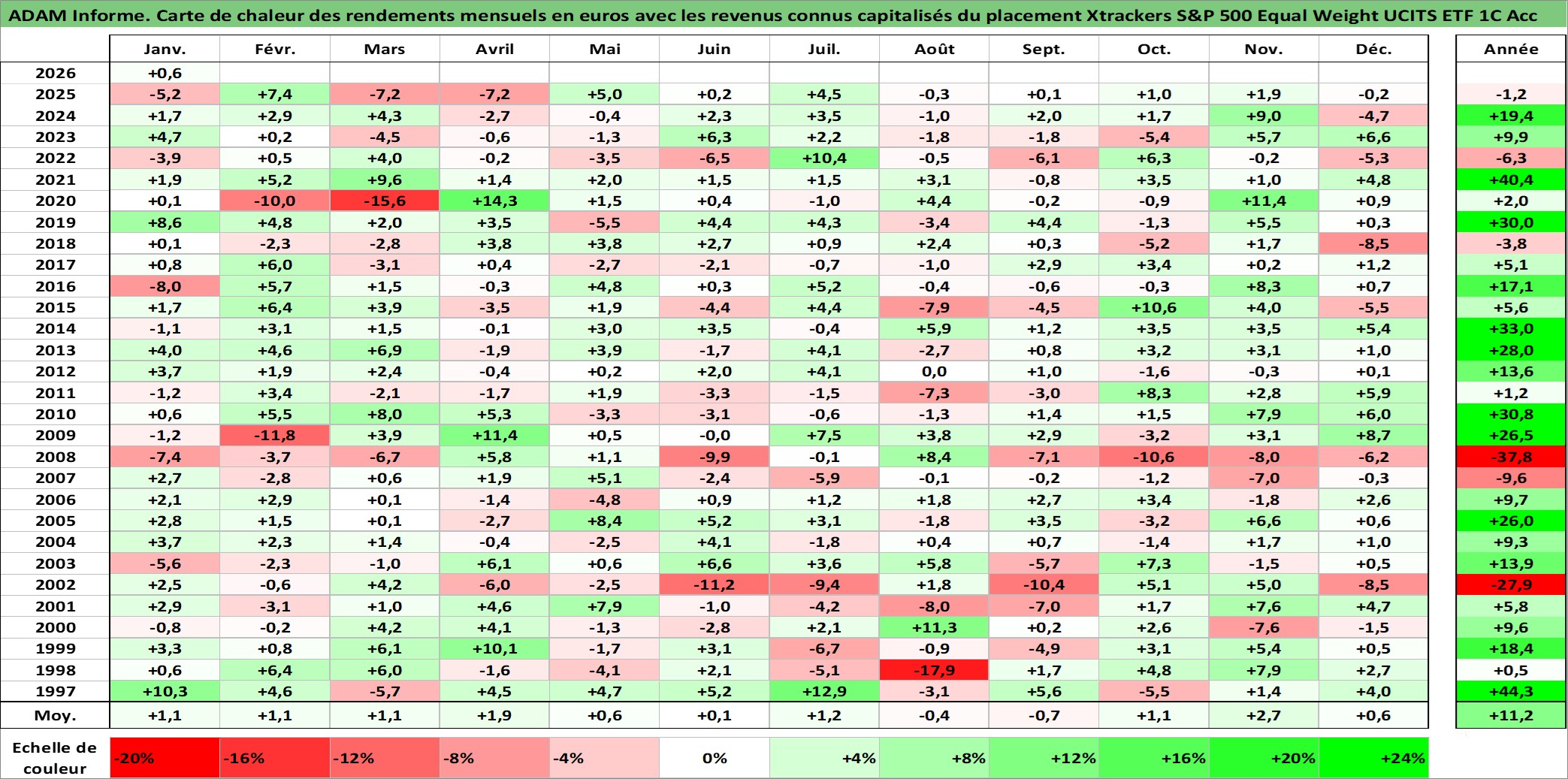 Site dédié aux investisseursPage dédiée sur site financeAnalyse des valorisations hebdomadaires du fonds Xtrackers S&P 500 Equal Weight UCITS ETF 1C Acc. Cet actif est cote en USD. Les valorisations sont en contrevaleur EURO et couvrent les semaines 1997W01 a 2026W05. Les revenus de cet actif financier sont pris en compte depuis la semaine 1997W01. La note ESG de cet actif n'est pas connue.