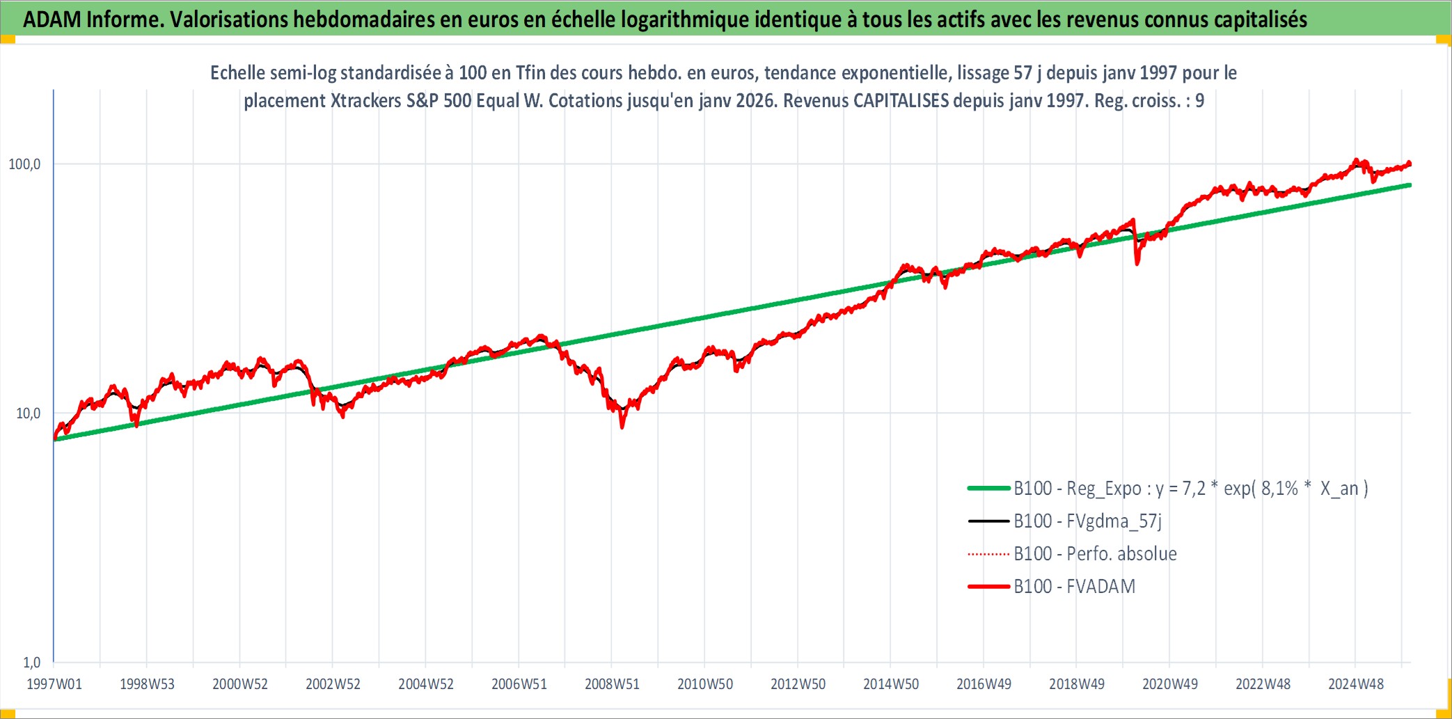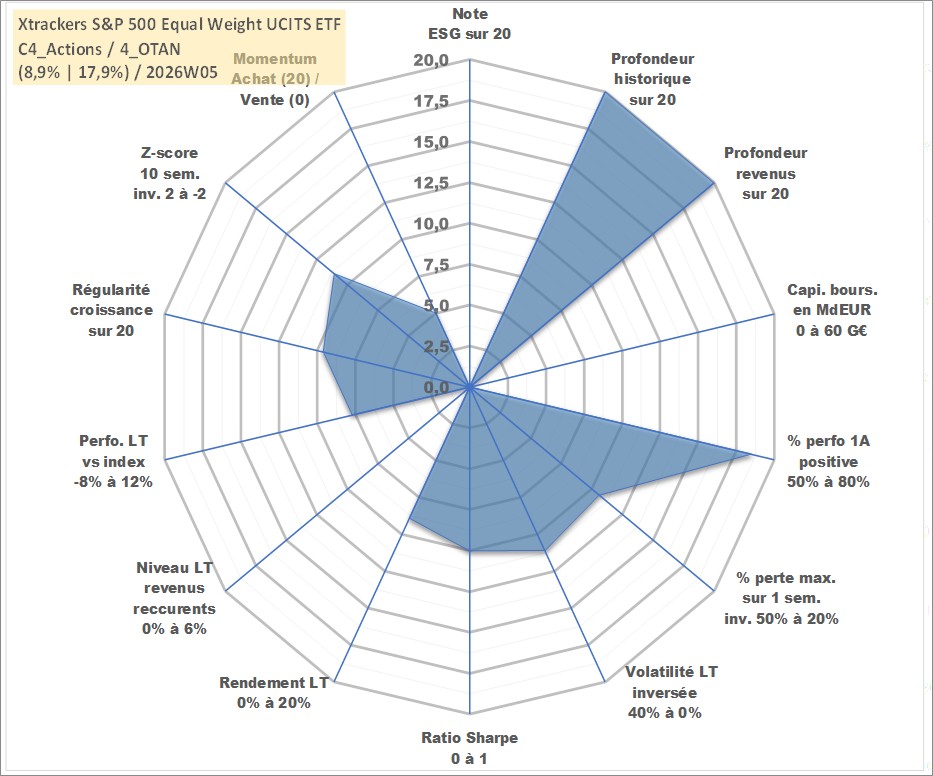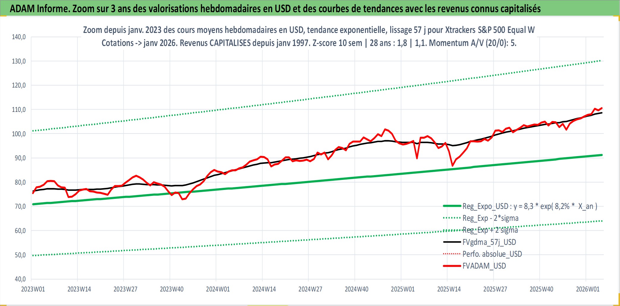 Site dédié aux investisseursPage dédiée sur site financeAnalyse des valorisations hebdomadaires du fonds Xtrackers S&P 500 Equal Weight UCITS ETF 1C Acc. Cet actif est cote en USD. Les valorisations sont en contrevaleur EURO et couvrent les semaines 1997W01 a 2026W05. Les revenus de cet actif financier sont pris en compte depuis la semaine 1997W01. La note ESG de cet actif n'est pas connue.
